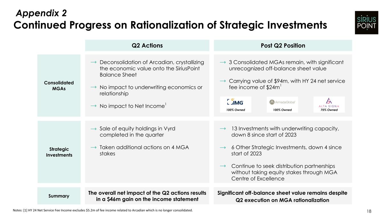 Continued Progress on Rationalization of Strategic Investments Q2 Actions Post Q2 Position Deconsolidation of Arcadian, crystallizing the economic value onto the SiriusPoint Balance Sheet No impact to underwriting economics or relationship No impact to Net Income1 Consolidated MGAs 18 Strategic Investments Sale of equity holdings in Vyrd completed in the quarter Taken additional actions on 4 MGA stakes 3 Consolidated MGAs remain, with significant unrecognized off-balance sheet value Carrying value of $94m, with HY 24 net service fee income of $24m1 13 Investments with underwriting capacity, down 8 since start of 2023 6 Other Strategic Investments, down 4 since start of 2023 Continue to seek distribution partnerships without taking equity stakes through MGA Centre of Excellence 100% Owned 100% Owned Note if deleted - slide 9&10 refers to this 75% Owned Notes: [1] HY 24 Net Service Fee Income excludes $5.2m of fee income related to Arcadian which is no longer consolidated. Summary The overall net impact of the Q2 actions results in a $46m gain on the income statement Significant off-balance sheet value remains despite Q2 execution on MGA rationalization Appendix 2
