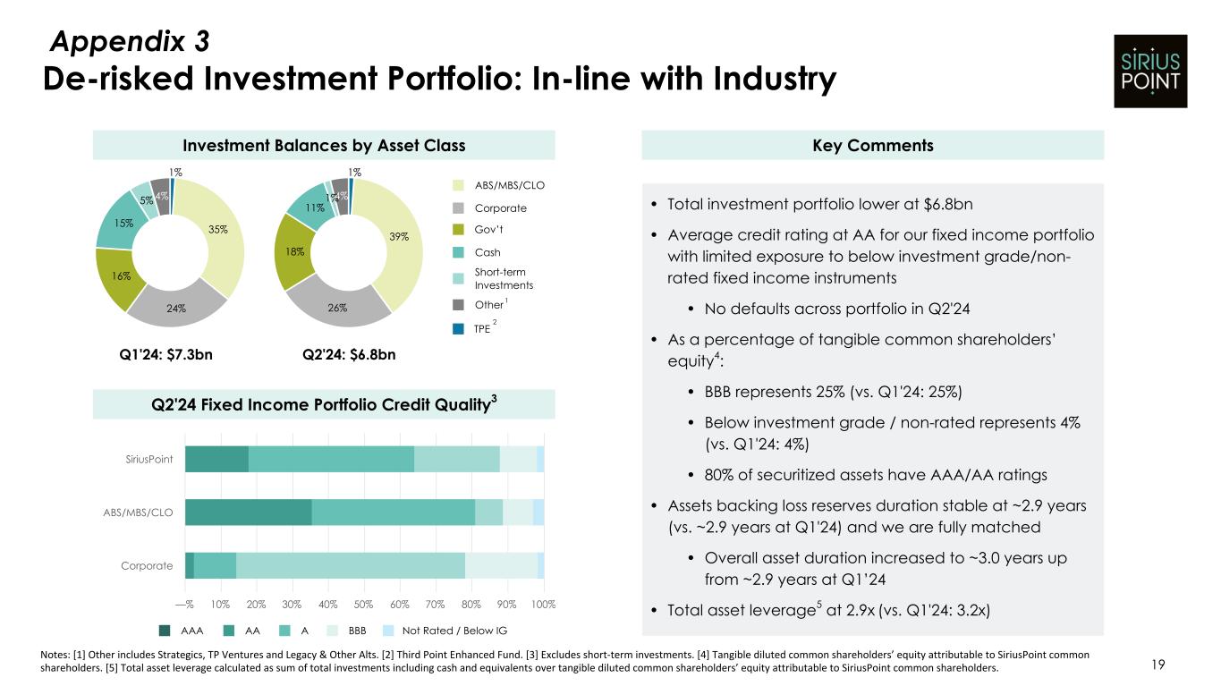 1% 39% 26% 18% 11% 1%4% TPE Short-term Investments De-risked Investment Portfolio: In-line with Industry 19 Q2'24: $6.8bn Notes: [1] Other includes Strategics, TP Ventures and Legacy & Other Alts. [2] Third Point Enhanced Fund. [3] Excludes short-term investments. [4] Tangible diluted common shareholders’ equity attributable to SiriusPoint common shareholders. [5] Total asset leverage calculated as sum of total investments including cash and equivalents over tangible diluted common shareholders’ equity attributable to SiriusPoint common shareholders. Q1'24: $7.3bn 1 2 AAA AA A BBB Not Rated / Below IG Gov’t ABS/MBS/CLO Cash Corporate Other SiriusPoint ABS/MBS/CLO Corporate —% 10% 20% 30% 40% 50% 60% 70% 80% 90% 100% Q2'24 Fixed Income Portfolio Credit Quality3 Key Comments • Total investment portfolio lower at $6.8bn • Average credit rating at AA for our fixed income portfolio with limited exposure to below investment grade/non- rated fixed income instruments • No defaults across portfolio in Q2'24 • As a percentage of tangible common shareholders’ equity4: • BBB represents 25% (vs. Q1'24: 25%) • Below investment grade / non-rated represents 4% (vs. Q1'24: 4%) • 80% of securitized assets have AAA/AA ratings • Assets backing loss reserves duration stable at ~2.9 years (vs. ~2.9 years at Q1'24) and we are fully matched • Overall asset duration increased to ~3.0 years up from ~2.9 years at Q1’24 • Total asset leverage5 at 2.9x (vs. Q1'24: 3.2x) Investment Balances by Asset Class 1% 35% 24% 16% 15% 5% 4% Appendix 3