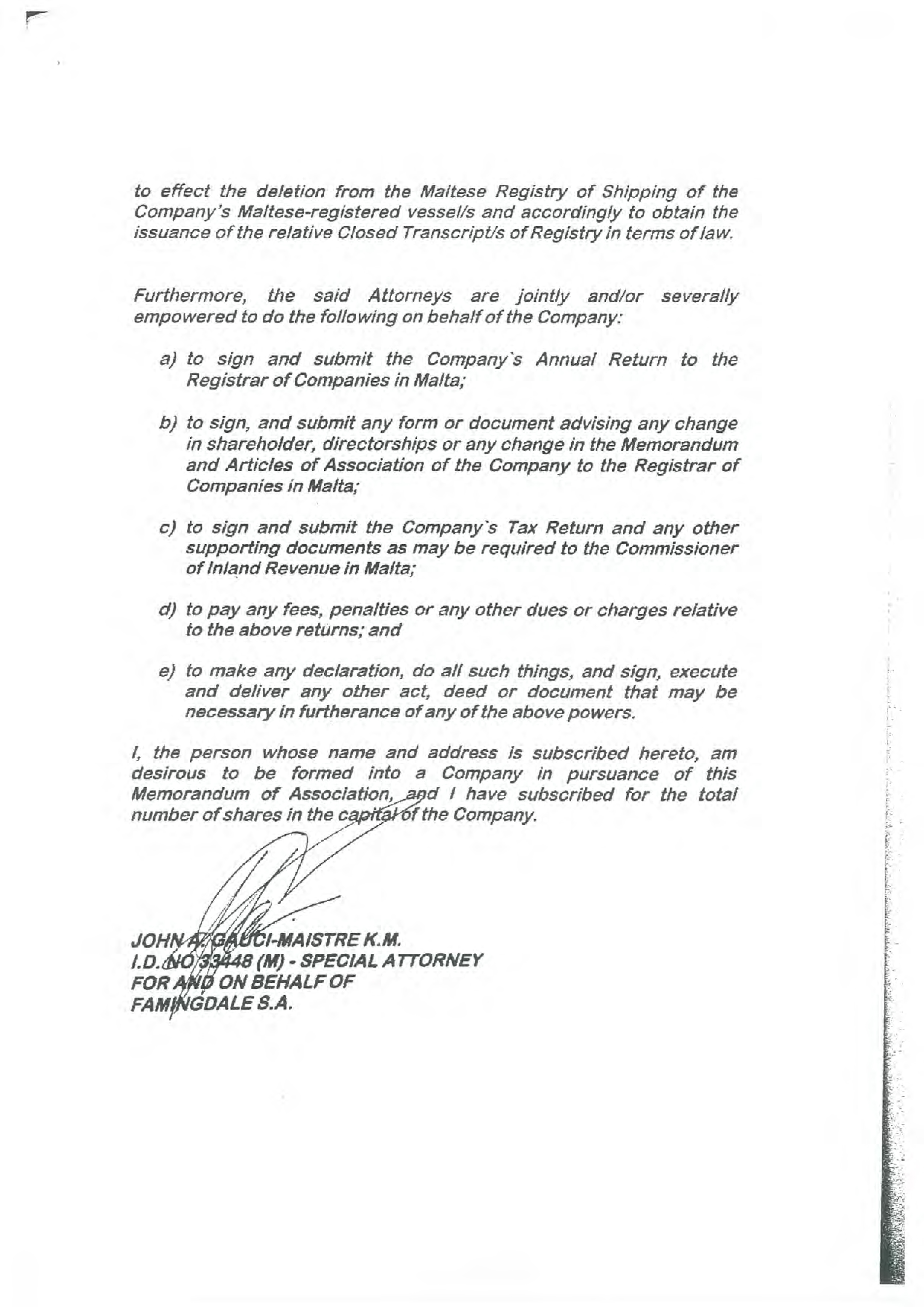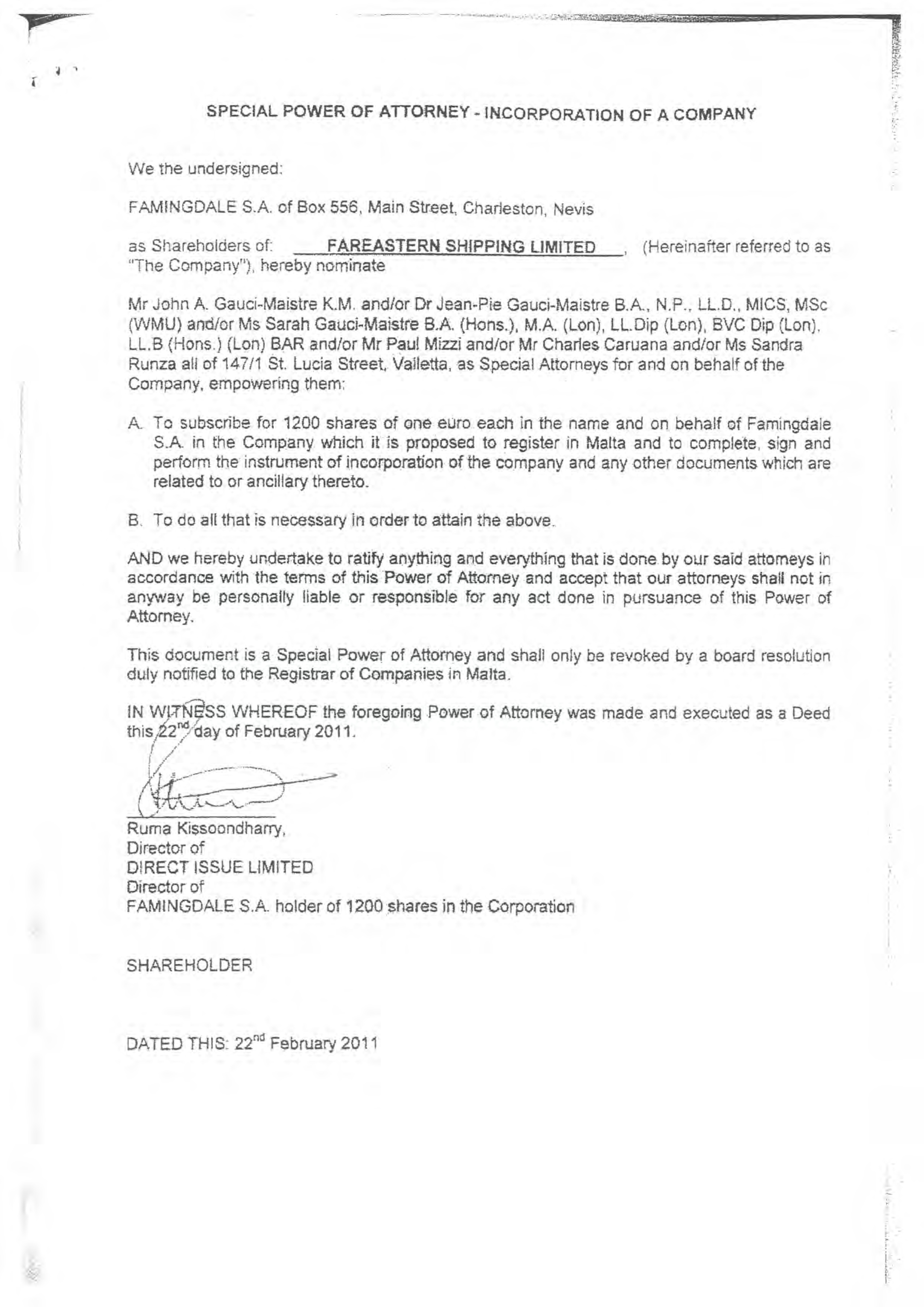 | Title: | President, Secretary, Treasurer and Sole Director of Fareastern Shipping Limited | ||