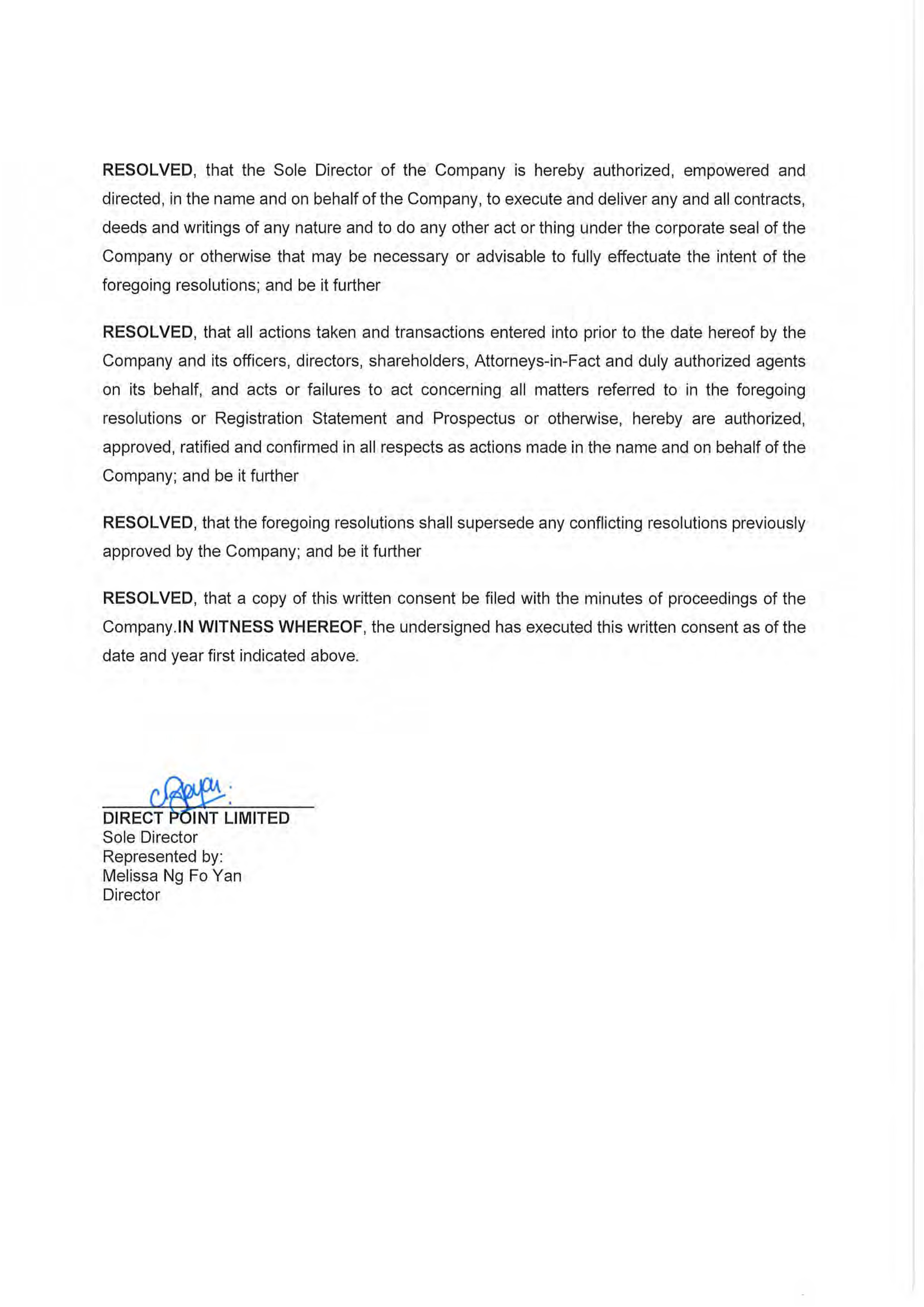 | /s/ Melissa Ng Fo Yan | Director of Direct Point Limited, President, Secretary, Treasurer and Sole Director of Fareastern Shipping Limited (Principal Executive Officer, Principal Financial Officer and Principal Accounting Officer) | |