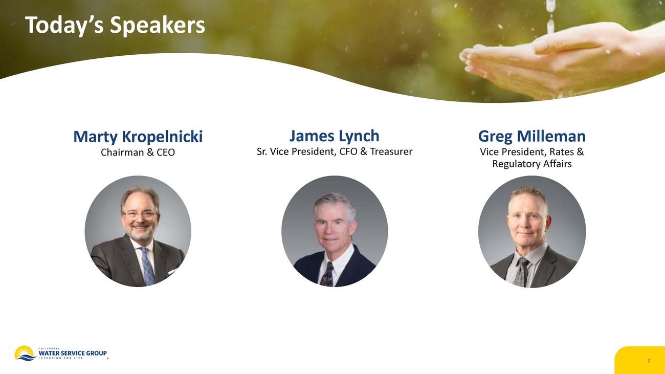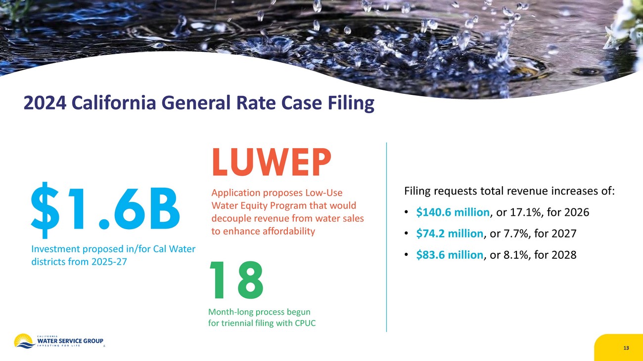 | · | Filing of the 2024 General Rate Case (GRC) and Infrastructure Improvement Plans for 2025-2027 with the California Public Utilities Commission (CPUC). The application also proposes a Low-Use Water Equity Program, which would decouple revenue from water sales, to assist low-water-using, lower-income customers. |