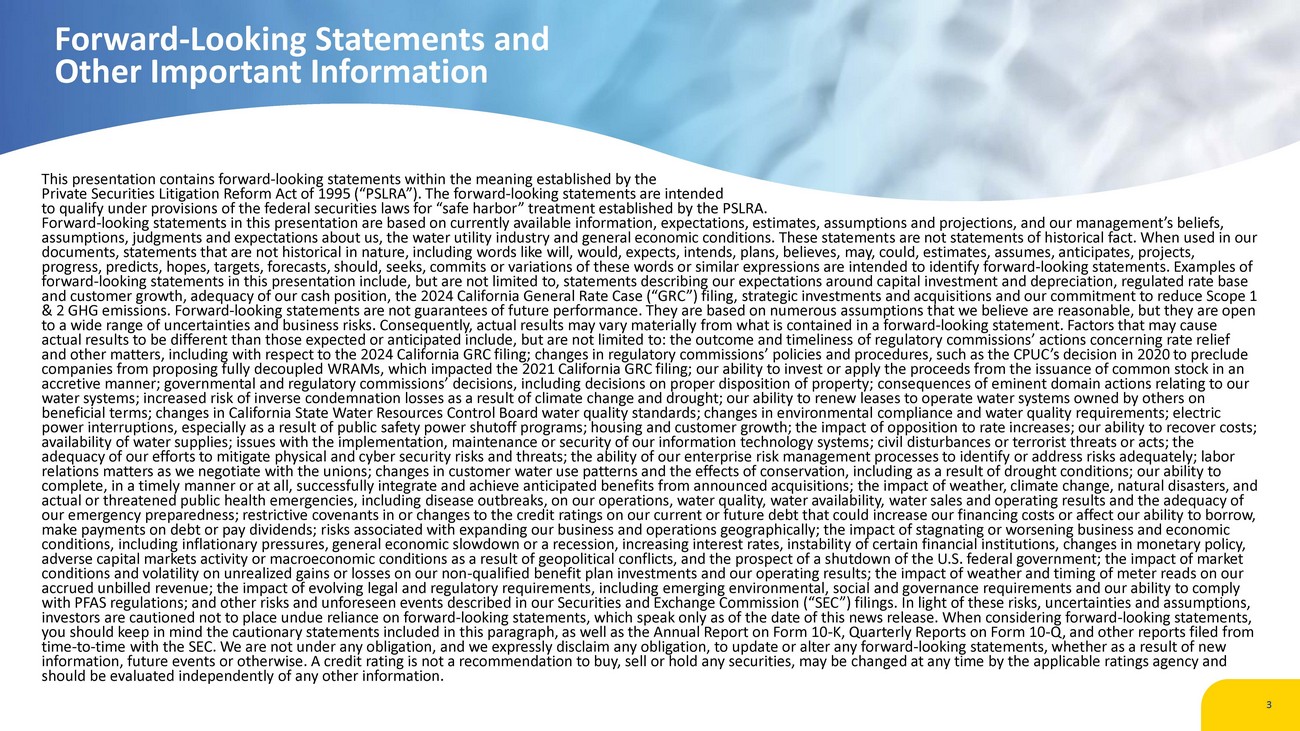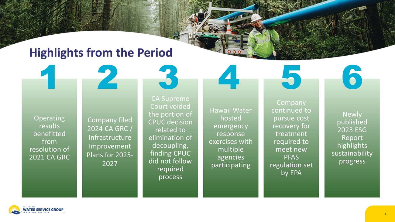 3 This presentation contains forward - looking statements within the meaning established by the Private Securities Litigation Reform Act of 1995 (“ PSLRA ”). The forward - looking statements are intended to qualify under provisions of the federal securities laws for “safe harbor” treatment established by the PSLRA . Forward - looking statements in this presentation are based on currently available information, expectations, estimates, assumptio ns and projections, and our management’s beliefs, assumptions, judgments and expectations about us, the water utility industry and general economic conditions. These statement s a re not statements of historical fact. When used in our documents, statements that are not historical in nature, including words like will, would, expects, intends, plans, believes, ma y, could, estimates, assumes, anticipates, projects, progress, predicts, hopes, targets, forecasts, should, seeks, commits or variations of these words or similar expressions are in tended to identify forward - looking statements. Examples of forward - looking statements in this presentation include, but are not limited to, statements describing our expectations around c apital investment and depreciation, regulated rate base and customer growth, adequacy of our cash position, the 2024 California General Rate Case (“ GRC ”) filing, strategic investments and acquisitions and our commitment to reduce Scope 1 & 2 GHG emissions. Forward - looking statements are not guarantees of future performance. They are based on numerous assumptions t hat we believe are reasonable, but they are open to a wide range of uncertainties and business risks. Consequently, actual results may vary materially from what is contained in a forward - looking statement. Factors that may cause actual results to be different than those expected or anticipated include, but are not limited to: the outcome and timeliness of regulatory commissions’ actions concerning rate relief and other matters, including with respect to the 2024 California GRC filing; changes in regulatory commissions’ policies and procedures, such as the CPUC’s decision in 2020 to preclude companies from proposing fully decoupled WRAMs , which impacted the 2021 California GRC filing; our ability to invest or apply the proceeds from the issuance of common stock in an accretive manner; governmental and regulatory commissions’ decisions, including decisions on proper disposition of property; con sequences of eminent domain actions relating to our water systems; increased risk of inverse condemnation losses as a result of climate change and drought; our ability to renew lea ses to operate water systems owned by others on beneficial terms; changes in California State Water Resources Control Board water quality standards; changes in environmental co mpliance and water quality requirements; electric power interruptions, especially as a result of public safety power shutoff programs; housing and customer growth; the impact of opposition to rate increases; our ability to recover costs; availability of water supplies; issues with the implementation, maintenance or security of our information technology systems ; c ivil disturbances or terrorist threats or acts; the adequacy of our efforts to mitigate physical and cyber security risks and threats; the ability of our enterprise risk managem ent processes to identify or address risks adequately; labor relations matters as we negotiate with the unions; changes in customer water use patterns and the effects of conservation, in clu ding as a result of drought conditions; our ability to complete, in a timely manner or at all, successfully integrate and achieve anticipated benefits from announced acquisitions; the impact of weather, climate change, natural disasters, and actual or threatened public health emergencies, including disease outbreaks, on our operations, water quality, water availabi lit y, water sales and operating results and the adequacy of our emergency preparedness; restrictive covenants in or changes to the credit ratings on our current or future debt that coul d i ncrease our financing costs or affect our ability to borrow, make payments on debt or pay dividends; risks associated with expanding our business and operations geographically; the impac t o f stagnating or worsening business and economic conditions, including inflationary pressures, general economic slowdown or a recession, increasing interest rates, instabilit y o f certain financial institutions, changes in monetary policy, adverse capital markets activity or macroeconomic conditions as a result of geopolitical conflicts, and the prospect of a shu tdo wn of the U.S. federal government; the impact of market conditions and volatility on unrealized gains or losses on our non - qualified benefit plan investments and our operating results; the impact of weather and timing of meter reads on our accrued unbilled revenue; the impact of evolving legal and regulatory requirements, including emerging environmental, social and governance requirements and our ability to comply with PFAS regulations; and other risks and unforeseen events described in our Securities and Exchange Commission (“SEC”) fili ngs . In light of these risks, uncertainties and assumptions, investors are cautioned not to place undue reliance on forward - looking statements, which speak only as of the date of this news release. When considering forward - looking statements, you should keep in mind the cautionary statements included in this paragraph, as well as the Annual Report on Form 10 - K, Quarter ly Reports on Form 10 - Q, and other reports filed from time - to - time with the SEC. We are not under any obligation, and we expressly disclaim any obligation, to update or alter any for ward - looking statements, whether as a result of new information, future events or otherwise. A credit rating is not a recommendation to buy, sell or hold any securities, may b