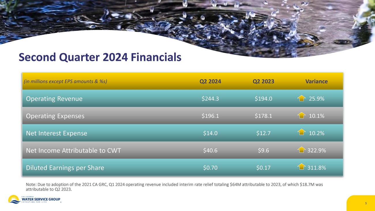 4 Highlights from the Period Operating results benefitted from resolution of 2021 CA GRC Company filed 2024 CA GRC / Infrastructure Improvement Plans for 2025 - 2027 CA Supreme Court voided the portion of CPUC decision related to elimination of decoupling, finding CPUC did not follow required process Hawaii Water hosted emergency response exercises with multiple agencies participating Company continued to pursue cost recovery for treatment required to meet new PFAS regulation set by EPA Newly published 2023 ESG Report highlights sustainability progress 1 2 3 4 5 6