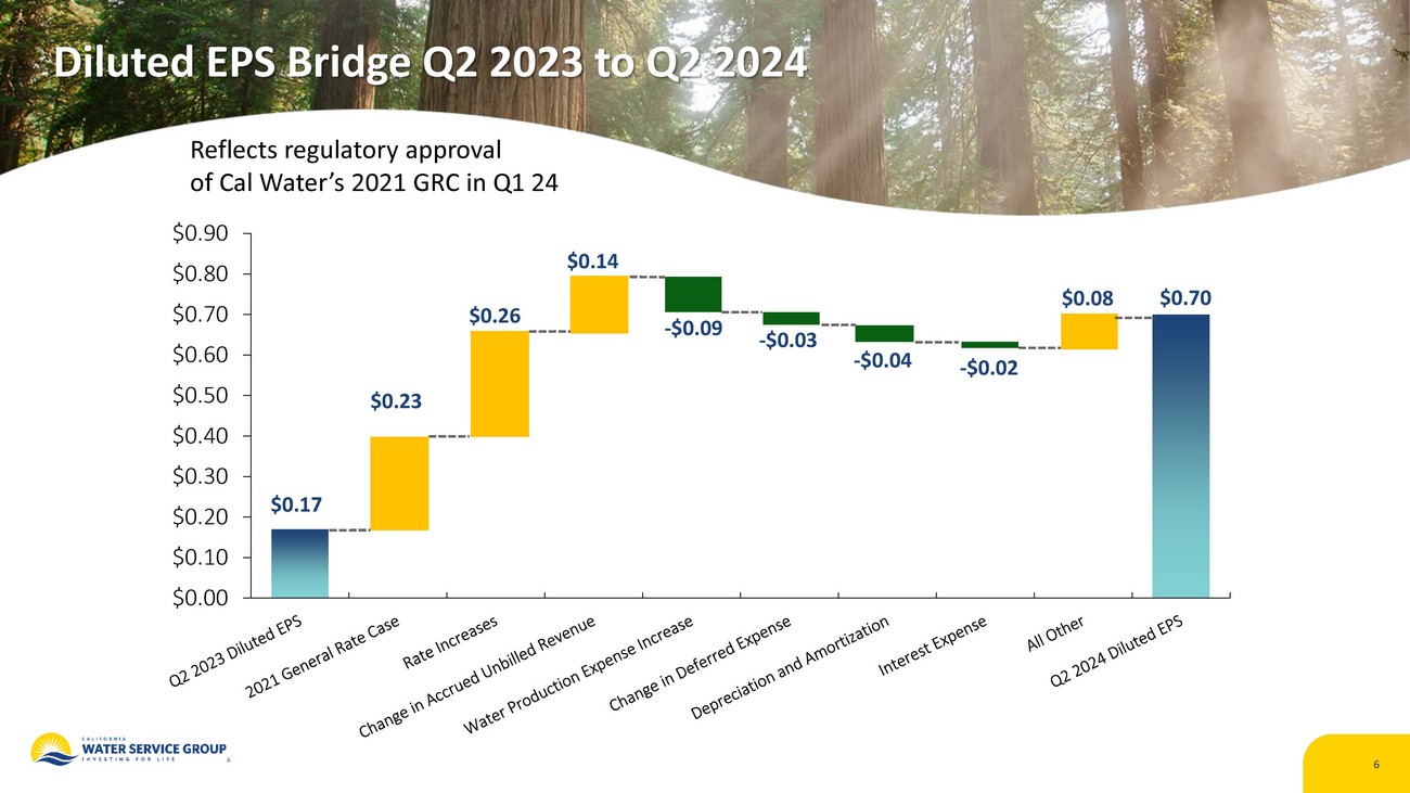 5 Second Quarter 2024 Financials (in millions except EPS amounts & % s) Q2 2024 Q2 2023 Variance Operating Revenue $244.3 $194.0 25.9% Operating Expenses $196.1 $178.1 10.1% Net Interest Expense $14.0 $12.7 10.2% Net Income Attributable to CWT $40.6 $9.6 322.9% Diluted Earnings per Share $0.70 $0.17 311.8% Note: Due to adoption of the 2021 CA GRC , Q1 2024 operating revenue included interim rate relief totaling $ 64M attributable to 2023, of which $ 18.7M was attributable to Q2 2023.