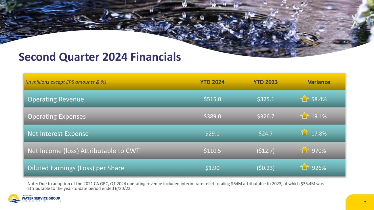Diluted EPS Bridge Q2 2023 to Q2 2024 Reflects regulatory approval of Cal Water’s 2021 GRC in Q1 24 6 $0.00 $0.10 $0.20 $0.30 $0.40 $0.50 $0.60 $0.70 $0.80 $0.90 - $0.04 - $0.02 $0.17 - $0.09 $0.08 $0.26 $ 0.23 $0.14 - $0.03 $0.70