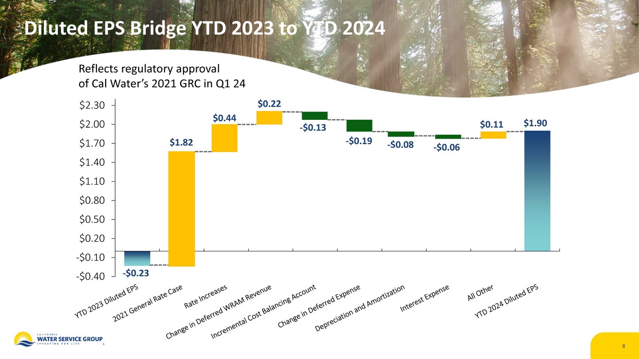 7 Second Quarter 2024 Financials 7 (in millions except EPS amounts & % ) YTD 2024 YTD 2023 Variance Operating Revenue $515.0 $325.1 58.4% Operating Expenses $389.0 $326.7 19.1% Net Interest Expense $29.1 $24.7 17.8% Net Income (loss) Attributable to CWT $110.5 ($12.7) 970% Diluted Earnings (Loss) per Share $1.90 ($0.23) 926% Note: Due to adoption of the 2021 CA GRC , Q1 2024 operating revenue included interim rate relief totaling $ 64M attributable to 2023, of which $ 35.4M was attributable to the year - to - date period ended 6/30/23.