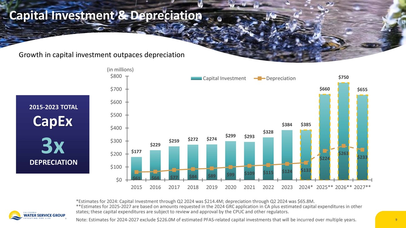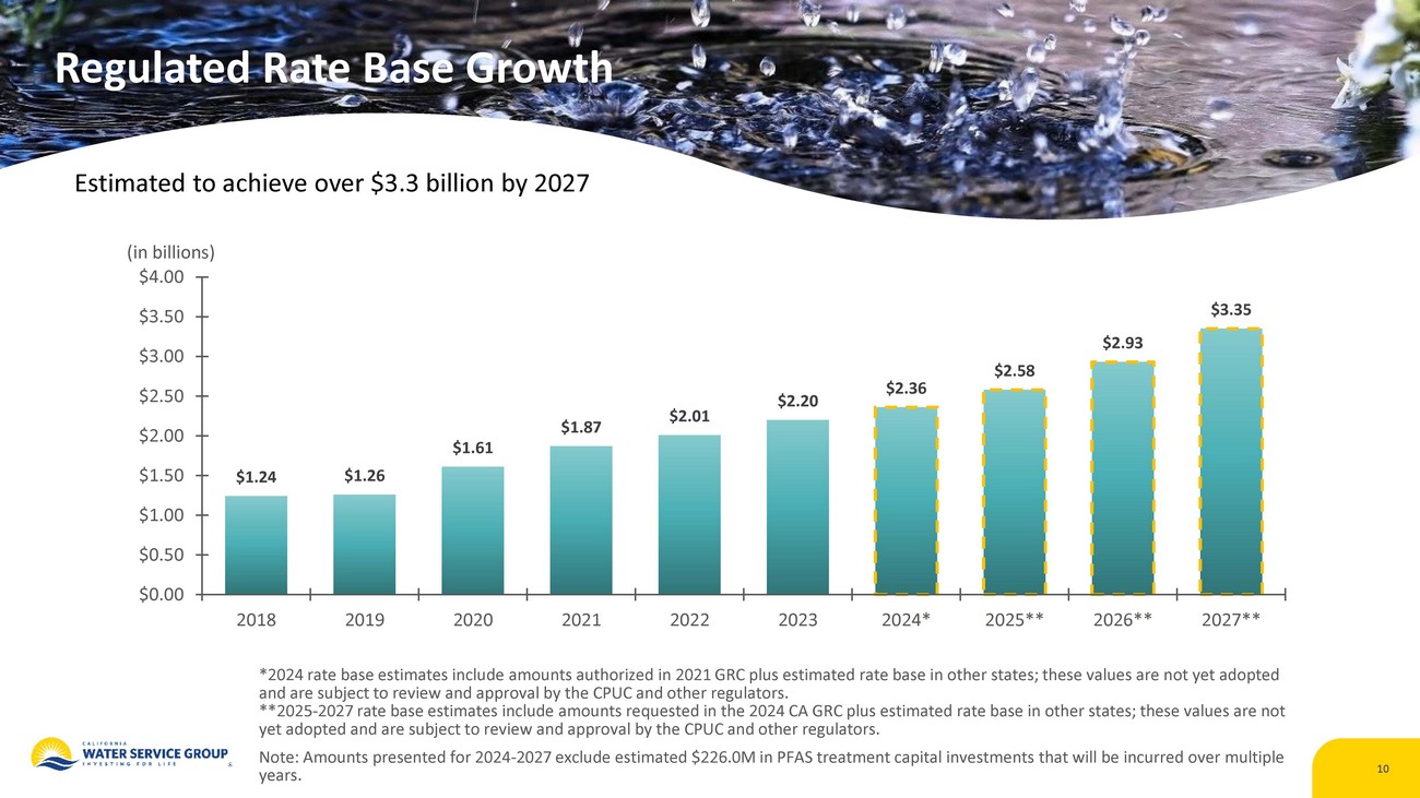 9 Capital Investment & Depreciation Growth in capital investment outpaces depreciation 2015 - 2023 TOTAL CapEx 3x DEPRECIATION $177 $229 $259 $272 $274 $299 $293 $328 $384 $385 $660 $750 $655 $61 $64 $77 $84 $89 $99 $109 $115 $124 $133 $224 $263 $233 $0 $100 $200 $300 $400 $500 $600 $700 $800 2015 2016 2017 2018 2019 2020 2021 2022 2023 2024* 2025** 2026** 2027** Capital Investment Depreciation (in millions) *Estimates for 2024: Capital Investment through Q2 2024 was $ 214.4M ; depreciation through Q2 2024 was $ 65.8M . **Estimates for 2025 - 2027 are based on amounts requested in the 2024 GRC application in CA plus estimated capital expenditures in other states; these capital expenditures are subject to review and approval by the CPUC and other regulators. Note: Estimates for 2024 - 2027 exclude $ 226.0M of estimated PFAS - related capital investments that will be incurred over multiple years.