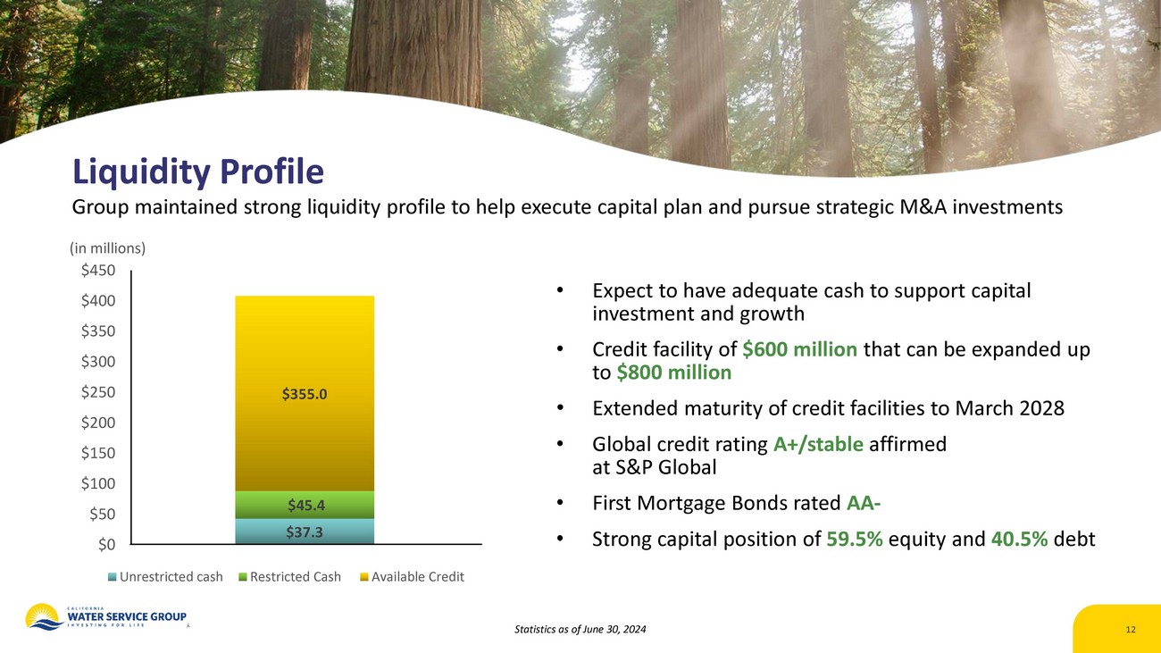 Capital Allocation | Balance Sheet Continued to maintain financial discipline with strong balance sheet, while allocating capital in efficient manner Maintained Board - authorized equity ATM program and used opportunistically to raise incremental funds to support capital growth and investments in the business 11 Strong capital structure of 59.5% equity and 40.5% debt supportive of future capital growth S&P affirmed a global credit rating of A+ Stable for California Water Service Statistics as of June 30, 2024, except dividend data Declared 318 th consecutive quarterly dividend of $0.28 per share
