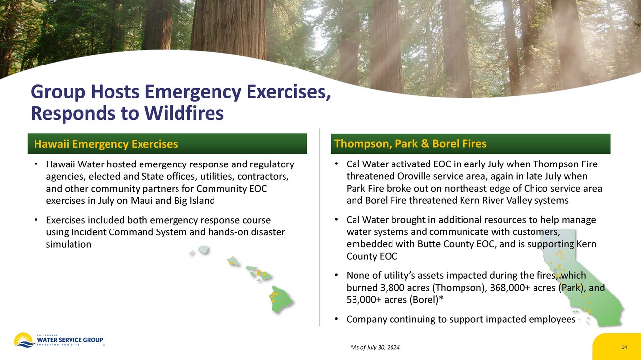 To enhance coordination during emergencies, the Company’s Hawaii subsidiary, Hawaii Water Service (Hawaii Water), hosted representatives from emergency response and regulatory agencies, elected and State offices, utilities, contractors, and other community partners for Community Emergency Operations Center (EOC) exercises in early July on both Maui and the Big Island.