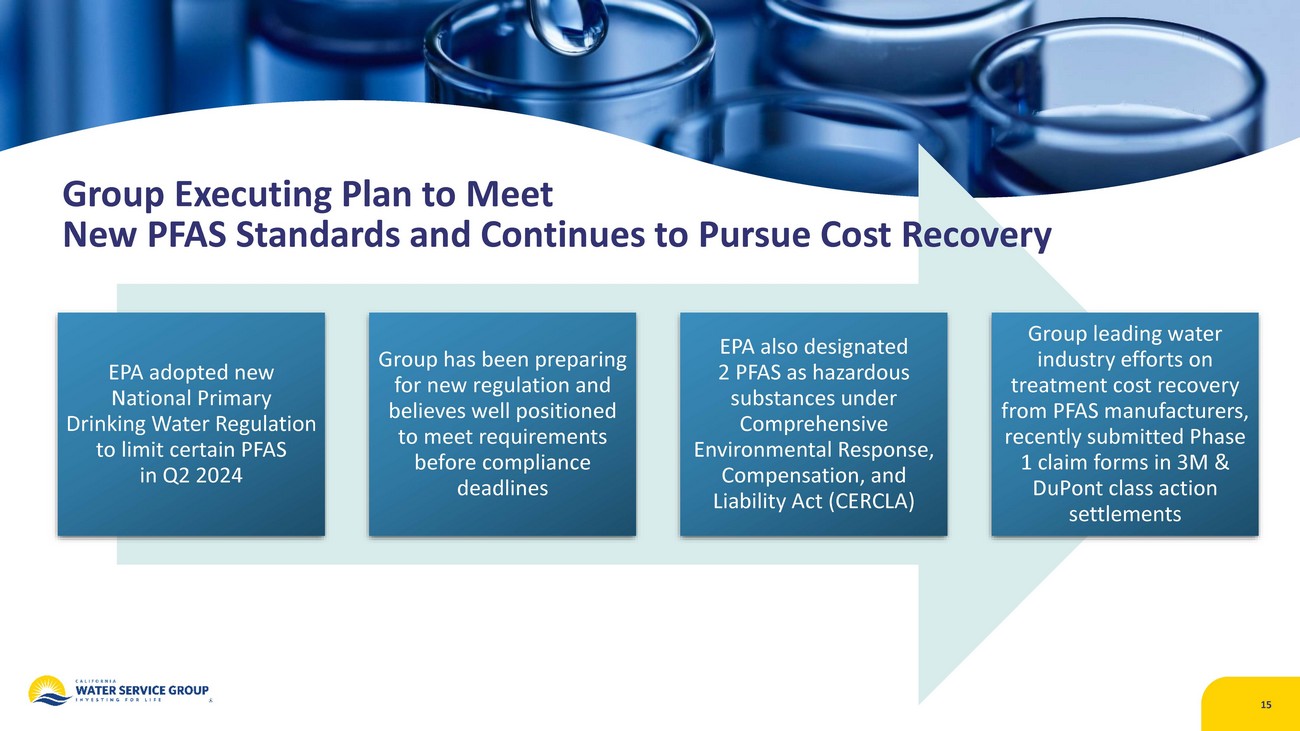 Group Hosts Emergency Exercises, Responds to Wildfires Hawaii Emergency Exercises • Hawaii Water hosted emergency response and regulatory agencies, elected and State offices, utilities, contractors, and other community partners for Community EOC exercises in July on Maui and Big Island • Exercises included both emergency response course using Incident Command System and hands - on disaster simulation 14 Thompson, Park & Borel Fires • Cal Water activated EOC in early July when Thompson Fire threatened Oroville service area, again in late July when Park Fire broke out on northeast edge of Chico service area and Borel Fire threatened Kern River Valley systems • Cal Water brought in additional resources to help manage water systems and communicate with customers, embedded with Butte County EOC , and is supporting Kern County EOC • None of utility’s assets impacted during the fires, which burned 3,800 acres (Thompson), 368,000+ acres (Park), and 53,000+ acres (Borel)* • Company continuing to support impacted employees *As of July 30, 2024