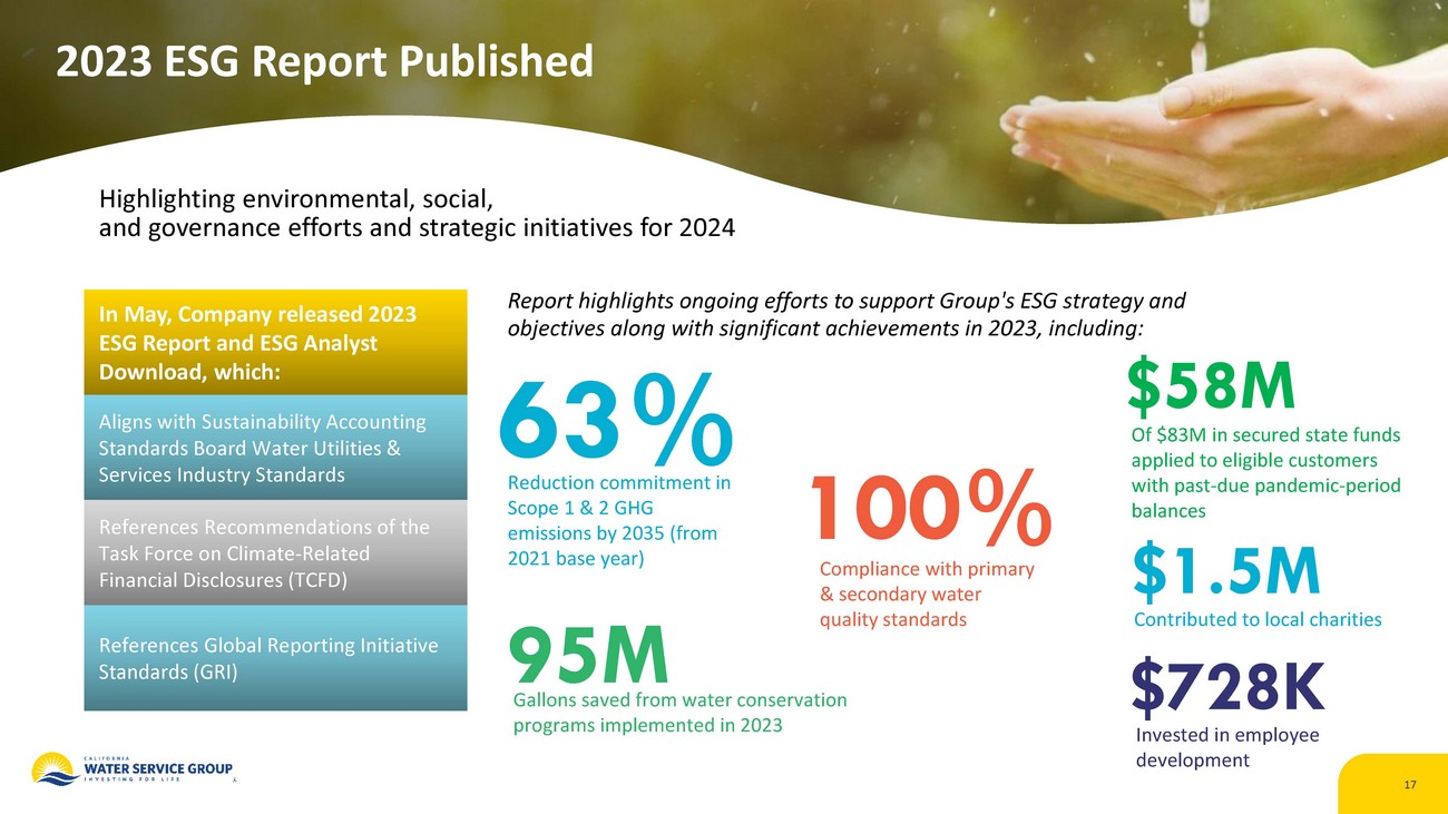 In May, Company released 2023 ESG Report and ESG Analyst Download, which: Aligns with Sustainability Accounting Standards Board Water Utilities & Services Industry Standards References Recommendations of the Task Force on Climate - Related Financial Disclosures ( TCFD ) References Global Reporting Initiative Standards ( GRI ) 2023 ESG Report Published Highlighting environmental, social, and governance efforts and strategic initiatives for 2024 17 Report highlights ongoing efforts to support Group's ESG strategy and objectives along with significant achievements in 2023, including: Invested in employee development $ 728K Contributed to local charities $ 1.5M Of $ 83M in secured state funds applied to eligible customers with past - due pandemic - period balances $ 58M Compliance with primary & secondary water quality standards 100% Gallons saved from water conservation programs implemented in 2023 95M Reduction commitment in Scope 1 & 2 GHG emissions by 2035 (from 2021 base year) 63%