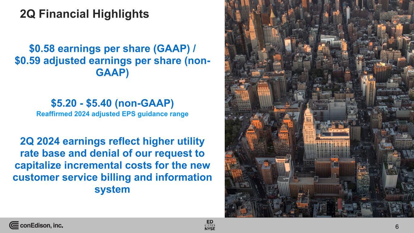 EPS (GAAP Basis) Adjusted EPS (non- GAAP Basis) New steam rate plan effective November 2023 $0.16 $0.16 CECONY(a) Higher electric rate base 0.09 0.09 Higher gas rate base 0.08 0.08 Change in incentives earned under the electric and gas earnings adjustment mechanisms 0.01 0.01 Impact of the NYSPSC order denying an April 2023 petition by CECONY that requested permission to capitalize costs to implement its new customer billing and information system (0.11) (0.11) Accretive effect of share repurchase 0.04 0.04 Other 0.01 0.01 Total CECONY $0.28 $0.28 Electric base rate increase 0.02 0.02 O&R(a)Gas base rate increase 0.01 0.01 Total O&R $0.01 $0.01 a. Under the revenue decoupling mechanisms in the Utilities’ New York electric and gas rate plans and the weather- normalization clause applicable to their gas businesses, revenues are generally not affected by changes in delivery volumes from levels assumed when rates were approved. Effective November 1, 2023, revenues from CECONY’s steam sales are also subject to a weather normalization clause, as a result of which, delivery revenues reflect normal weather conditions during the heating season. In general, the Utilities recover on a current basis the fuel, gas purchased for resale and purchased power costs they incur in supplying energy to their full-service customers. Accordingly, such costs do not generally affect Con Edison’s results of operations. YTD 2024 vs. YTD 2023 EPS and Adjusted EPS (non- GAAP) Variances – Six Months Ended Variation 23