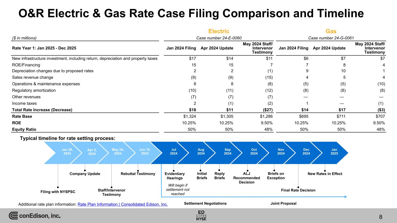 Additional rate plan information: Rate Plan Information | Consolidated Edison, Inc. Typical timeline for rate setting process: Jan 26, 2024 Apr 5, 2024 May 24, 2024 Jun 10, 2024 Jul 2024 Aug 2024 Sep 2024 Oct 2024 Nov 2024 Dec 2024 Jan 2025 Filing with NYSPSC Company Update Staff/Intervenor Testimony Rebuttal Testimony Evidentiary Hearings Final Rate Decision New Rates in EffectInitial Briefs Reply Briefs ALJ Recommended Decision Briefs on Exception Settlement Negotiations Joint Proposal O&R Electric & Gas Rate Case Filing Comparison and Timeline 8 Electric Gas ($ in millions) Case number 24-E-0060 Case number 24-G-0061 Rate Year 1: Jan 2025 - Dec 2025 Jan 2024 Filing Apr 2024 Update May 2024 Staff/ Intervenor Testimony Jan 2024 Filing Apr 2024 Update May 2024 Staff/ Intervenor Testimony New infrastructure investment, including return, depreciation and property taxes $17 $14 $11 $6 $7 $7 ROE/Financing 15 15 7 7 8 4 Depreciation changes due to proposed rates 2 2 (1) 9 10 1 Sales revenue change (9) (9) (15) 4 5 4 Operations & maintenance expenses 8 8 (8) (5) (5) (10) Regulatory amortization (10) (11) (12) (8) (8) (8) Other revenues (7) (7) (7) — — — Income taxes 2 (1) (2) 1 — (1) Total Rate Increase (Decrease) $18 $11 ($27) $14 $17 ($3) Rate Base $1,324 $1,305 $1,286 $695 $711 $707 ROE 10.25% 10.25% 9.50% 10.25% 10.25% 9.50% Equity Ratio 50% 50% 48% 50% 50% 48% Will begin if settlement not reached