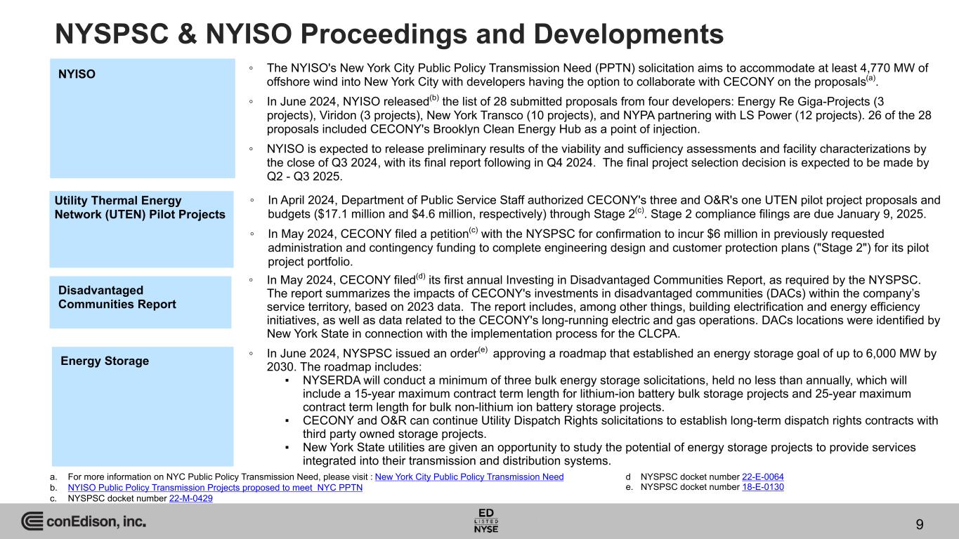 NYSPSC & NYISO Proceedings and Developments ◦ In April 2024, Department of Public Service Staff authorized CECONY's three and O&R's one UTEN pilot project proposals and budgets ($17.1 million and $4.6 million, respectively) through Stage 2(c). Stage 2 compliance filings are due January 9, 2025. ◦ In May 2024, CECONY filed a petition(c) with the NYSPSC for confirmation to incur $6 million in previously requested administration and contingency funding to complete engineering design and customer protection plans ("Stage 2") for its pilot project portfolio. ◦ In June 2024, NYSPSC issued an order(e) approving a roadmap that established an energy storage goal of up to 6,000 MW by 2030. The roadmap includes: ▪ NYSERDA will conduct a minimum of three bulk energy storage solicitations, held no less than annually, which will include a 15-year maximum contract term length for lithium-ion battery bulk storage projects and 25-year maximum contract term length for bulk non-lithium ion battery storage projects. ▪ CECONY and O&R can continue Utility Dispatch Rights solicitations to establish long-term dispatch rights contracts with third party owned storage projects. ▪ New York State utilities are given an opportunity to study the potential of energy storage projects to provide services integrated into their transmission and distribution systems. Energy Storage d NYSPSC docket number 22-E-0064 e. NYSPSC docket number 18-E-0130 9 a. For more information on NYC Public Policy Transmission Need, please visit : New York City Public Policy Transmission Need b. NYISO Public Policy Transmission Projects proposed to meet NYC PPTN c. NYSPSC docket number 22-M-0429 NYISO ◦ The NYISO's New York City Public Policy Transmission Need (PPTN) solicitation aims to accommodate at least 4,770 MW of offshore wind into New York City with developers having the option to collaborate with CECONY on the proposals(a). ◦ In June 2024, NYISO released(b) the list of 28 submitted proposals from four developers: Energy Re Giga-Projects (3 projects), Viridon (3 projects), New York Transco (10 projects), and NYPA partnering with LS Power (12 projects). 26 of the 28 proposals included CECONY's Brooklyn Clean Energy Hub as a point of injection. ◦ NYISO is expected to release preliminary results of the viability and sufficiency assessments and facility characterizations by the close of Q3 2024, with its final report following in Q4 2024. The final project selection decision is expected to be made by Q2 - Q3 2025. Utility Thermal Energy Network (UTEN) Pilot Projects Disadvantaged Communities Report ◦ In May 2024, CECONY filed(d) its first annual Investing in Disadvantaged Communities Report, as required by the NYSPSC. The report summarizes the impacts of CECONY's investments in disadvantaged communities (DACs) within the company’s service territory, based on 2023 data. The report includes, among other things, building electrification and energy efficiency initiatives, as well as data related to the CECONY's long-running electric and gas operations. DACs locations were identified by New York State in connection with the implementation process for the CLCPA.