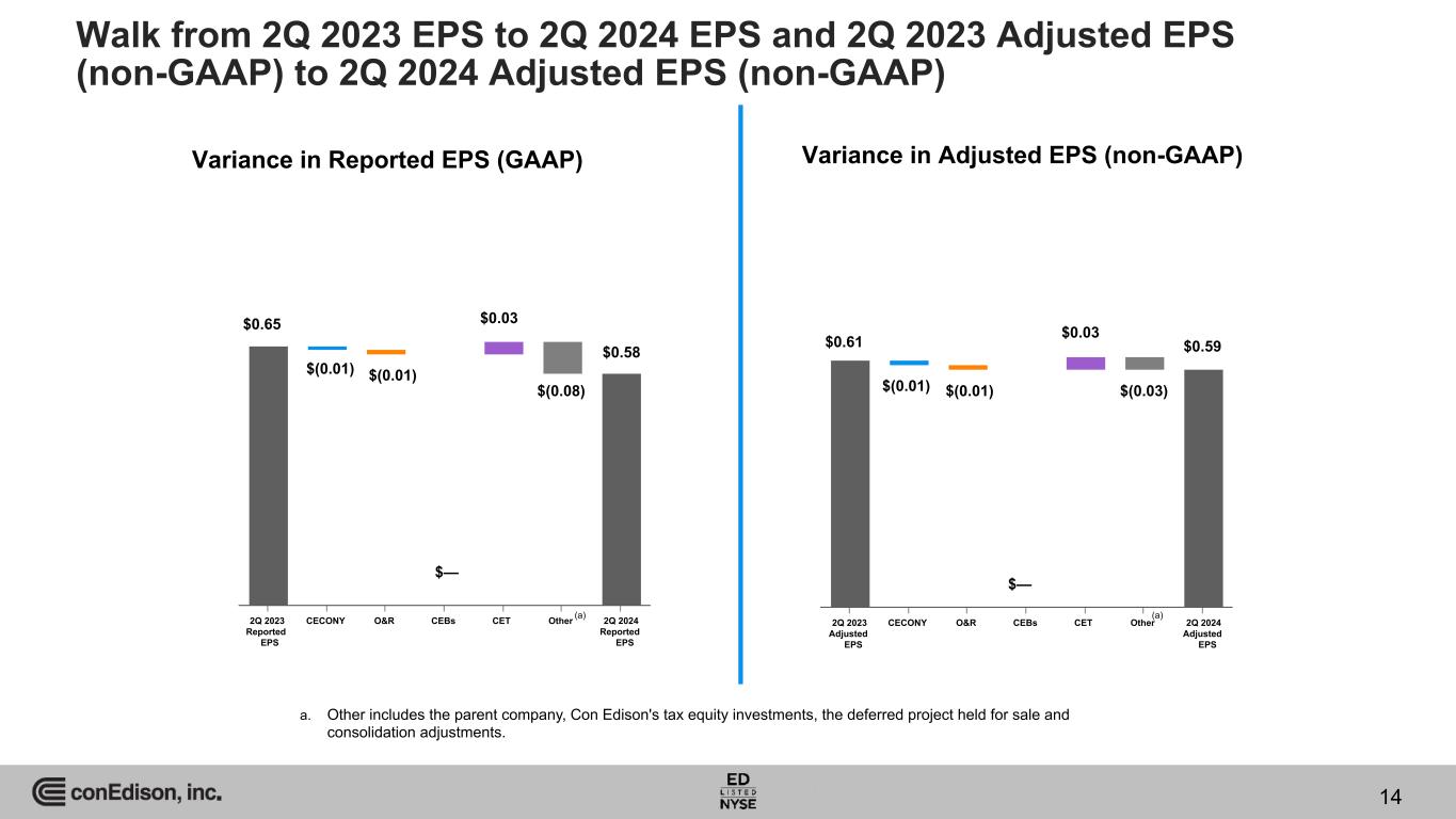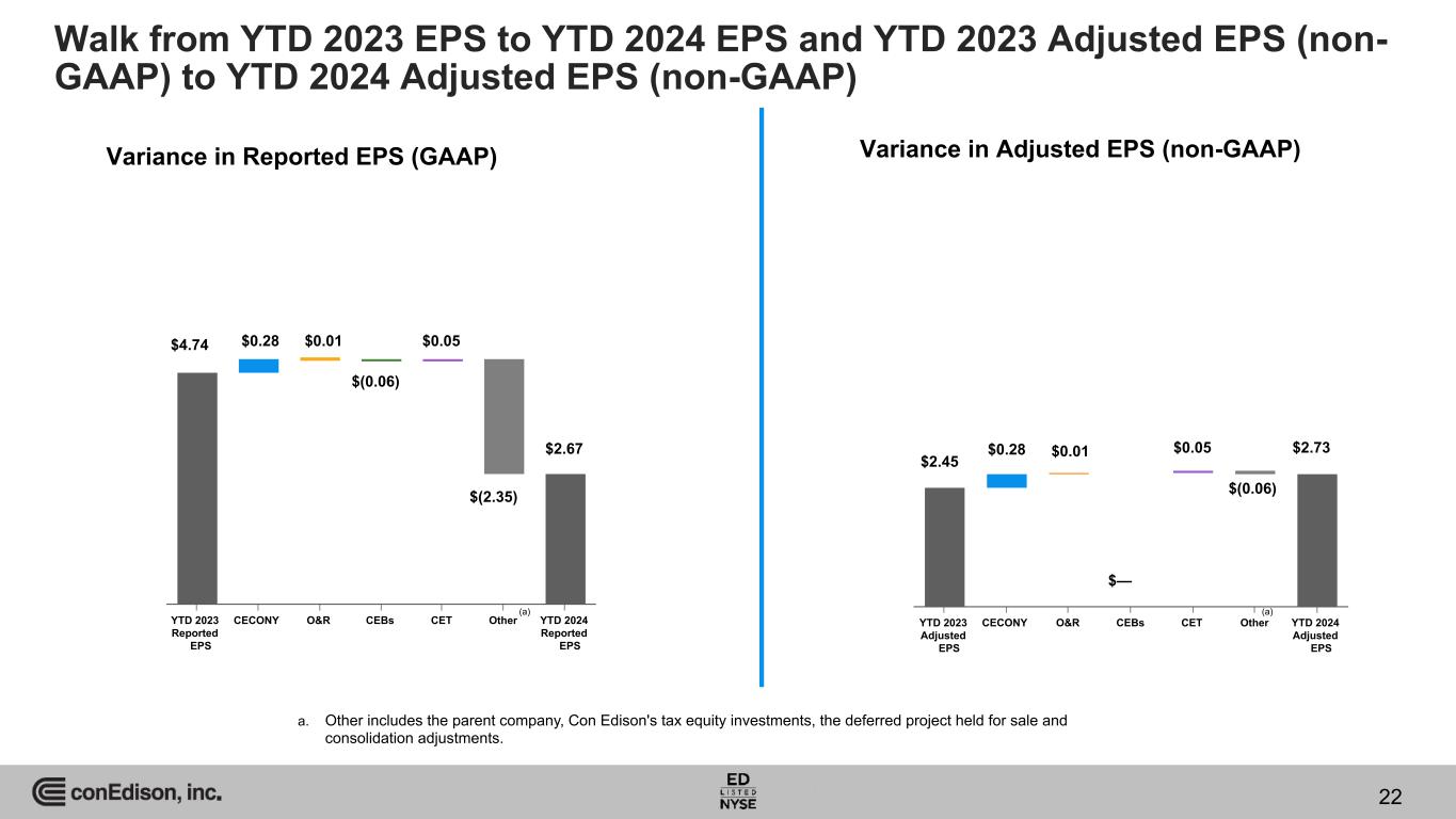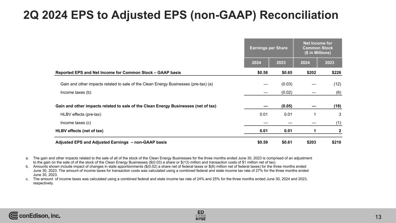 EPS (GAAP Basis) Adjusted EPS (non- GAAP Basis) Total Clean Energy Businesses $(0.06) $(0.06) CEBs(a) Higher investment income and an income tax adjustment due to AFUDC from Mountain Valley Pipeline, LLC 0.04 0.04 CET Other 0.01 0.01 Total CET $0.05 $0.05 HLBV effects 0.01 $— Other, including parent company expenses Gain and other impacts related to the sale of the Clean Energy Businesses (2.31) — Lower interest income (0.04) (0.04) Other (0.01) (0.01) Total Other $(2.35) $(0.05) Total $(2.07) $0.28 a. On March 1, 2023, Con Edison completed the sale of all of the stock of the Clean Energy Businesses and therefore 2023 reflects the financial results for the two months ended February 2023. YTD 2024 vs. YTD 2023 EPS and Adjusted EPS (non- GAAP) Variances – Six Months Ended Variation 24