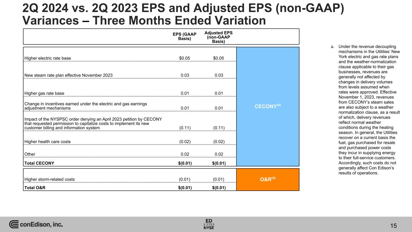 EPS (GAAP Basis) Adjusted EPS (non-GAAP Basis) Higher electric rate base $0.05 $0.05 CECONY(a) New steam rate plan effective November 2023 0.03 0.03 Higher gas rate base 0.01 0.01 Change in incentives earned under the electric and gas earnings adjustment mechanisms 0.01 0.01 Impact of the NYSPSC order denying an April 2023 petition by CECONY that requested permission to capitalize costs to implement its new customer billing and information system (0.11) (0.11) Higher health care costs (0.02) (0.02) Other 0.02 0.02 Total CECONY $(0.01) $(0.01) Higher storm-related costs (0.01) (0.01) O&R(a) Total O&R $(0.01) $(0.01) 2Q 2024 vs. 2Q 2023 EPS and Adjusted EPS (non-GAAP) Variances – Three Months Ended Variation a. Under the revenue decoupling mechanisms in the Utilities’ New York electric and gas rate plans and the weather-normalization clause applicable to their gas businesses, revenues are generally not affected by changes in delivery volumes from levels assumed when rates were approved. Effective November 1, 2023, revenues from CECONY’s steam sales are also subject to a weather normalization clause, as a result of which, delivery revenues reflect normal weather conditions during the heating season. In general, the Utilities recover on a current basis the fuel, gas purchased for resale and purchased power costs they incur in supplying energy to their full-service customers. Accordingly, such costs do not generally affect Con Edison’s results of operations. 15