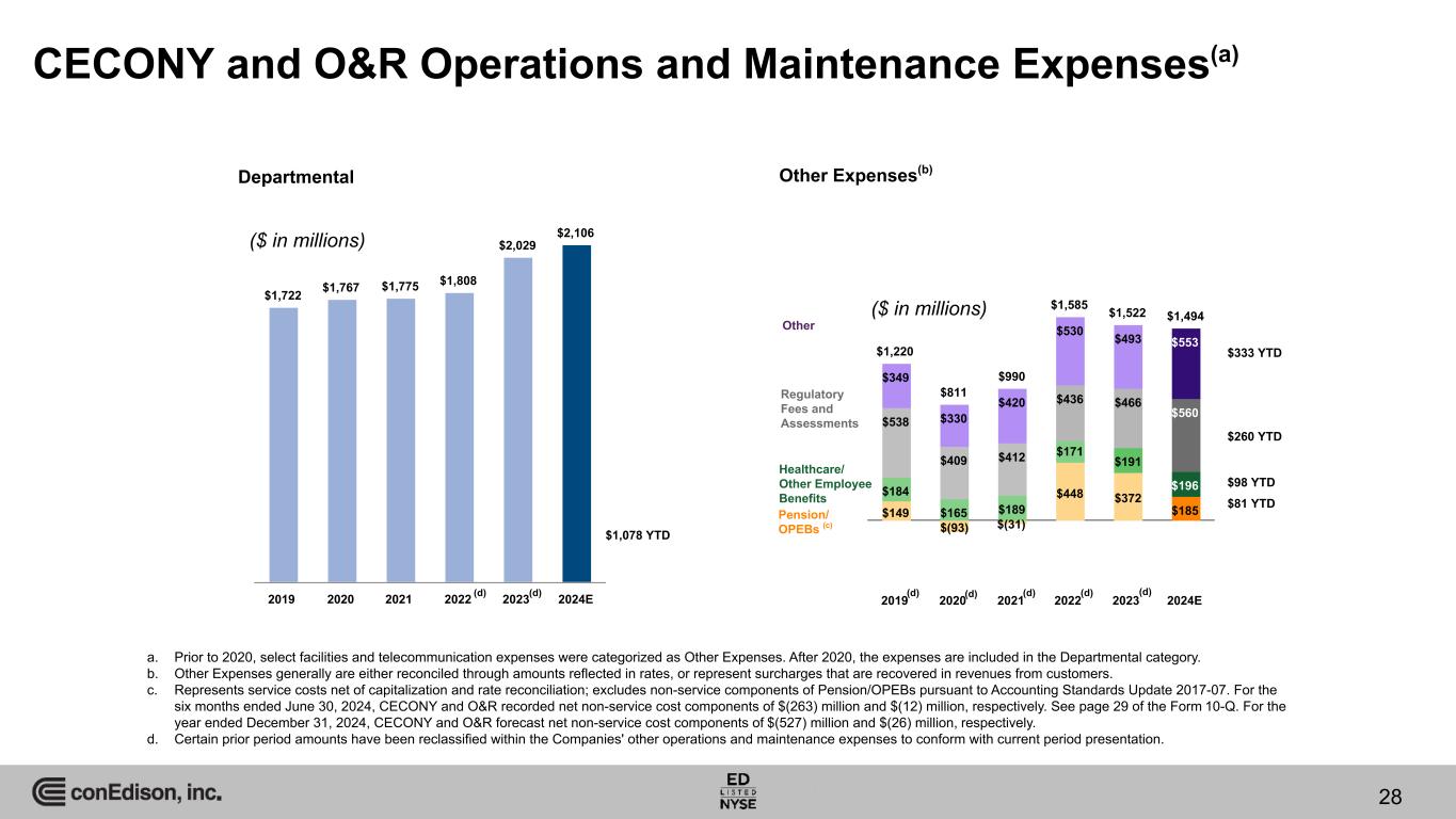 $1,220 $811 $990 $1,585 $1,522 $1,494 $149 $(93) $(31) $448 $372 $185 $184 $165 $189 $171 $191 $196 $538 $409 $412 $436 $466 $560 $349 $330 $420 $530 $493 $553 2019 2020 2021 2022 2023 2024E CECONY and O&R Operations and Maintenance Expenses(a) a. Prior to 2020, select facilities and telecommunication expenses were categorized as Other Expenses. After 2020, the expenses are included in the Departmental category. b. Other Expenses generally are either reconciled through amounts reflected in rates, or represent surcharges that are recovered in revenues from customers. c. Represents service costs net of capitalization and rate reconciliation; excludes non-service components of Pension/OPEBs pursuant to Accounting Standards Update 2017-07. For the six months ended June 30, 2024, CECONY and O&R recorded net non-service cost components of $(263) million and $(12) million, respectively. See page 29 of the Form 10-Q. For the year ended December 31, 2024, CECONY and O&R forecast net non-service cost components of $(527) million and $(26) million, respectively. d. Certain prior period amounts have been reclassified within the Companies' other operations and maintenance expenses to conform with current period presentation. Other Expenses(b) $1,722 $1,767 $1,775 $1,808 $2,029 $2,106 2019 2020 2021 2022 2023 2024E Departmental Pension/ OPEBs (c) Regulatory Fees and Assessments Healthcare/ Other Employee Benefits Other ($ in millions) ($ in millions) 28 (d)(d) (d) (d) $1,078 YTD $333 YTD $260 YTD $81 YTD $98 YTD (d)(d) (d)