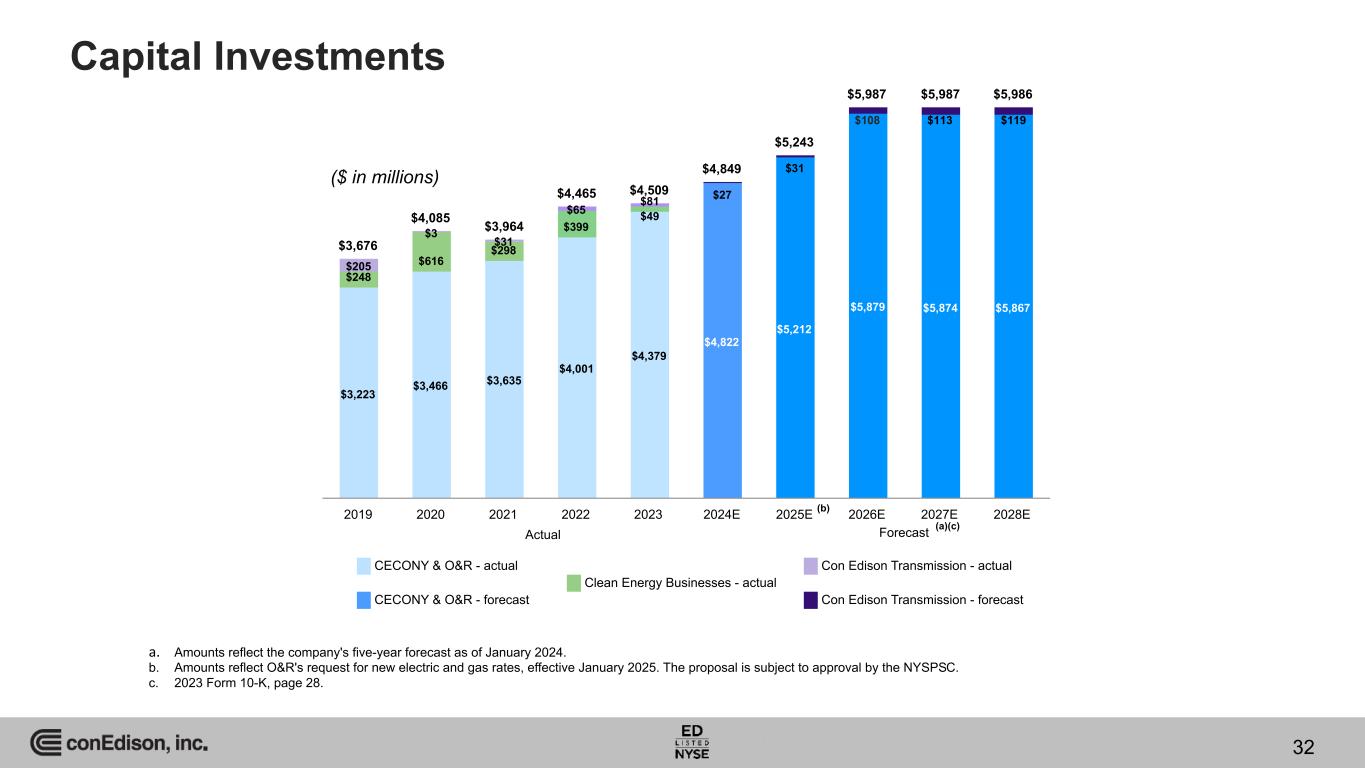 $3,223 $3,466 $3,635 $4,001 $4,379 $4,822 $5,212 $5,879 $5,874 $5,867 2019 2020 2021 2022 2023 2024E 2025E 2026E 2027E 2028E Utilities' Capital Investments Gas Electric Annual CECONY Capital Investments Annual O&R Capital Investments Electric Gas Steam Depreciation Electric Gas Depreciation 2019 1,851 1,078 91 1,373 142 61 84 2020 2,080 1,044 122 1,598 159 61 90 2021 2,189 1,126 103 1,705 147 70 95 2022 2,522 1,128 108 1,778 167 76 98 2023 2,909 1,046 128 1,942 211 85 105 2024E 3,277 1,152 104 2,126 209 80 119 2025E 3,554 1,116 107 2,267 350 85 123 2026E 4,171 1,126 110 2,414 380 92 127 2027E 4,128 1,156 138 2,557 367 85 138 2028E 4,115 1,177 142 2,705 353 80 148 Steam Depreciation Actual Forecast a. Amounts reflect the company's five-year forecast as of January 2024. b. Amounts reflect O&R's request for new electric and gas rates, effective January 2025. The proposal is subject to approval by the NYSPSC. c. 2023 Form 10-K, page 28. (a)(b) ($ in millions) 33