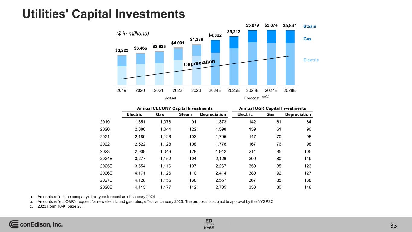 Capital Investments $3,676 $4,085 $3,964 $4,465 $4,509 $4,849 $5,243 $5,987 $5,987 $5,986 $3,223 $3,466 $3,635 $4,001 $4,379 $4,822 $5,212 $5,879 $5,874 $5,867 $248 $616 $298 $399 $81 $205 $3 $31 $65 $49 $27 $31 $108 $113 $119 2019 2020 2021 2022 2023 2024E 2025E 2026E 2027E 2028E Actual Forecast (a)(c) CECONY & O&R - actual Con Edison Transmission - actual Clean Energy Businesses - actual CECONY & O&R - forecast Con Edison Transmission - forecast a. Amounts reflect the company's five-year forecast as of January 2024. b. Amounts reflect O&R's request for new electric and gas rates, effective January 2025. The proposal is subject to approval by the NYSPSC. c. 2023 Form 10-K, page 28. (b) ($ in millions) 32