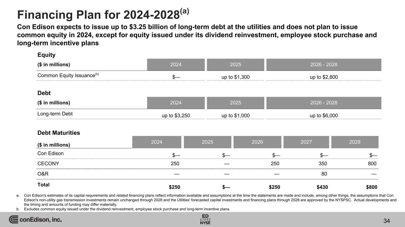 Financing Plan for 2024-2028(a) Equity ($ in millions) 2024 2025 2026 - 2028 Common Equity Issuance(b) $— up to $1,300 up to $2,800 Debt ($ in millions) 2024 2025 2026 - 2028 Long-term Debt up to $3,250 up to $1,000 up to $6,000 a. Con Edison's estimates of its capital requirements and related financing plans reflect information available and assumptions at the time the statements are made and include, among other things, the assumptions that Con Edison's non-utility gas transmission investments remain unchanged through 2028 and the Utilities' forecasted capital investments and financing plans through 2028 are approved by the NYSPSC. Actual developments and the timing and amounts of funding may differ materially. b. Excludes common equity issued under the dividend reinvestment, employee stock purchase and long-term incentive plans. Debt Maturities ($ in millions) 2024 2025 2026 2027 2028 Con Edison $— $— $— $— $— CECONY 250 — 250 350 800 O&R — — — 80 — Total $250 $— $250 $430 $800 Con Edison expects to issue up to $3.25 billion of long-term debt at the utilities and does not plan to issue common equity in 2024, except for equity issued under its dividend reinvestment, employee stock purchase and long-term incentive plans 34