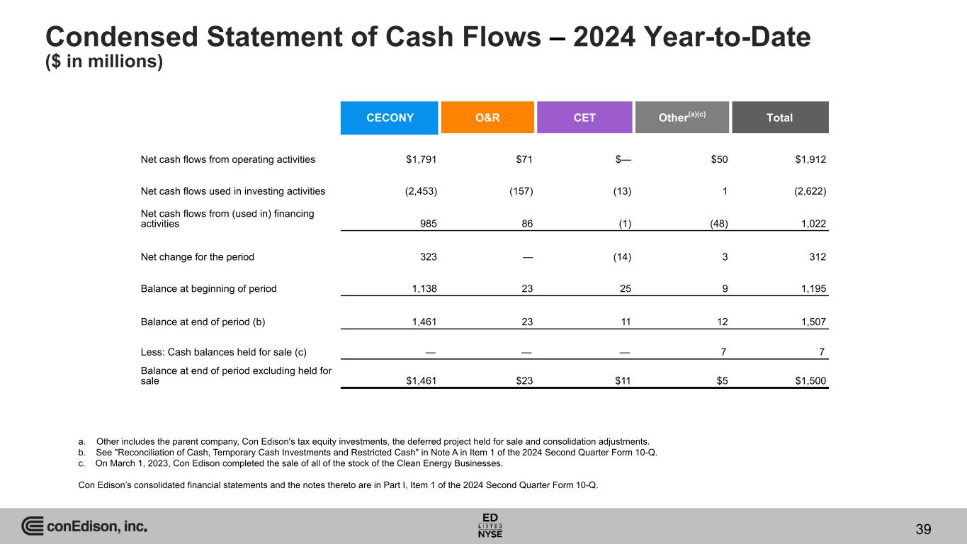 Condensed Statement of Cash Flows – 2024 Year-to-Date ($ in millions) CECONY O&R CET Other(a)(c) Total Net cash flows from operating activities $1,791 $71 $— $50 $1,912 Net cash flows used in investing activities (2,453) (157) (13) 1 (2,622) Net cash flows from (used in) financing activities 985 86 (1) (48) 1,022 Net change for the period 323 — (14) 3 312 Balance at beginning of period 1,138 23 25 9 1,195 Balance at end of period (b) 1,461 23 11 12 1,507 Less: Cash balances held for sale (c) — — — 7 7 Balance at end of period excluding held for sale $1,461 $23 $11 $5 $1,500 a. Other includes the parent company, Con Edison's tax equity investments, the deferred project held for sale and consolidation adjustments. b. See "Reconciliation of Cash, Temporary Cash Investments and Restricted Cash" in Note A in Item 1 of the 2024 Second Quarter Form 10-Q. c. On March 1, 2023, Con Edison completed the sale of all of the stock of the Clean Energy Businesses. Con Edison’s consolidated financial statements and the notes thereto are in Part I, Item 1 of the 2024 Second Quarter Form 10-Q. 39