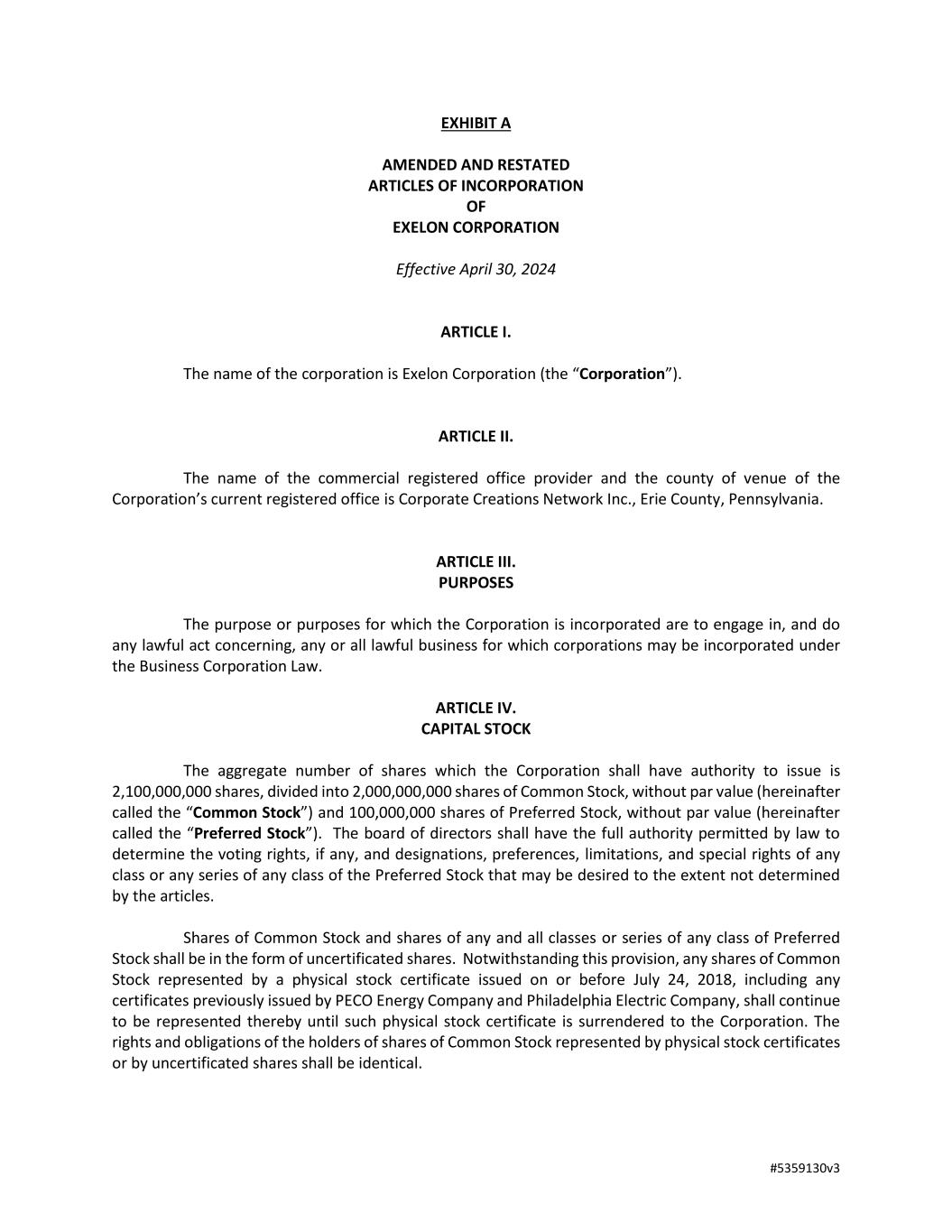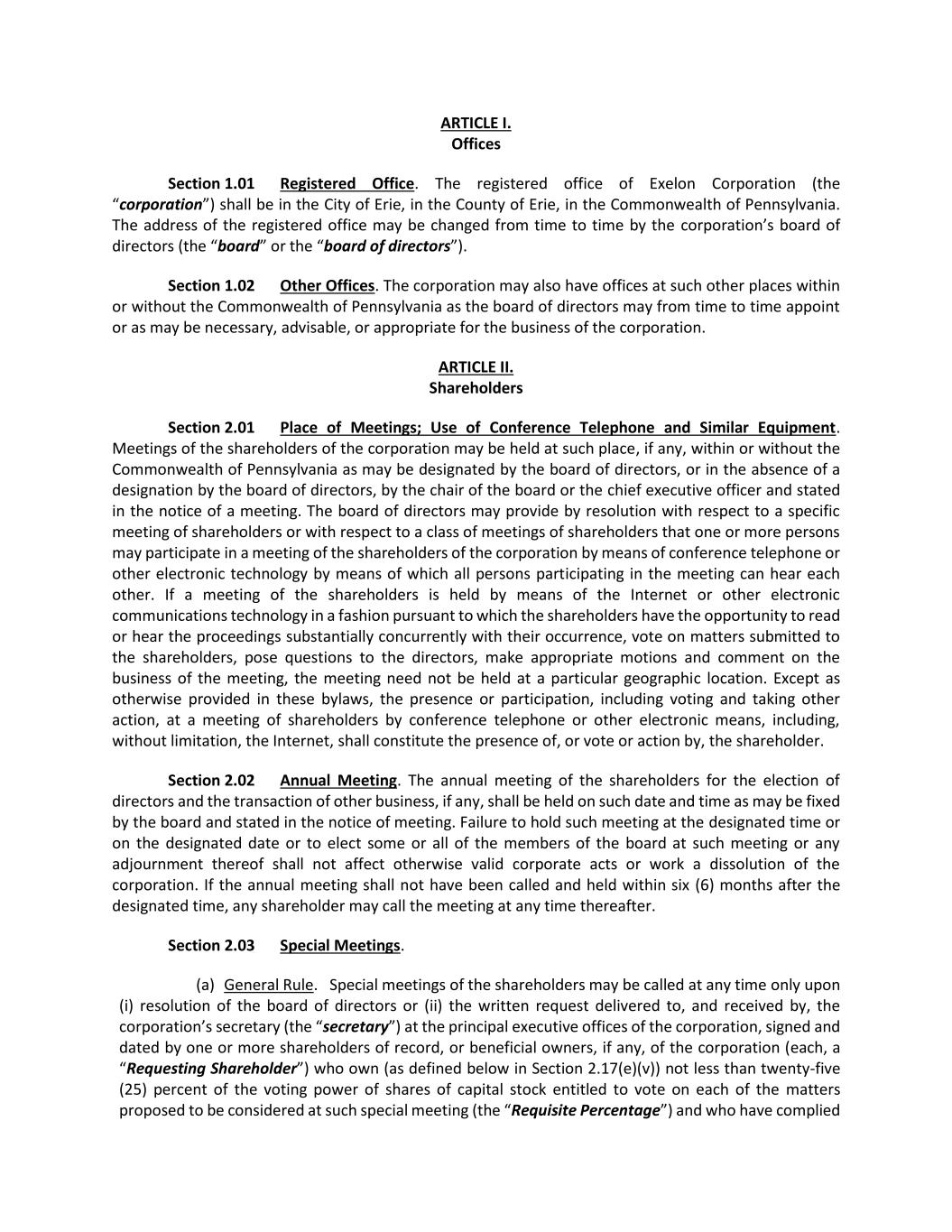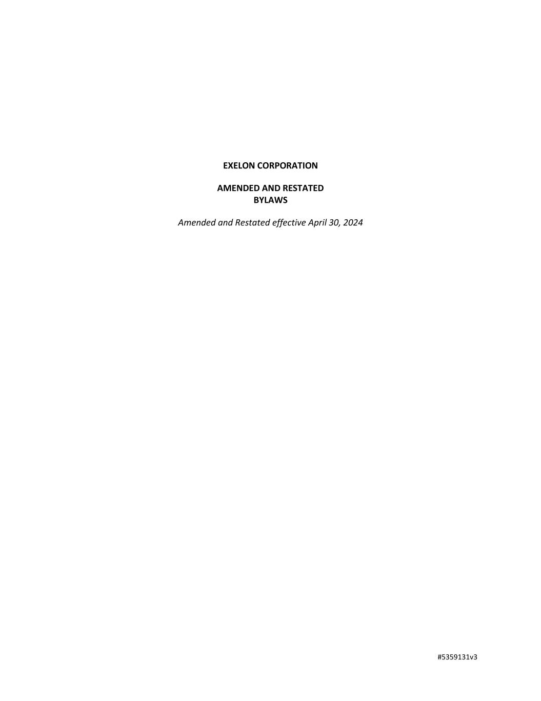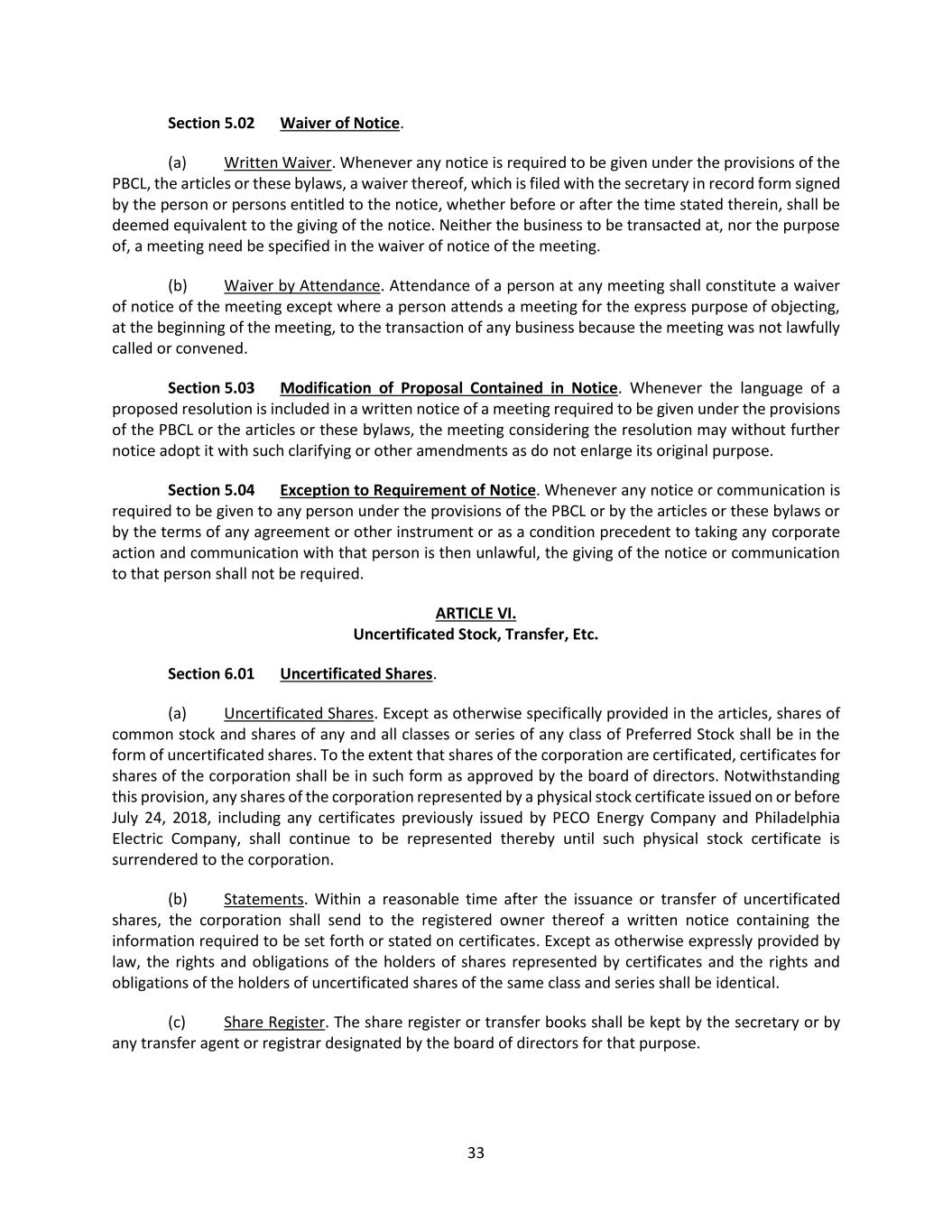 33 Section 5.02 Waiver of Notice. (a) Written Waiver. Whenever any notice is required to be given under the provisions of the PBCL, the articles or these bylaws, a waiver thereof, which is filed with the secretary in record form signed by the person or persons entitled to the notice, whether before or after the time stated therein, shall be deemed equivalent to the giving of the notice. Neither the business to be transacted at, nor the purpose of, a meeting need be specified in the waiver of notice of the meeting. (b) Waiver by Attendance. Attendance of a person at any meeting shall constitute a waiver of notice of the meeting except where a person attends a meeting for the express purpose of objecting, at the beginning of the meeting, to the transaction of any business because the meeting was not lawfully called or convened. Section 5.03 Modification of Proposal Contained in Notice. Whenever the language of a proposed resolution is included in a written notice of a meeting required to be given under the provisions of the PBCL or the articles or these bylaws, the meeting considering the resolution may without further notice adopt it with such clarifying or other amendments as do not enlarge its original purpose. Section 5.04 Exception to Requirement of Notice. Whenever any notice or communication is required to be given to any person under the provisions of the PBCL or by the articles or these bylaws or by the terms of any agreement or other instrument or as a condition precedent to taking any corporate action and communication with that person is then unlawful, the giving of the notice or communication to that person shall not be required. ARTICLE VI. Uncertificated Stock, Transfer, Etc. Section 6.01 Uncertificated Shares. (a) Uncertificated Shares. Except as otherwise specifically provided in the articles, shares of common stock and shares of any and all classes or series of any class of Preferred Stock shall be in the form of uncertificated shares. To the extent that shares of the corporation are certificated, certificates for shares of the corporation shall be in such form as approved by the board of directors. Notwithstanding this provision, any shares of the corporation represented by a physical stock certificate issued on or before July 24, 2018, including any certificates previously issued by PECO Energy Company and Philadelphia Electric Company, shall continue to be represented thereby until such physical stock certificate is surrendered to the corporation. (b) Statements. Within a reasonable time after the issuance or transfer of uncertificated shares, the corporation shall send to the registered owner thereof a written notice containing the information required to be set forth or stated on certificates. Except as otherwise expressly provided by law, the rights and obligations of the holders of shares represented by certificates and the rights and obligations of the holders of uncertificated shares of the same class and series shall be identical. (c) Share Register. The share register or transfer books shall be kept by the secretary or by any transfer agent or registrar designated by the board of directors for that purpose.