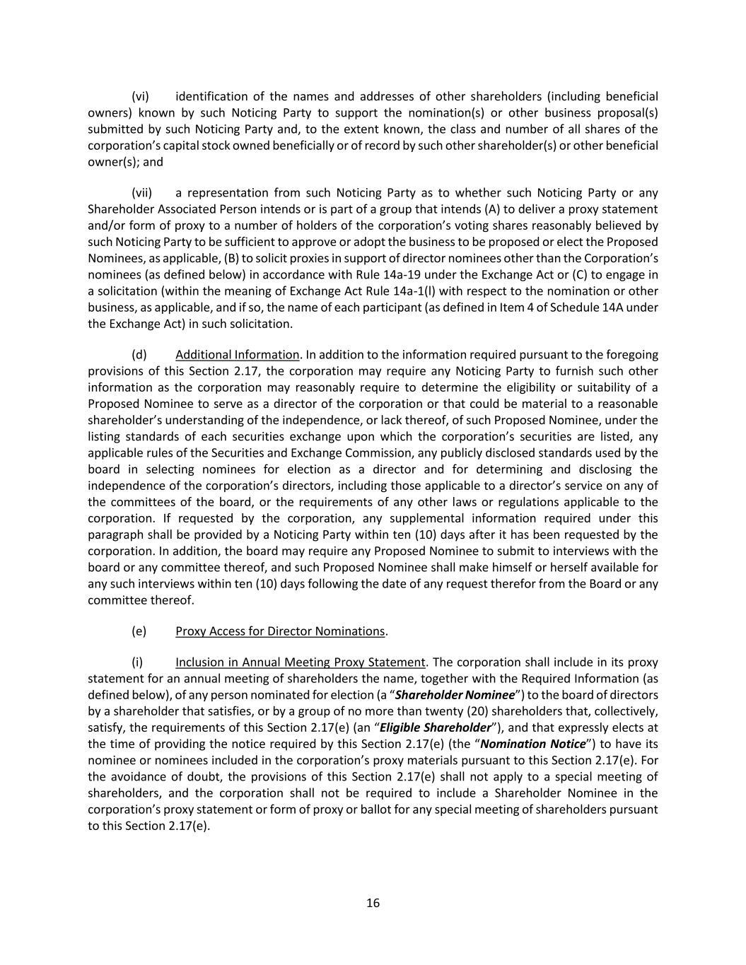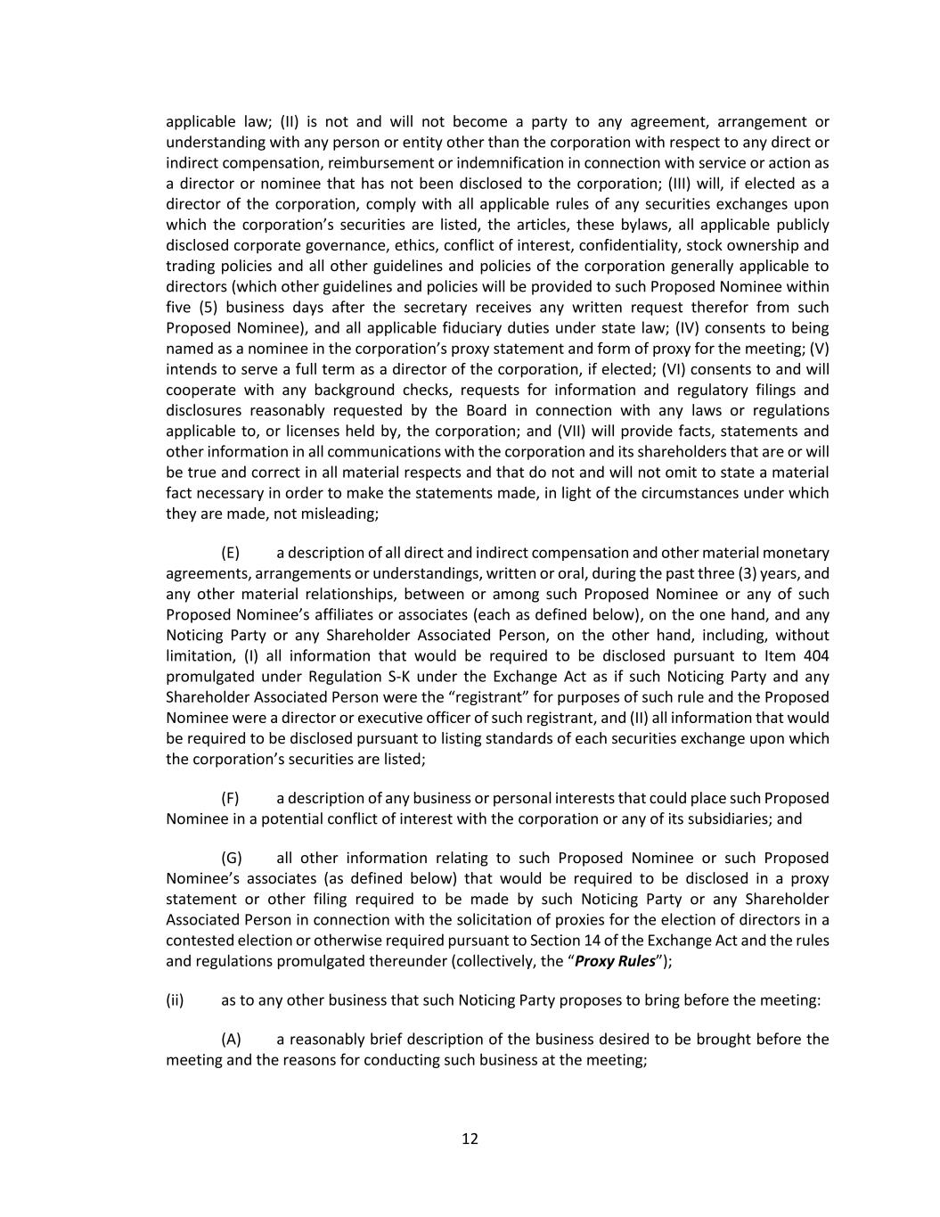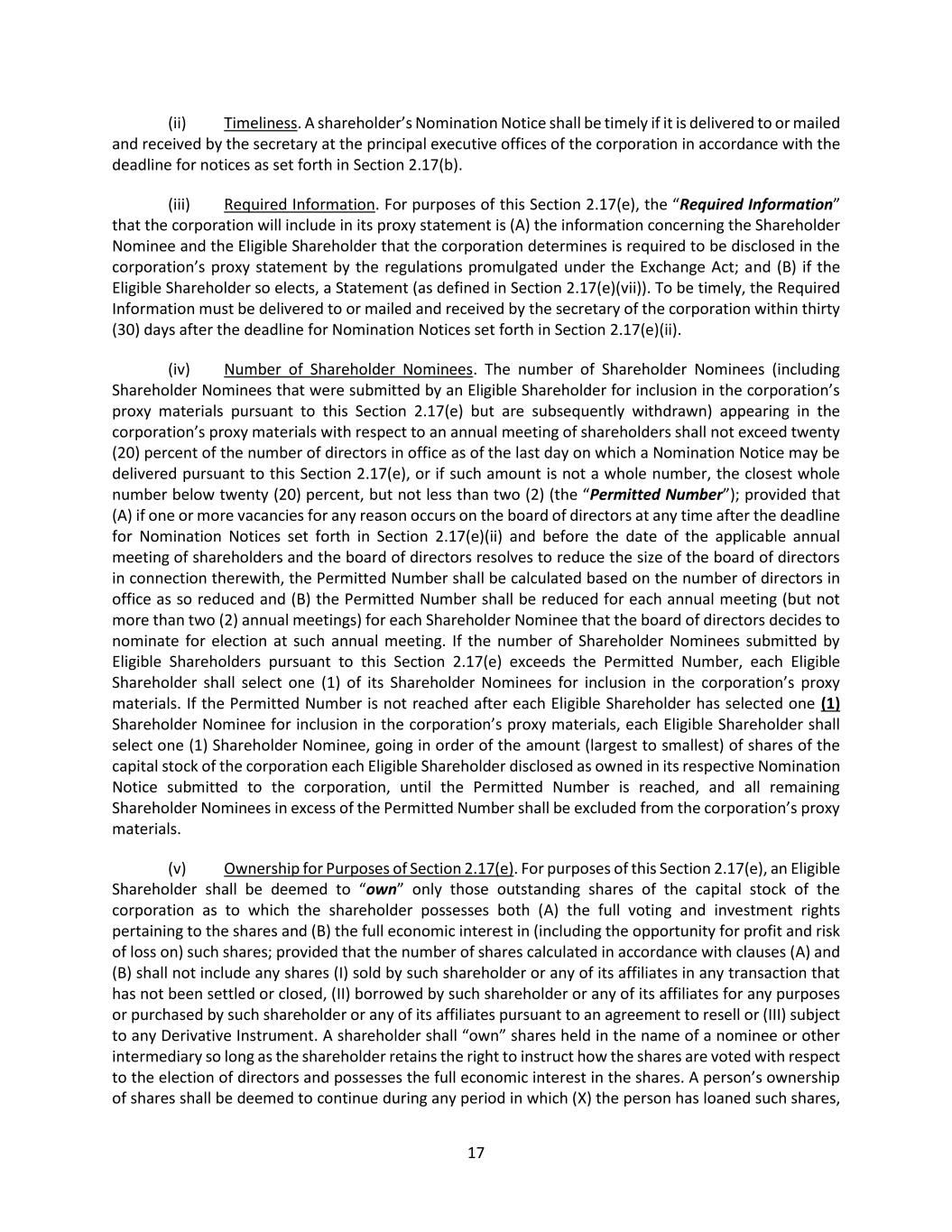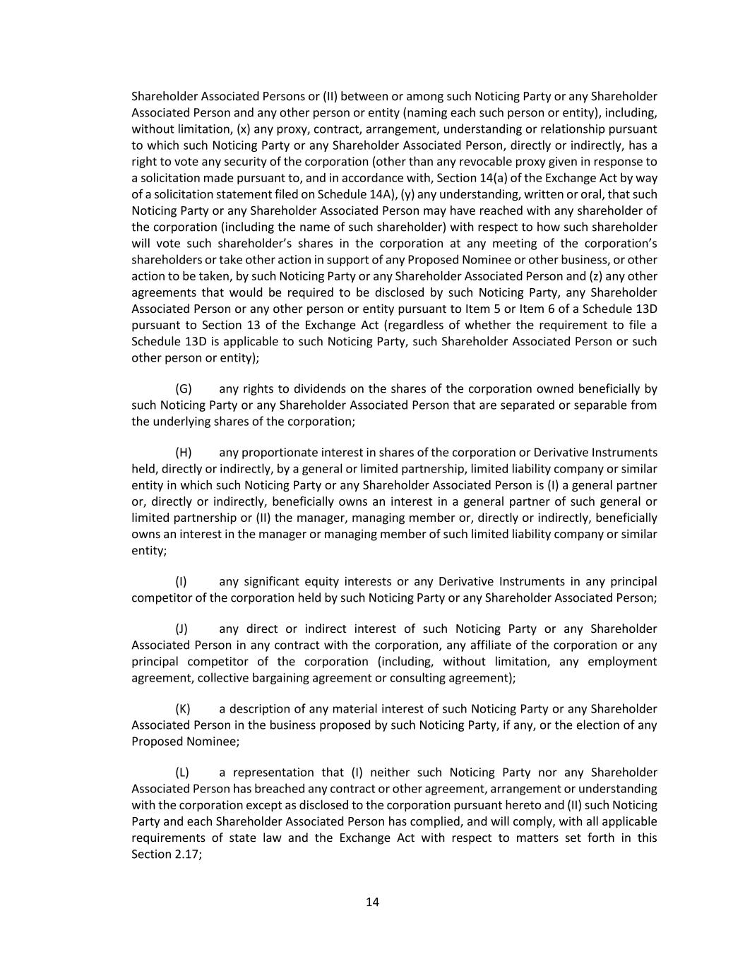 24 (iii) If any information submitted pursuant to this Section 2.17 by any Noticing Party proposing individuals to nominate for election or reelection as a director or business for consideration at a shareholder meeting shall be inaccurate in any material respect, such information shall be deemed not to have been provided in accordance with this Section 2.17. Any such Noticing Party shall notify the secretary in writing at the principal executive offices of the corporation of any inaccuracy or change in any information submitted pursuant to this Section 2.17 (including if any Noticing Party or any Shareholder Associated Person no longer intends to solicit proxies in accordance with the representation made pursuant to Section 2.17(c)(vii)(B)) within two (2) business days after becoming aware of such inaccuracy or change, and any such notification shall (A) be made only to the extent that any information submitted pursuant to this Section 2.17 has changed since such Noticing Party’s prior submission and (B) clearly identify the information that has changed since such Noticing Party’s prior submission. Upon written request of the secretary on behalf of the board (or a duly authorized committee thereof), any such Noticing Party shall provide, within seven (7) business days after delivery of such request (or such other period as may be specified in such request), (X) written verification, reasonably satisfactory to the board, any committee thereof or any authorized officer of the corporation, to demonstrate the accuracy of any information submitted by such Noticing Party pursuant to this Section 2.17 and (Y) a written affirmation of any information submitted by such Noticing Party pursuant to this Section 2.17 as of an earlier date. If a Noticing Party fails to provide such written verification or affirmation within such period, the information as to which written verification or affirmation was requested may be deemed not to have been provided in accordance with this Section 2.17. An Eligible Shareholder shall comply with the requirements of this Section 2.17(f)(iii) as if the Eligible Shareholder were the Noticing Party. (iv) If (A) any Noticing Party or any Shareholder Associated Person provides notice pursuant to Rule 14a-19(b) under the Exchange Act and (B) such Noticing Party or Shareholder Associated Person subsequently either (x) notifies the corporation that such Noticing Party or Shareholder Associated Person no longer intends to solicit proxies in support of director nominees other than the Corporation’s nominees in accordance with Rule 14a-19 under the Exchange Act or (y) fails to comply with the requirements of Rules 14a-19(a)(2) or Rule14(a)(3) under the Exchange Act, then the corporation shall disregard any proxies or votes solicited for the Proposed Nominees proposed by such Noticing Party. Upon request by the corporation, if any Noticing Party or any Shareholder Associated Person provides notice pursuant to Rule 14a-19(b) under the Exchange Act, such Noticing Party shall deliver to the secretary, no later than five (5) business days prior to the applicable meeting date, reasonable evidence that the requirements of Rule 14a-19(a)(3) under the Exchange Act have been satisfied. An Eligible Shareholder shall comply with the requirements of this Section 2.17(f)(iv) as if the Eligible Shareholder were the Noticing Party. (v) In addition to complying with the foregoing provisions of this Section 2.17, a shareholder shall also comply with all applicable requirements of state law and the Exchange Act with respect to the matters set forth in this Section 2.17. Nothing in this Section 2.17 shall be deemed to affect any rights of (A) shareholders to request inclusion of proposals in the corporation’s proxy statement pursuant to Rule 14a-8 under the Exchange Act, (B) shareholders to request inclusion of nominees in the corporation’s proxy statement pursuant to the Proxy Rules or (C) the holders of any series of Preferred Stock to elect directors pursuant to any applicable provisions of the articles. (vi) For purposes of these bylaws, (A) “affiliate” and “associate” each shall have the respective meanings set forth in Rule 12b-2 under the Exchange Act; (B) “beneficial owner” or “beneficially owned” shall have the meaning set forth for such terms in Section 13(d) of the Exchange Act; (C) “Close of Business” shall mean 5:00 p.m. Eastern Time on any calendar day, whether or not the day is a business day; (D) “Corporation’s nominee(s)” shall mean any person(s) nominated by or at the direction