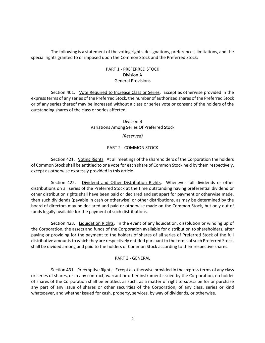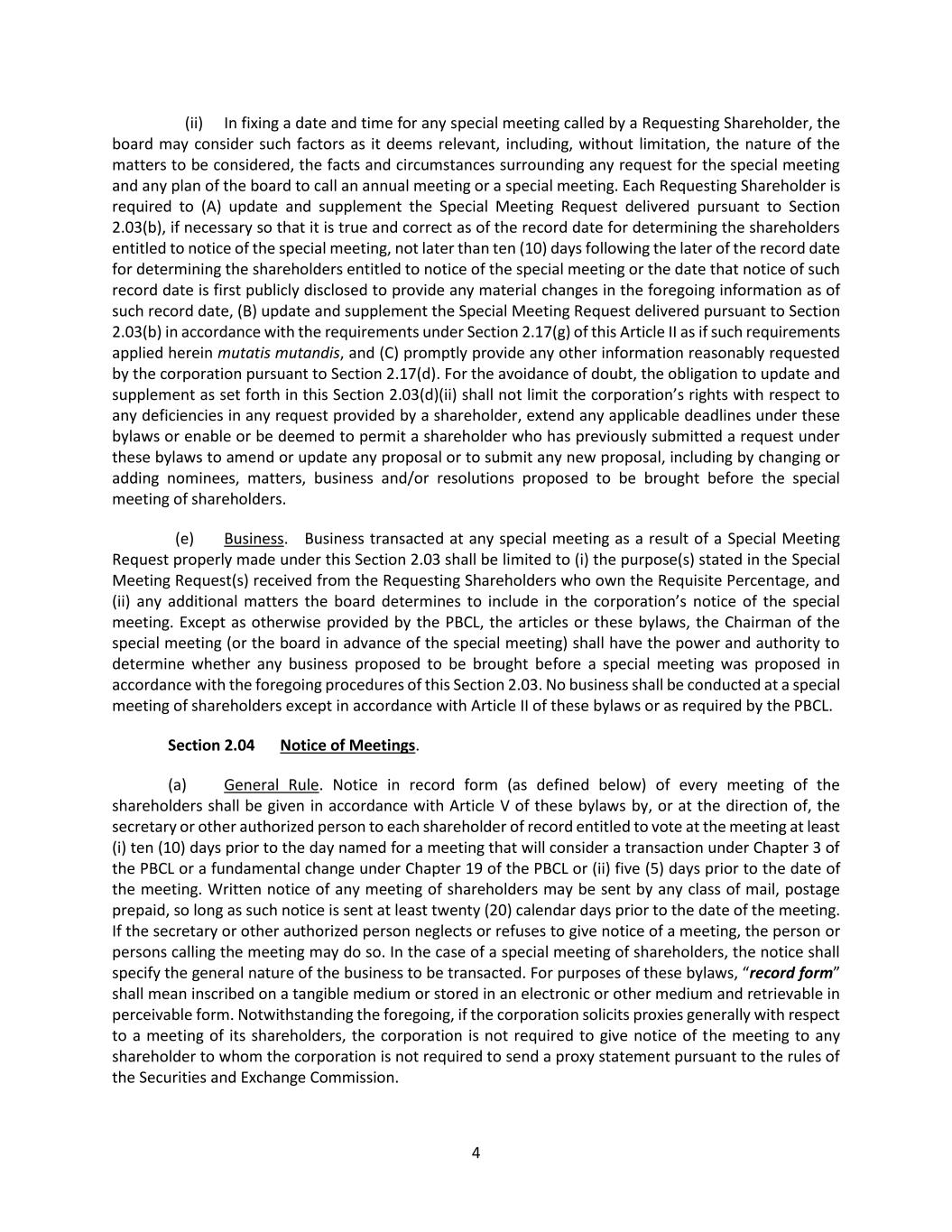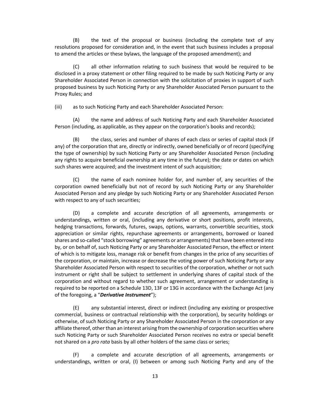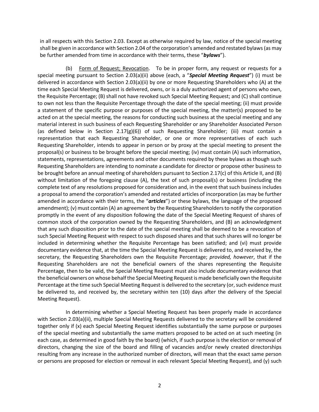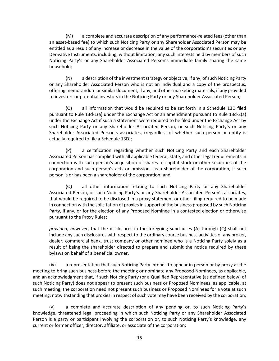 24 (iii) If any information submitted pursuant to this Section 2.17 by any Noticing Party proposing individuals to nominate for election or reelection as a director or business for consideration at a shareholder meeting shall be inaccurate in any material respect, such information shall be deemed not to have been provided in accordance with this Section 2.17. Any such Noticing Party shall notify the secretary in writing at the principal executive offices of the corporation of any inaccuracy or change in any information submitted pursuant to this Section 2.17 (including if any Noticing Party or any Shareholder Associated Person no longer intends to solicit proxies in accordance with the representation made pursuant to Section 2.17(c)(vii)(B)) within two (2) business days after becoming aware of such inaccuracy or change, and any such notification shall (A) be made only to the extent that any information submitted pursuant to this Section 2.17 has changed since such Noticing Party’s prior submission and (B) clearly identify the information that has changed since such Noticing Party’s prior submission. Upon written request of the secretary on behalf of the board (or a duly authorized committee thereof), any such Noticing Party shall provide, within seven (7) business days after delivery of such request (or such other period as may be specified in such request), (X) written verification, reasonably satisfactory to the board, any committee thereof or any authorized officer of the corporation, to demonstrate the accuracy of any information submitted by such Noticing Party pursuant to this Section 2.17 and (Y) a written affirmation of any information submitted by such Noticing Party pursuant to this Section 2.17 as of an earlier date. If a Noticing Party fails to provide such written verification or affirmation within such period, the information as to which written verification or affirmation was requested may be deemed not to have been provided in accordance with this Section 2.17. An Eligible Shareholder shall comply with the requirements of this Section 2.17(f)(iii) as if the Eligible Shareholder were the Noticing Party. (iv) If (A) any Noticing Party or any Shareholder Associated Person provides notice pursuant to Rule 14a-19(b) under the Exchange Act and (B) such Noticing Party or Shareholder Associated Person subsequently either (x) notifies the corporation that such Noticing Party or Shareholder Associated Person no longer intends to solicit proxies in support of director nominees other than the Corporation’s nominees in accordance with Rule 14a-19 under the Exchange Act or (y) fails to comply with the requirements of Rules 14a-19(a)(2) or Rule14(a)(3) under the Exchange Act, then the corporation shall disregard any proxies or votes solicited for the Proposed Nominees proposed by such Noticing Party. Upon request by the corporation, if any Noticing Party or any Shareholder Associated Person provides notice pursuant to Rule 14a-19(b) under the Exchange Act, such Noticing Party shall deliver to the secretary, no later than five (5) business days prior to the applicable meeting date, reasonable evidence that the requirements of Rule 14a-19(a)(3) under the Exchange Act have been satisfied. An Eligible Shareholder shall comply with the requirements of this Section 2.17(f)(iv) as if the Eligible Shareholder were the Noticing Party. (v) In addition to complying with the foregoing provisions of this Section 2.17, a shareholder shall also comply with all applicable requirements of state law and the Exchange Act with respect to the matters set forth in this Section 2.17. Nothing in this Section 2.17 shall be deemed to affect any rights of (A) shareholders to request inclusion of proposals in the corporation’s proxy statement pursuant to Rule 14a-8 under the Exchange Act, (B) shareholders to request inclusion of nominees in the corporation’s proxy statement pursuant to the Proxy Rules or (C) the holders of any series of Preferred Stock to elect directors pursuant to any applicable provisions of the articles. (vi) For purposes of these bylaws, (A) “affiliate” and “associate” each shall have the respective meanings set forth in Rule 12b-2 under the Exchange Act; (B) “beneficial owner” or “beneficially owned” shall have the meaning set forth for such terms in Section 13(d) of the Exchange Act; (C) “Close of Business” shall mean 5:00 p.m. Eastern Time on any calendar day, whether or not the day is a business day; (D) “Corporation’s nominee(s)” shall mean any person(s) nominated by or at the direction