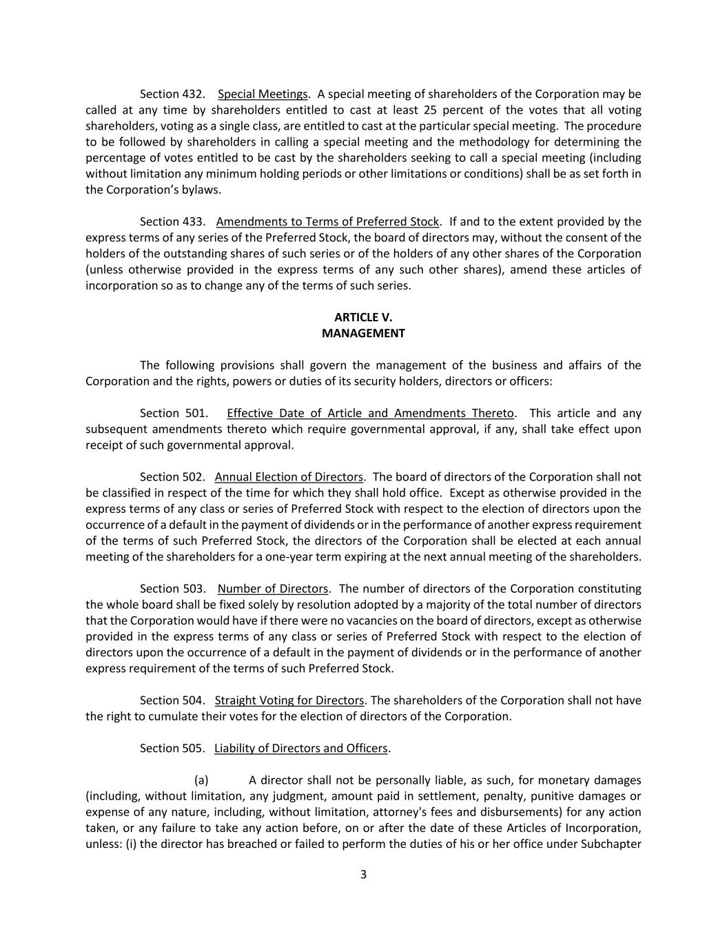 25 of the board; (E) “public disclosure” shall mean disclosure in a press release reported by a national news service or in a document publicly filed by the corporation with the Securities and Exchange Commission pursuant to Section 13, 14 or 15(d) of the Exchange Act; (F) a “Qualified Representative” of a Noticing Party means (I) a duly authorized officer, manager or partner of such Noticing Party or (II) a person authorized by a writing executed by such Noticing Party (or a reliable reproduction or electronic transmission of the writing) delivered by such Noticing Party to the corporation prior to the making of any nomination or proposal at a shareholder meeting stating that such person is authorized to act for such Noticing Party as proxy at the meeting of shareholders, which writing or electronic transmission, or a reliable reproduction of the writing or electronic transmission, must be produced at the meeting of shareholders; and (G) “Shareholder Associated Person” shall mean, with respect to any Noticing Party (or, in the case of Section 2.03(b), any Requesting Shareholder), (I) any person directly or indirectly controlling, controlled by, under common control with such Noticing Party (or Requesting Shareholder, as applicable), (II) any member of the immediate family of such Noticing Party (or Requesting Shareholder, as applicable) sharing the same household, (III) any person who is a member of a “group” (as such term is used in Rule 13d-5 under the Exchange Act (or any successor provision at law)) with, or is otherwise known by such Noticing Party (or Requesting Shareholder, as applicable) or other Shareholder Associated Person to be acting in concert with, such Noticing Party (or Requesting Shareholder, as applicable) or any other Shareholder Associated Person with respect to the stock of the corporation, (IV) any beneficial owner of shares of stock of the corporation owned of record by such Noticing Party (or Requesting Shareholder, as applicable) or any other Shareholder Associated Person (other than a shareholder that is a depositary), (V) any affiliate or associate of such Noticing Party (or Requesting Shareholder, as applicable) or any other Shareholder Associated Person, (VI) any participant (as defined in paragraphs (a)(ii)-(vi) of Instruction 3 to Item 4 of Schedule 14A) with such Noticing Party (or Requesting Shareholder, as applicable) or any other Shareholder Associated Person with respect to any proposed business or nominations, as applicable, and (VII) any Proposed Nominee. ARTICLE III. Board of Directors Section 3.01 Powers. (a) General Rule. Unless otherwise provided by statute, all powers vested by law in the corporation shall be exercised by or under the authority of, and the business and affairs of the corporation shall be managed under the direction of, the board of directors. (b) Directors. A director shall stand in a fiduciary relation to the corporation and shall perform his or her duties as a director, including his or her duties as a member of any committee of the board upon which he or she may serve, in good faith, in a manner he or she reasonably believes to be in the best interests of the corporation and with such care, including reasonable inquiry, skill and diligence, as a person of ordinary prudence would use under similar circumstances. In performing his or her duties, a director shall be entitled to rely in good faith on information, opinions, reports, or statements, including financial statements and other financial data, in each case prepared or presented by any of the following: (i) One or more officers or employees of the corporation whom the director reasonably believes to be reliable and competent in the matters presented. (ii) Counsel, public accountants, or other persons as to matters which the director reasonably believes to be within the professional or expert competence of such person.