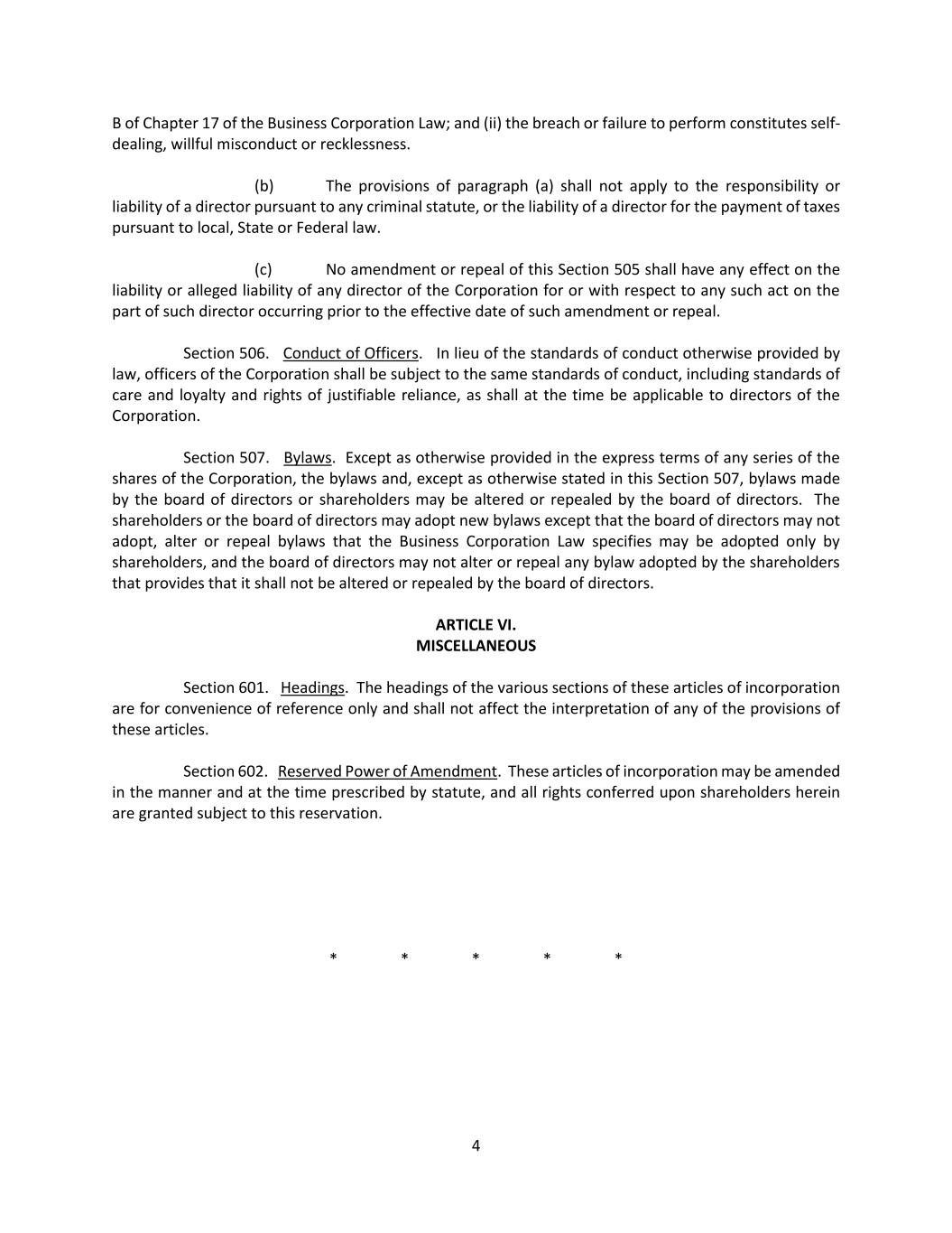 36 directors, independent legal counsel or shareholders) that the indemnitee has not met such applicable standard of conduct, shall create a presumption that the indemnitee has not met the applicable standard of conduct or, in the case of such a suit brought by the indemnitee, be a defense to such suit. In any suit brought by the indemnitee to enforce a right to indemnification or to an advancement of expenses hereunder, or brought by the corporation to recover an advancement of expenses pursuant to the terms of an undertaking, the burden of proving that the indemnitee is not entitled to be indemnified, or to such advancement of expenses, under this Article VII or otherwise shall be on the corporation. Section 7.04 Non-Exclusivity of Rights. The rights to indemnification and to the advancement of expenses conferred in this Article VII shall not be exclusive of, nor be deemed in limitation of, any other right to which any person may otherwise be or become entitled or permitted under any statute, the articles, these bylaws, any agreement, any vote of shareholders or disinterested directors or otherwise, both as to action in such person’s official capacity and as to action in another capacity while holding that office; provided, however, that no such indemnification shall be made in any case where the act or failure to act giving rise to the claim for indemnification is determined by a court to have constituted willful misconduct or recklessness. Section 7.05 Insurance. The corporation may maintain insurance, at its expense, to protect itself and any current or former director, officer, employee or agent of the corporation or another corporation, partnership, joint venture, trust or other enterprise against any expense, liability, or loss, whether or not the corporation would have the power to indemnify such person against such expense, liability, or loss under the PBCL. Section 7.06 Indemnification of Employees and Agents of the Corporation. The corporation may, to the extent authorized from time to time by the board of directors, grant rights to indemnification and to the advancement of expenses to any employee or agent of the corporation to the fullest extent of the provisions of this Article VII with respect to the indemnification and advancement of expenses of directors and officers of the corporation. Section 7.07 Interpretation; Amendments. Sections 7.01 through 7.07 of this Article VII are intended to constitute bylaws authorized by Section 1746 of the PBCL. Any repeal, amendment or modification of any provision contained in this Article VII shall, unless otherwise required by law, be prospective only (except to the extent any amendment or change in law permits the corporation to further limit or eliminate the liability of directors or officers) and shall not adversely affect any right or protection of any current or former director or officer of the corporation existing at the time of such repeal, amendment or modification with respect to any acts or omissions occurring prior to such repeal, amendment or modification. Section 7.08 Personal Liability of Directors. (a) A director shall not be personally liable, as such, for monetary damages (including, without limitation, any judgment, amount paid in settlement, penalty, punitive damages or expenses of any nature, including, without limitation, attorneys’ fees and disbursements) for any action taken, or any failure to take any action, before, on or after the date of these bylaws, unless: (i) the director has breached or failed to perform the duties of his or her office under Subchapter B of Chapter 17 of the PBCL; and (ii) the breach or failure to perform constitutes self-dealing, willful misconduct or recklessness.