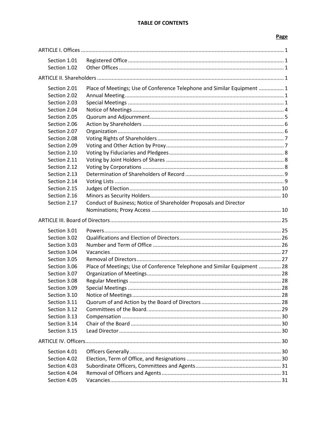 30 Section 3.13 Compensation. The board of directors shall have the authority to fix the compensation of directors for their services as directors, and a director may be a salaried officer of the corporation. Section 3.14 Chair of the Board. Except as otherwise provided by these bylaws or by action of the board of directors, the chair of the board shall preside at all meetings of the shareholders and of the board of directors. The chair of the board shall perform such other duties as may from time to time be requested by the board of directors. The chair of the board shall be chosen from among the directors and may be an employee of the corporation, but need not be so employed, and may hold any other office of the corporation as from time to time may be determined by the board of directors. Section 3.15 Lead Director. The board of directors shall have the authority to elect a Lead Director with the responsibilities set forth in the corporation’s corporate governance principles. ARTICLE IV. Officers Section 4.01 Officers Generally. (a) Number, Qualifications and Designation. The officers of the corporation shall include a president, one or more vice presidents (which term shall include vice presidents, executive vice presidents and senior vice presidents), a secretary, a treasurer, and a chief executive officer, as the board of directors may designate by resolution, and such other officers as may be elected in accordance with the provisions of Section 4.03. Officers may but need not be directors or shareholders of the corporation. Officers shall be natural persons of full age. Any number of offices may be held by the same person. (b) Bonding. The corporation may secure the fidelity of any or all of its officers by bond or otherwise. (c) Duties. An officer shall perform such officer’s duties as an officer in good faith, in a manner such officer reasonably believes to be in the best interests of the corporation and with such care, including reasonable inquiry, skill and diligence, as a person of ordinary prudence would use under similar circumstances. A person who so performs such person’s duties shall not be liable by reason of having been an officer of the corporation. Section 4.02 Election, Term of Office, and Resignations. (a) Election and Term of Office. The officers of the corporation, except those elected by delegated authority pursuant to Section 4.03, shall be elected by the board of directors, and each such officer shall hold office at the discretion of the board until his or her death, resignation, or removal with or without cause. (b) Resignations. Any officer may resign at any time upon written notice to the corporation. The resignation shall be effective upon receipt thereof by the corporation or at such subsequent time as may be specified in the notice of resignation.