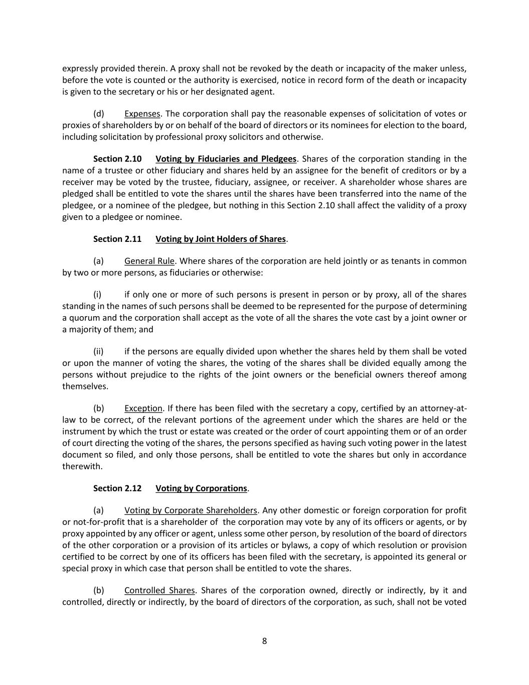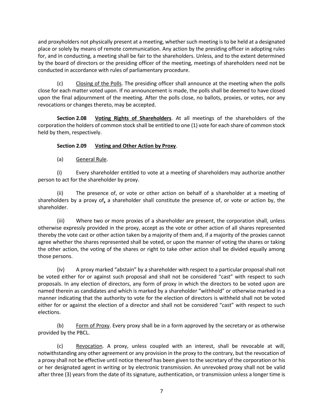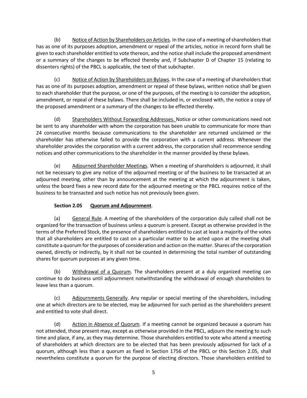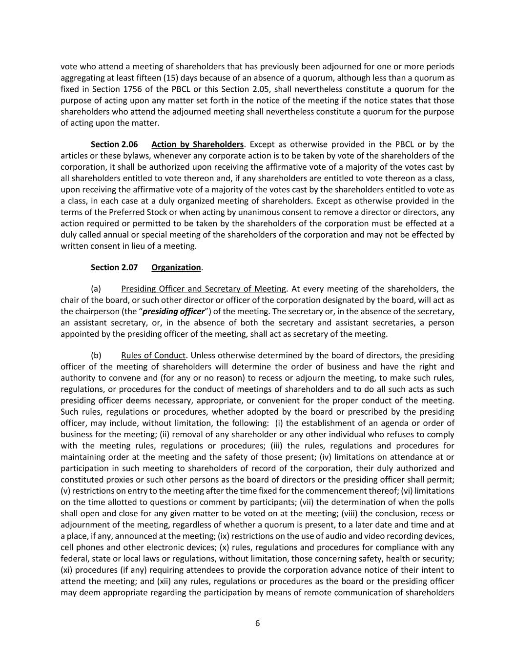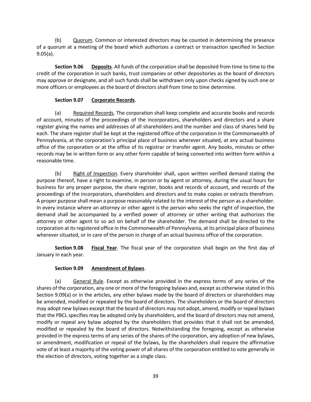 39 (b) Quorum. Common or interested directors may be counted in determining the presence of a quorum at a meeting of the board which authorizes a contract or transaction specified in Section 9.05(a). Section 9.06 Deposits. All funds of the corporation shall be deposited from time to time to the credit of the corporation in such banks, trust companies or other depositories as the board of directors may approve or designate, and all such funds shall be withdrawn only upon checks signed by such one or more officers or employees as the board of directors shall from time to time determine. Section 9.07 Corporate Records. (a) Required Records. The corporation shall keep complete and accurate books and records of account, minutes of the proceedings of the incorporators, shareholders and directors and a share register giving the names and addresses of all shareholders and the number and class of shares held by each. The share register shall be kept at the registered office of the corporation in the Commonwealth of Pennsylvania, at the corporation’s principal place of business wherever situated, at any actual business office of the corporation or at the office of its registrar or transfer agent. Any books, minutes or other records may be in written form or any other form capable of being converted into written form within a reasonable time. (b) Right of Inspection. Every shareholder shall, upon written verified demand stating the purpose thereof, have a right to examine, in person or by agent or attorney, during the usual hours for business for any proper purpose, the share register, books and records of account, and records of the proceedings of the incorporators, shareholders and directors and to make copies or extracts therefrom. A proper purpose shall mean a purpose reasonably related to the interest of the person as a shareholder. In every instance where an attorney or other agent is the person who seeks the right of inspection, the demand shall be accompanied by a verified power of attorney or other writing that authorizes the attorney or other agent to so act on behalf of the shareholder. The demand shall be directed to the corporation at its registered office in the Commonwealth of Pennsylvania, at its principal place of business wherever situated, or in care of the person in charge of an actual business office of the corporation. Section 9.08 Fiscal Year. The fiscal year of the corporation shall begin on the first day of January in each year. Section 9.09 Amendment of Bylaws. (a) General Rule. Except as otherwise provided in the express terms of any series of the shares of the corporation, any one or more of the foregoing bylaws and, except as otherwise stated in this Section 9.09(a) or in the articles, any other bylaws made by the board of directors or shareholders may be amended, modified or repealed by the board of directors. The shareholders or the board of directors may adopt new bylaws except that the board of directors may not adopt, amend, modify or repeal bylaws that the PBCL specifies may be adopted only by shareholders, and the board of directors may not amend, modify or repeal any bylaw adopted by the shareholders that provides that it shall not be amended, modified or repealed by the board of directors. Notwithstanding the foregoing, except as otherwise provided in the express terms of any series of the shares of the corporation, any adoption of new bylaws, or amendment, modification or repeal of the bylaws, by the shareholders shall require the affirmative vote of at least a majority of the voting power of all shares of the corporation entitled to vote generally in the election of directors, voting together as a single class.