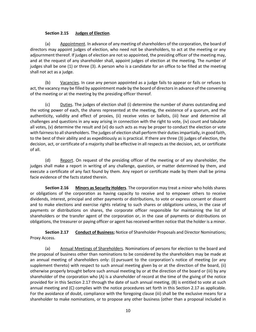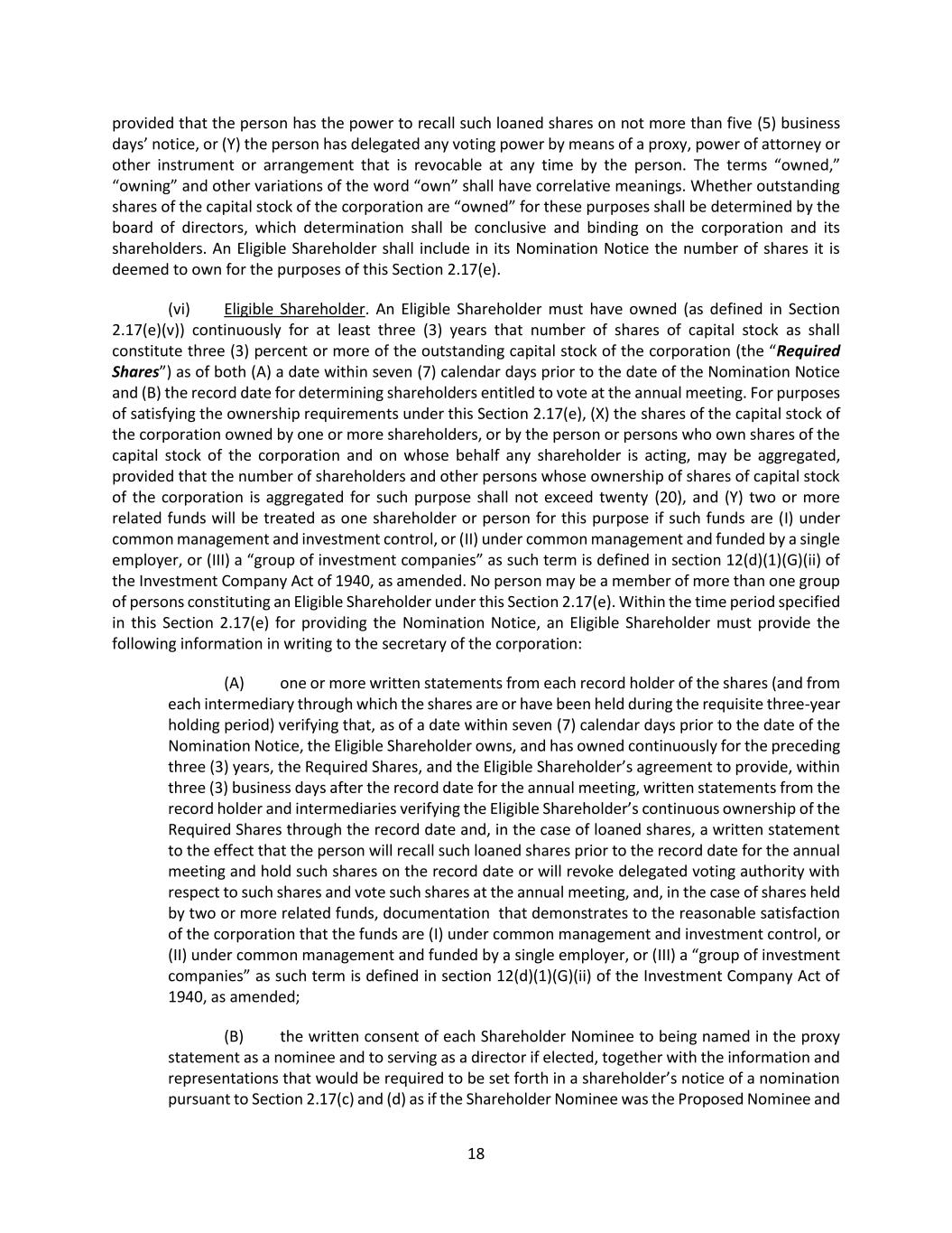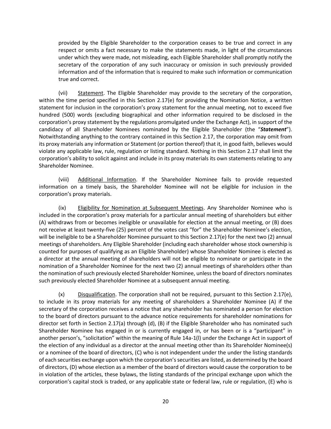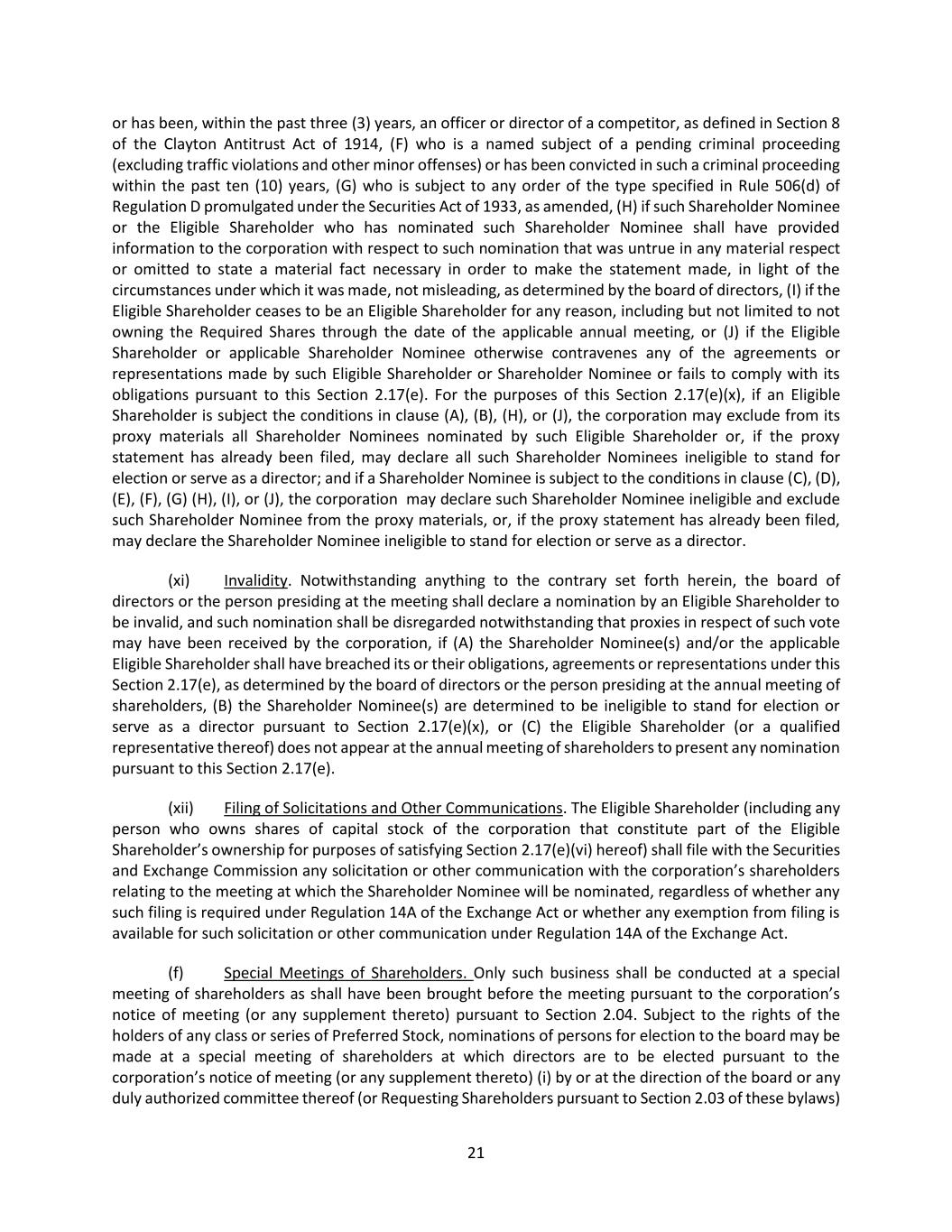 21 or has been, within the past three (3) years, an officer or director of a competitor, as defined in Section 8 of the Clayton Antitrust Act of 1914, (F) who is a named subject of a pending criminal proceeding (excluding traffic violations and other minor offenses) or has been convicted in such a criminal proceeding within the past ten (10) years, (G) who is subject to any order of the type specified in Rule 506(d) of Regulation D promulgated under the Securities Act of 1933, as amended, (H) if such Shareholder Nominee or the Eligible Shareholder who has nominated such Shareholder Nominee shall have provided information to the corporation with respect to such nomination that was untrue in any material respect or omitted to state a material fact necessary in order to make the statement made, in light of the circumstances under which it was made, not misleading, as determined by the board of directors, (I) if the Eligible Shareholder ceases to be an Eligible Shareholder for any reason, including but not limited to not owning the Required Shares through the date of the applicable annual meeting, or (J) if the Eligible Shareholder or applicable Shareholder Nominee otherwise contravenes any of the agreements or representations made by such Eligible Shareholder or Shareholder Nominee or fails to comply with its obligations pursuant to this Section 2.17(e). For the purposes of this Section 2.17(e)(x), if an Eligible Shareholder is subject the conditions in clause (A), (B), (H), or (J), the corporation may exclude from its proxy materials all Shareholder Nominees nominated by such Eligible Shareholder or, if the proxy statement has already been filed, may declare all such Shareholder Nominees ineligible to stand for election or serve as a director; and if a Shareholder Nominee is subject to the conditions in clause (C), (D), (E), (F), (G) (H), (I), or (J), the corporation may declare such Shareholder Nominee ineligible and exclude such Shareholder Nominee from the proxy materials, or, if the proxy statement has already been filed, may declare the Shareholder Nominee ineligible to stand for election or serve as a director. (xi) Invalidity. Notwithstanding anything to the contrary set forth herein, the board of directors or the person presiding at the meeting shall declare a nomination by an Eligible Shareholder to be invalid, and such nomination shall be disregarded notwithstanding that proxies in respect of such vote may have been received by the corporation, if (A) the Shareholder Nominee(s) and/or the applicable Eligible Shareholder shall have breached its or their obligations, agreements or representations under this Section 2.17(e), as determined by the board of directors or the person presiding at the annual meeting of shareholders, (B) the Shareholder Nominee(s) are determined to be ineligible to stand for election or serve as a director pursuant to Section 2.17(e)(x), or (C) the Eligible Shareholder (or a qualified representative thereof) does not appear at the annual meeting of shareholders to present any nomination pursuant to this Section 2.17(e). (xii) Filing of Solicitations and Other Communications. The Eligible Shareholder (including any person who owns shares of capital stock of the corporation that constitute part of the Eligible Shareholder’s ownership for purposes of satisfying Section 2.17(e)(vi) hereof) shall file with the Securities and Exchange Commission any solicitation or other communication with the corporation’s shareholders relating to the meeting at which the Shareholder Nominee will be nominated, regardless of whether any such filing is required under Regulation 14A of the Exchange Act or whether any exemption from filing is available for such solicitation or other communication under Regulation 14A of the Exchange Act. (f) Special Meetings of Shareholders. Only such business shall be conducted at a special meeting of shareholders as shall have been brought before the meeting pursuant to the corporation’s notice of meeting (or any supplement thereto) pursuant to Section 2.04. Subject to the rights of the holders of any class or series of Preferred Stock, nominations of persons for election to the board may be made at a special meeting of shareholders at which directors are to be elected pursuant to the corporation’s notice of meeting (or any supplement thereto) (i) by or at the direction of the board or any duly authorized committee thereof (or Requesting Shareholders pursuant to Section 2.03 of these bylaws)