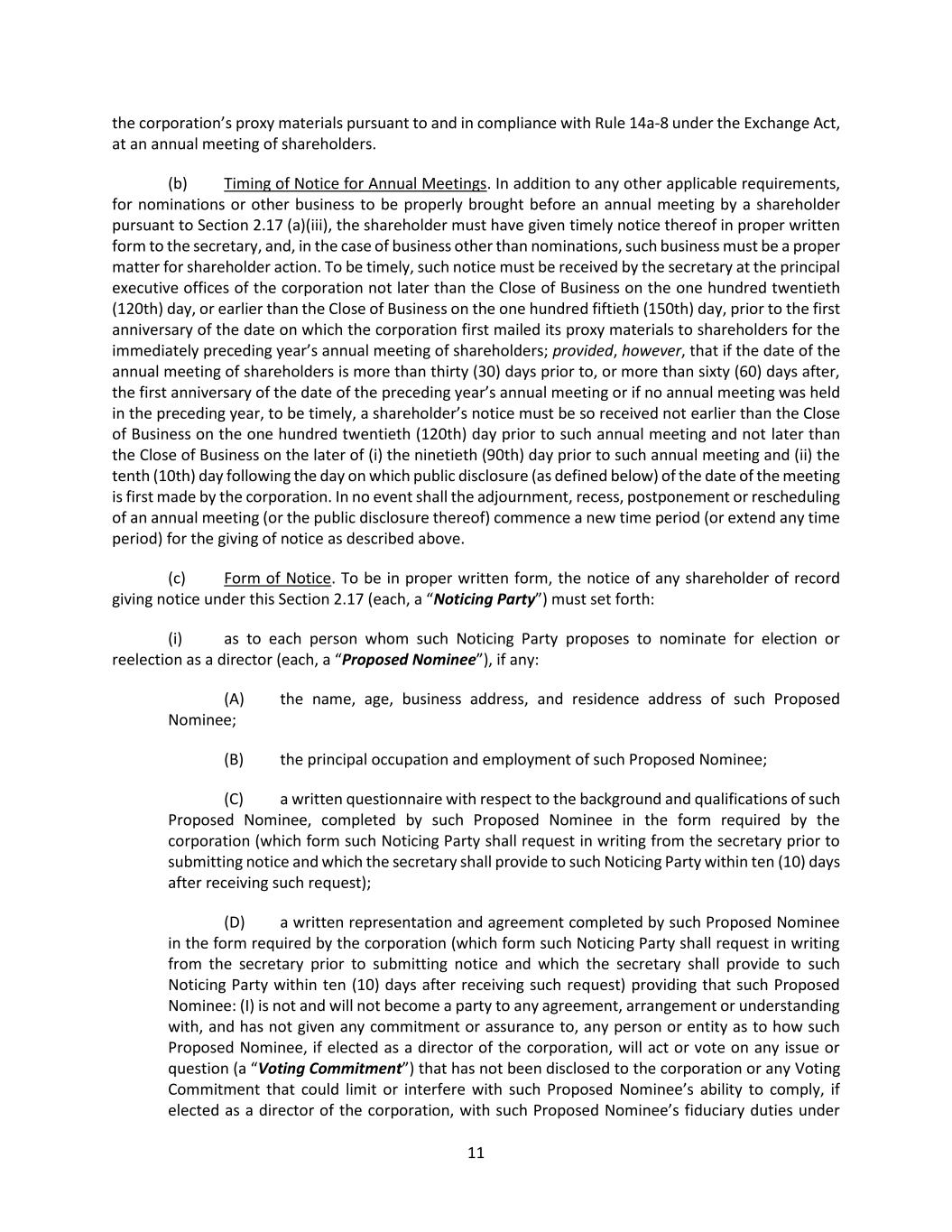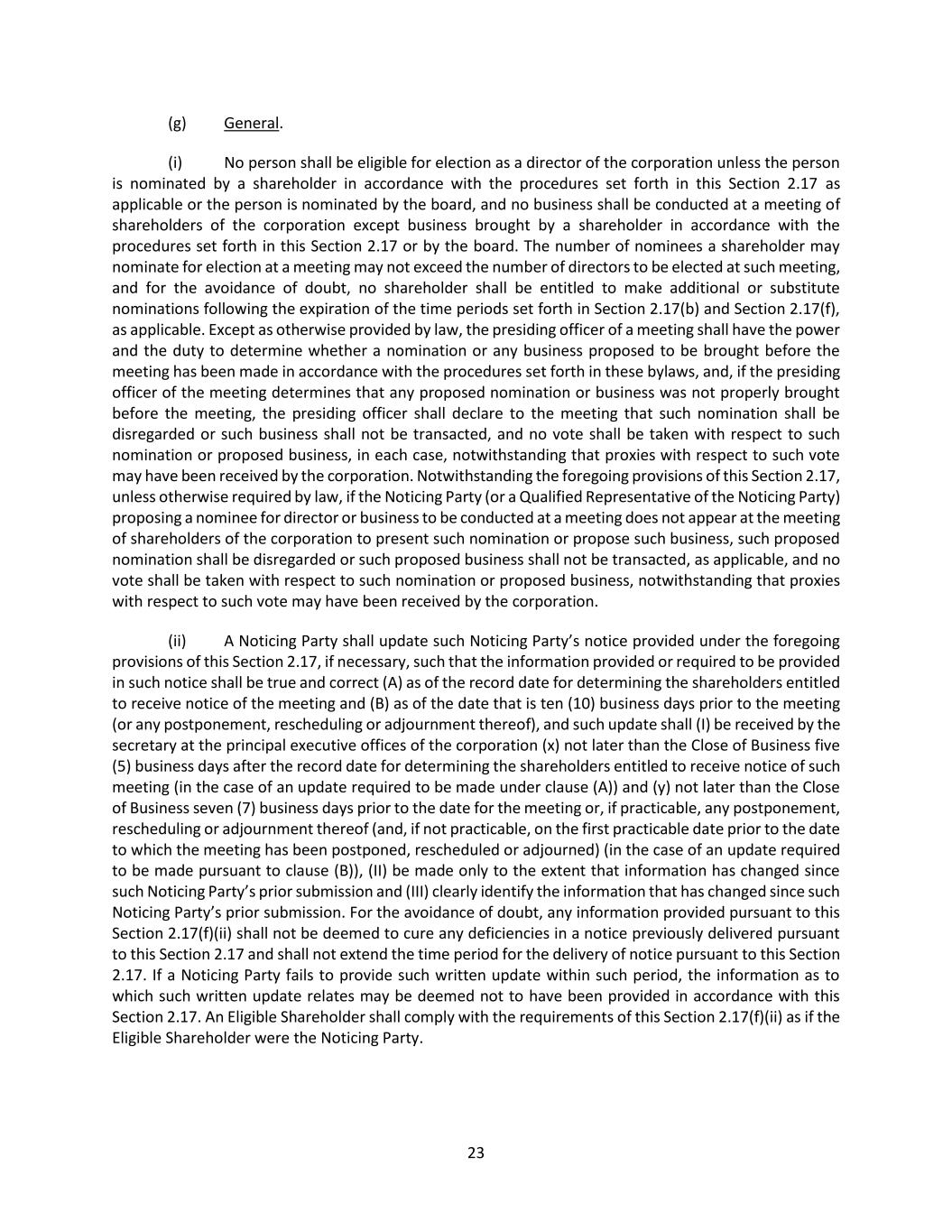 23 (g) General. (i) No person shall be eligible for election as a director of the corporation unless the person is nominated by a shareholder in accordance with the procedures set forth in this Section 2.17 as applicable or the person is nominated by the board, and no business shall be conducted at a meeting of shareholders of the corporation except business brought by a shareholder in accordance with the procedures set forth in this Section 2.17 or by the board. The number of nominees a shareholder may nominate for election at a meeting may not exceed the number of directors to be elected at such meeting, and for the avoidance of doubt, no shareholder shall be entitled to make additional or substitute nominations following the expiration of the time periods set forth in Section 2.17(b) and Section 2.17(f), as applicable. Except as otherwise provided by law, the presiding officer of a meeting shall have the power and the duty to determine whether a nomination or any business proposed to be brought before the meeting has been made in accordance with the procedures set forth in these bylaws, and, if the presiding officer of the meeting determines that any proposed nomination or business was not properly brought before the meeting, the presiding officer shall declare to the meeting that such nomination shall be disregarded or such business shall not be transacted, and no vote shall be taken with respect to such nomination or proposed business, in each case, notwithstanding that proxies with respect to such vote may have been received by the corporation. Notwithstanding the foregoing provisions of this Section 2.17, unless otherwise required by law, if the Noticing Party (or a Qualified Representative of the Noticing Party) proposing a nominee for director or business to be conducted at a meeting does not appear at the meeting of shareholders of the corporation to present such nomination or propose such business, such proposed nomination shall be disregarded or such proposed business shall not be transacted, as applicable, and no vote shall be taken with respect to such nomination or proposed business, notwithstanding that proxies with respect to such vote may have been received by the corporation. (ii) A Noticing Party shall update such Noticing Party’s notice provided under the foregoing provisions of this Section 2.17, if necessary, such that the information provided or required to be provided in such notice shall be true and correct (A) as of the record date for determining the shareholders entitled to receive notice of the meeting and (B) as of the date that is ten (10) business days prior to the meeting (or any postponement, rescheduling or adjournment thereof), and such update shall (I) be received by the secretary at the principal executive offices of the corporation (x) not later than the Close of Business five (5) business days after the record date for determining the shareholders entitled to receive notice of such meeting (in the case of an update required to be made under clause (A)) and (y) not later than the Close of Business seven (7) business days prior to the date for the meeting or, if practicable, any postponement, rescheduling or adjournment thereof (and, if not practicable, on the first practicable date prior to the date to which the meeting has been postponed, rescheduled or adjourned) (in the case of an update required to be made pursuant to clause (B)), (II) be made only to the extent that information has changed since such Noticing Party’s prior submission and (III) clearly identify the information that has changed since such Noticing Party’s prior submission. For the avoidance of doubt, any information provided pursuant to this Section 2.17(f)(ii) shall not be deemed to cure any deficiencies in a notice previously delivered pursuant to this Section 2.17 and shall not extend the time period for the delivery of notice pursuant to this Section 2.17. If a Noticing Party fails to provide such written update within such period, the information as to which such written update relates may be deemed not to have been provided in accordance with this Section 2.17. An Eligible Shareholder shall comply with the requirements of this Section 2.17(f)(ii) as if the Eligible Shareholder were the Noticing Party.