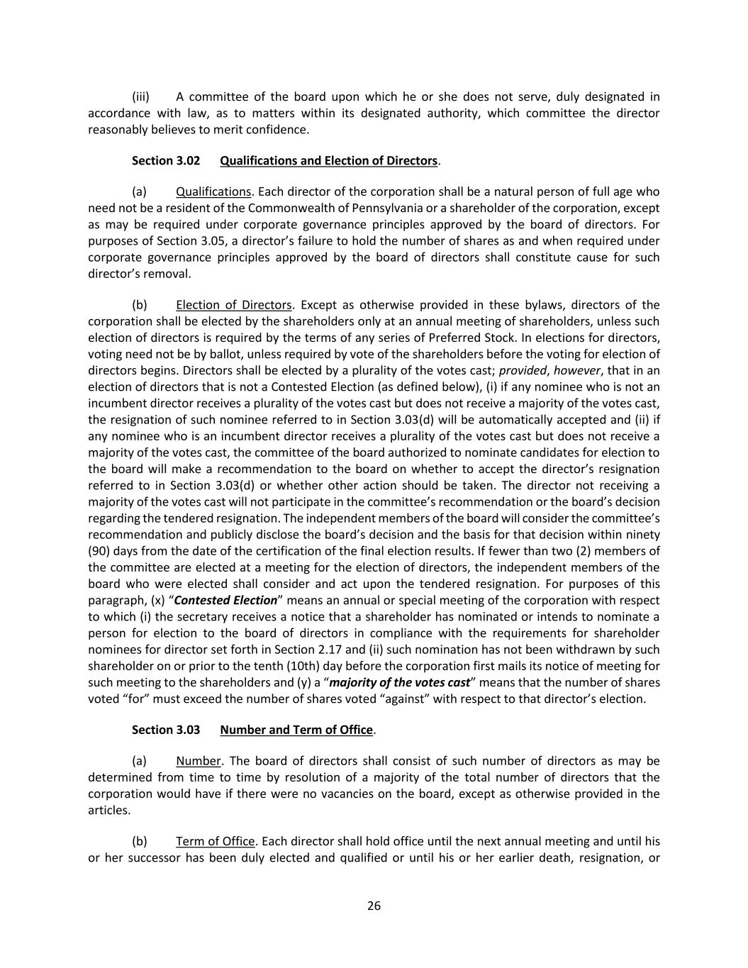 26 (iii) A committee of the board upon which he or she does not serve, duly designated in accordance with law, as to matters within its designated authority, which committee the director reasonably believes to merit confidence. Section 3.02 Qualifications and Election of Directors. (a) Qualifications. Each director of the corporation shall be a natural person of full age who need not be a resident of the Commonwealth of Pennsylvania or a shareholder of the corporation, except as may be required under corporate governance principles approved by the board of directors. For purposes of Section 3.05, a director’s failure to hold the number of shares as and when required under corporate governance principles approved by the board of directors shall constitute cause for such director’s removal. (b) Election of Directors. Except as otherwise provided in these bylaws, directors of the corporation shall be elected by the shareholders only at an annual meeting of shareholders, unless such election of directors is required by the terms of any series of Preferred Stock. In elections for directors, voting need not be by ballot, unless required by vote of the shareholders before the voting for election of directors begins. Directors shall be elected by a plurality of the votes cast; provided, however, that in an election of directors that is not a Contested Election (as defined below), (i) if any nominee who is not an incumbent director receives a plurality of the votes cast but does not receive a majority of the votes cast, the resignation of such nominee referred to in Section 3.03(d) will be automatically accepted and (ii) if any nominee who is an incumbent director receives a plurality of the votes cast but does not receive a majority of the votes cast, the committee of the board authorized to nominate candidates for election to the board will make a recommendation to the board on whether to accept the director’s resignation referred to in Section 3.03(d) or whether other action should be taken. The director not receiving a majority of the votes cast will not participate in the committee’s recommendation or the board’s decision regarding the tendered resignation. The independent members of the board will consider the committee’s recommendation and publicly disclose the board’s decision and the basis for that decision within ninety (90) days from the date of the certification of the final election results. If fewer than two (2) members of the committee are elected at a meeting for the election of directors, the independent members of the board who were elected shall consider and act upon the tendered resignation. For purposes of this paragraph, (x) “Contested Election” means an annual or special meeting of the corporation with respect to which (i) the secretary receives a notice that a shareholder has nominated or intends to nominate a person for election to the board of directors in compliance with the requirements for shareholder nominees for director set forth in Section 2.17 and (ii) such nomination has not been withdrawn by such shareholder on or prior to the tenth (10th) day before the corporation first mails its notice of meeting for such meeting to the shareholders and (y) a “majority of the votes cast” means that the number of shares voted “for” must exceed the number of shares voted “against” with respect to that director’s election. Section 3.03 Number and Term of Office. (a) Number. The board of directors shall consist of such number of directors as may be determined from time to time by resolution of a majority of the total number of directors that the corporation would have if there were no vacancies on the board, except as otherwise provided in the articles. (b) Term of Office. Each director shall hold office until the next annual meeting and until his or her successor has been duly elected and qualified or until his or her earlier death, resignation, or