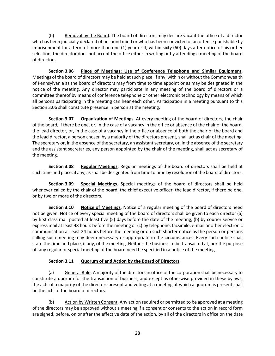28 (b) Removal by the Board. The board of directors may declare vacant the office of a director who has been judicially declared of unsound mind or who has been convicted of an offense punishable by imprisonment for a term of more than one (1) year or if, within sixty (60) days after notice of his or her selection, the director does not accept the office either in writing or by attending a meeting of the board of directors. Section 3.06 Place of Meetings; Use of Conference Telephone and Similar Equipment. Meetings of the board of directors may be held at such place, if any, within or without the Commonwealth of Pennsylvania as the board of directors may from time to time appoint or as may be designated in the notice of the meeting. Any director may participate in any meeting of the board of directors or a committee thereof by means of conference telephone or other electronic technology by means of which all persons participating in the meeting can hear each other. Participation in a meeting pursuant to this Section 3.06 shall constitute presence in person at the meeting. Section 3.07 Organization of Meetings. At every meeting of the board of directors, the chair of the board, if there be one, or, in the case of a vacancy in the office or absence of the chair of the board, the lead director, or, in the case of a vacancy in the office or absence of both the chair of the board and the lead director, a person chosen by a majority of the directors present, shall act as chair of the meeting. The secretary or, in the absence of the secretary, an assistant secretary, or, in the absence of the secretary and the assistant secretaries, any person appointed by the chair of the meeting, shall act as secretary of the meeting. Section 3.08 Regular Meetings. Regular meetings of the board of directors shall be held at such time and place, if any, as shall be designated from time to time by resolution of the board of directors. Section 3.09 Special Meetings. Special meetings of the board of directors shall be held whenever called by the chair of the board, the chief executive officer, the lead director, if there be one, or by two or more of the directors. Section 3.10 Notice of Meetings. Notice of a regular meeting of the board of directors need not be given. Notice of every special meeting of the board of directors shall be given to each director (a) by first class mail posted at least five (5) days before the date of the meeting, (b) by courier service or express mail at least 48 hours before the meeting or (c) by telephone, facsimile, e-mail or other electronic communication at least 24 hours before the meeting or on such shorter notice as the person or persons calling such meeting may deem necessary or appropriate in the circumstances. Every such notice shall state the time and place, if any, of the meeting. Neither the business to be transacted at, nor the purpose of, any regular or special meeting of the board need be specified in a notice of the meeting. Section 3.11 Quorum of and Action by the Board of Directors. (a) General Rule. A majority of the directors in office of the corporation shall be necessary to constitute a quorum for the transaction of business, and except as otherwise provided in these bylaws, the acts of a majority of the directors present and voting at a meeting at which a quorum is present shall be the acts of the board of directors. (b) Action by Written Consent. Any action required or permitted to be approved at a meeting of the directors may be approved without a meeting if a consent or consents to the action in record form are signed, before, on or after the effective date of the action, by all of the directors in office on the date