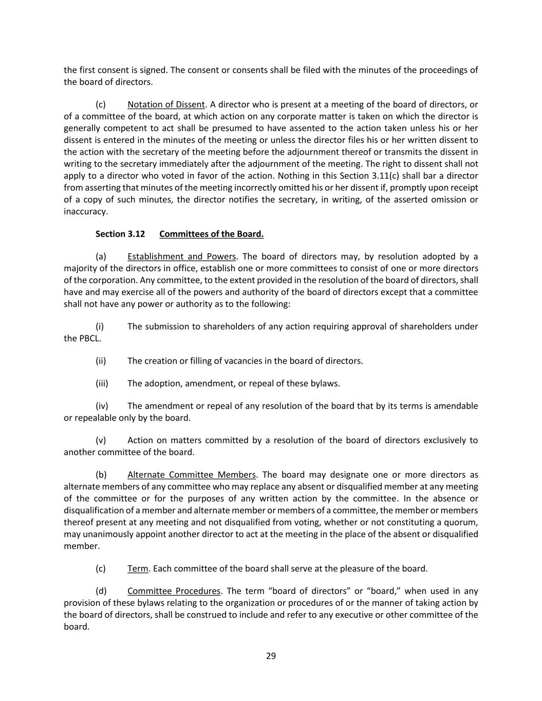 29 the first consent is signed. The consent or consents shall be filed with the minutes of the proceedings of the board of directors. (c) Notation of Dissent. A director who is present at a meeting of the board of directors, or of a committee of the board, at which action on any corporate matter is taken on which the director is generally competent to act shall be presumed to have assented to the action taken unless his or her dissent is entered in the minutes of the meeting or unless the director files his or her written dissent to the action with the secretary of the meeting before the adjournment thereof or transmits the dissent in writing to the secretary immediately after the adjournment of the meeting. The right to dissent shall not apply to a director who voted in favor of the action. Nothing in this Section 3.11(c) shall bar a director from asserting that minutes of the meeting incorrectly omitted his or her dissent if, promptly upon receipt of a copy of such minutes, the director notifies the secretary, in writing, of the asserted omission or inaccuracy. Section 3.12 Committees of the Board. (a) Establishment and Powers. The board of directors may, by resolution adopted by a majority of the directors in office, establish one or more committees to consist of one or more directors of the corporation. Any committee, to the extent provided in the resolution of the board of directors, shall have and may exercise all of the powers and authority of the board of directors except that a committee shall not have any power or authority as to the following: (i) The submission to shareholders of any action requiring approval of shareholders under the PBCL. (ii) The creation or filling of vacancies in the board of directors. (iii) The adoption, amendment, or repeal of these bylaws. (iv) The amendment or repeal of any resolution of the board that by its terms is amendable or repealable only by the board. (v) Action on matters committed by a resolution of the board of directors exclusively to another committee of the board. (b) Alternate Committee Members. The board may designate one or more directors as alternate members of any committee who may replace any absent or disqualified member at any meeting of the committee or for the purposes of any written action by the committee. In the absence or disqualification of a member and alternate member or members of a committee, the member or members thereof present at any meeting and not disqualified from voting, whether or not constituting a quorum, may unanimously appoint another director to act at the meeting in the place of the absent or disqualified member. (c) Term. Each committee of the board shall serve at the pleasure of the board. (d) Committee Procedures. The term “board of directors” or “board,” when used in any provision of these bylaws relating to the organization or procedures of or the manner of taking action by the board of directors, shall be construed to include and refer to any executive or other committee of the board.