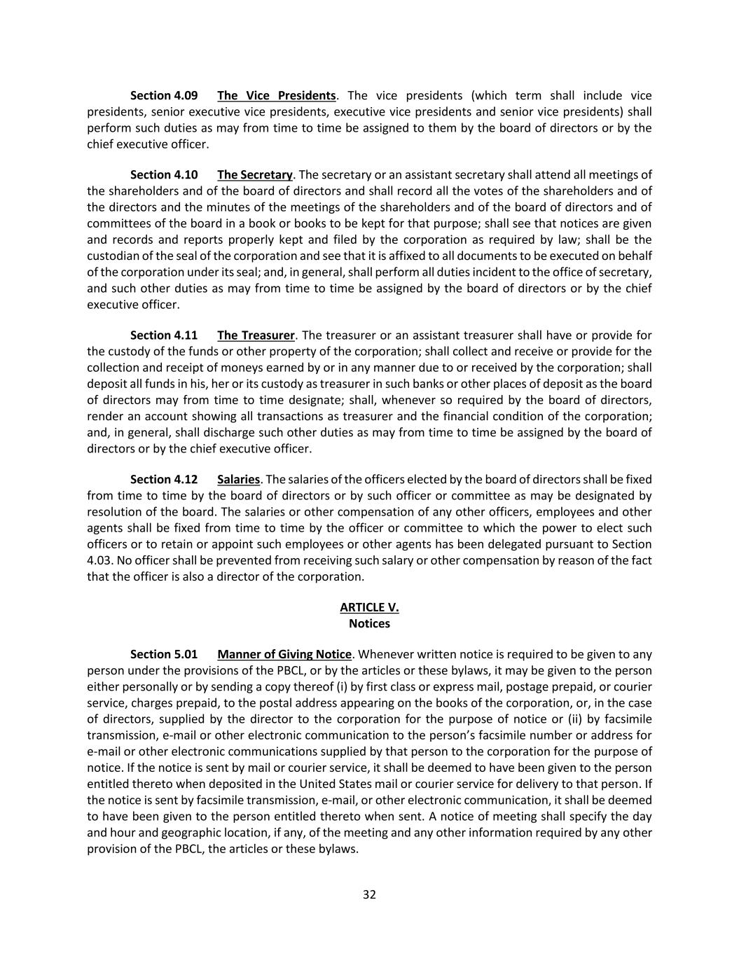 31 Section 4.03 Subordinate Officers, Committees and Agents. The board of directors may from time to time elect such other officers and appoint such committees, employees or other agents as the business of the corporation may require, including without limitation, one or more vice presidents, one or more assistant secretaries and one or more assistant treasurers, each of whom shall hold office for such period, have such authority and perform such duties as are provided in these bylaws or as the board of directors may from time to time determine. The board of directors may delegate to any officer or committee the power to elect subordinate officers and to retain or appoint employees or other agents, or committees thereof, and to prescribe the authority and duties of such subordinate officers, committees, employees, or other agents. Section 4.04 Removal of Officers and Agents. Any officer or agent of the corporation may be removed by the board of directors with or without cause. The removal shall be without prejudice to the contract rights, if any, of any person so removed. Election or appointment of an officer or agent shall not of itself create contract rights. Section 4.05 Vacancies. A vacancy in any office because of death, resignation, removal, disqualification, or any other cause, may be filled by the board of directors or by the officer or committee to which the power to fill such office has been delegated pursuant to Section 4.03, as the case may be, and if the office is one for which these bylaws prescribe a term, shall be filled for the unexpired portion of the term. Section 4.06 Authority. (a) General Rule. All officers of the corporation, as between themselves and the corporation, shall have such authority and perform such duties in the management of the corporation as may be provided by or pursuant to these bylaws or, in the absence of controlling provisions in these bylaws, as may be determined by or pursuant to resolutions or orders of the board of directors. (b) Chief Executive Officer. The board of directors shall designate from time to time by resolution a chief executive officer. Such chief executive officer may be, but need not be, the president or chair of the board. Section 4.07 The Chief Executive Officer. The chief executive officer may have general supervision over the business and operations of the corporation, subject however, to the control of the board of directors. The chief executive officer may sign, execute and acknowledge, in the name of the corporation, deeds, mortgages, bonds, contracts or other instruments, authorized by the board of directors, except in cases where the signing and execution thereof shall be expressly delegated by the board of directors, or by these bylaws, to some other officer or agent of the corporation and, in general, may perform all duties incident to the office of chief executive officer and such other duties as from time to time may be assigned by the board of directors. Section 4.08 The President. The president may have general supervision over the business and operations of the corporation, subject however, to the control of the board of directors and the chief executive officer, as applicable. The president may sign, execute and acknowledge, in the name of the corporation, deeds, mortgages, bonds, contracts or other instruments, authorized by the board of directors, except in cases where the signing and execution thereof shall be expressly delegated by the board of directors, or by these bylaws, to some other officer or agent of the corporation and, in general, may perform all duties incident to the office of president and such other duties as from time to time may be assigned by the board of directors or the chief executive officer.