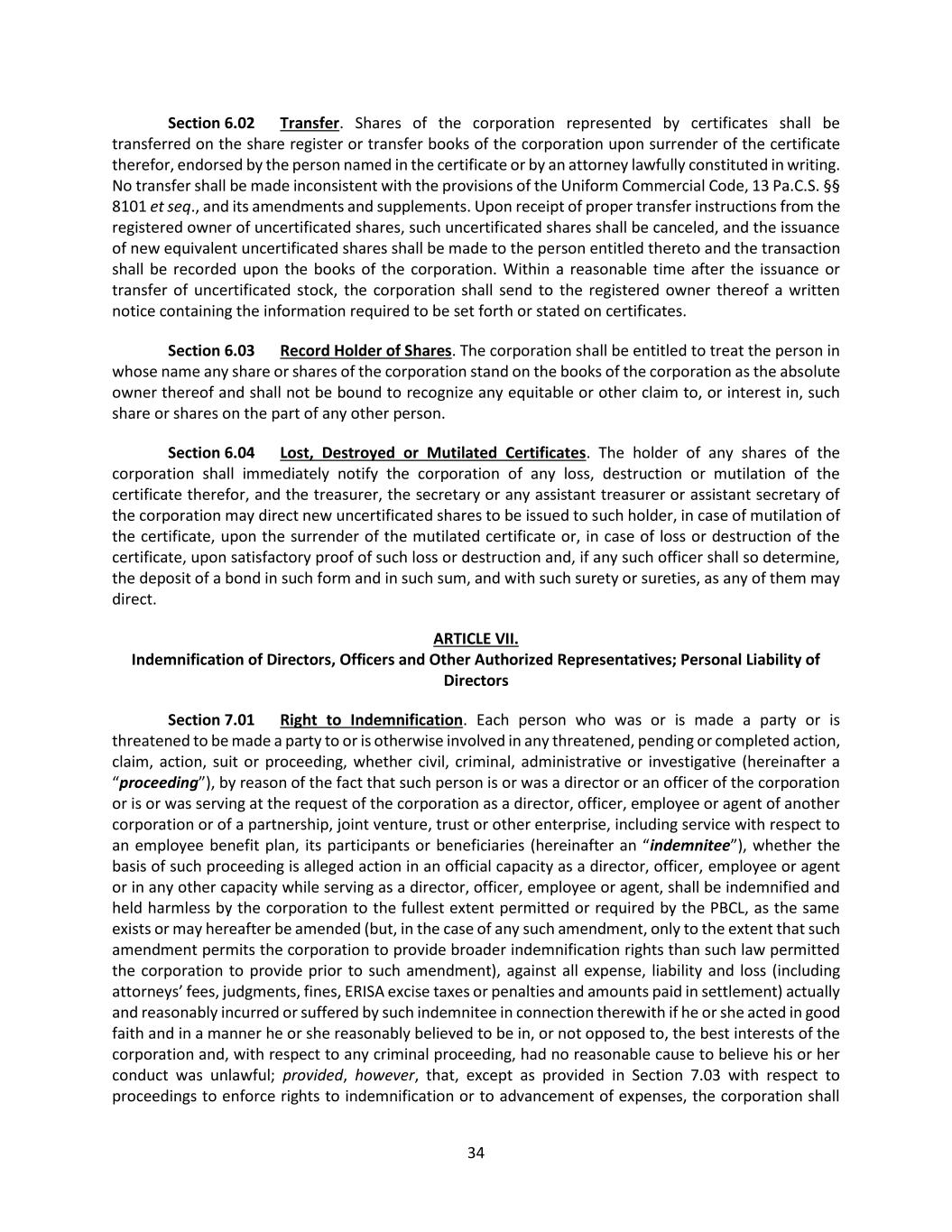 34 Section 6.02 Transfer. Shares of the corporation represented by certificates shall be transferred on the share register or transfer books of the corporation upon surrender of the certificate therefor, endorsed by the person named in the certificate or by an attorney lawfully constituted in writing. No transfer shall be made inconsistent with the provisions of the Uniform Commercial Code, 13 Pa.C.S. §§ 8101 et seq., and its amendments and supplements. Upon receipt of proper transfer instructions from the registered owner of uncertificated shares, such uncertificated shares shall be canceled, and the issuance of new equivalent uncertificated shares shall be made to the person entitled thereto and the transaction shall be recorded upon the books of the corporation. Within a reasonable time after the issuance or transfer of uncertificated stock, the corporation shall send to the registered owner thereof a written notice containing the information required to be set forth or stated on certificates. Section 6.03 Record Holder of Shares. The corporation shall be entitled to treat the person in whose name any share or shares of the corporation stand on the books of the corporation as the absolute owner thereof and shall not be bound to recognize any equitable or other claim to, or interest in, such share or shares on the part of any other person. Section 6.04 Lost, Destroyed or Mutilated Certificates. The holder of any shares of the corporation shall immediately notify the corporation of any loss, destruction or mutilation of the certificate therefor, and the treasurer, the secretary or any assistant treasurer or assistant secretary of the corporation may direct new uncertificated shares to be issued to such holder, in case of mutilation of the certificate, upon the surrender of the mutilated certificate or, in case of loss or destruction of the certificate, upon satisfactory proof of such loss or destruction and, if any such officer shall so determine, the deposit of a bond in such form and in such sum, and with such surety or sureties, as any of them may direct. ARTICLE VII. Indemnification of Directors, Officers and Other Authorized Representatives; Personal Liability of Directors Section 7.01 Right to Indemnification. Each person who was or is made a party or is threatened to be made a party to or is otherwise involved in any threatened, pending or completed action, claim, action, suit or proceeding, whether civil, criminal, administrative or investigative (hereinafter a “proceeding”), by reason of the fact that such person is or was a director or an officer of the corporation or is or was serving at the request of the corporation as a director, officer, employee or agent of another corporation or of a partnership, joint venture, trust or other enterprise, including service with respect to an employee benefit plan, its participants or beneficiaries (hereinafter an “indemnitee”), whether the basis of such proceeding is alleged action in an official capacity as a director, officer, employee or agent or in any other capacity while serving as a director, officer, employee or agent, shall be indemnified and held harmless by the corporation to the fullest extent permitted or required by the PBCL, as the same exists or may hereafter be amended (but, in the case of any such amendment, only to the extent that such amendment permits the corporation to provide broader indemnification rights than such law permitted the corporation to provide prior to such amendment), against all expense, liability and loss (including attorneys’ fees, judgments, fines, ERISA excise taxes or penalties and amounts paid in settlement) actually and reasonably incurred or suffered by such indemnitee in connection therewith if he or she acted in good faith and in a manner he or she reasonably believed to be in, or not opposed to, the best interests of the corporation and, with respect to any criminal proceeding, had no reasonable cause to believe his or her conduct was unlawful; provided, however, that, except as provided in Section 7.03 with respect to proceedings to enforce rights to indemnification or to advancement of expenses, the corporation shall