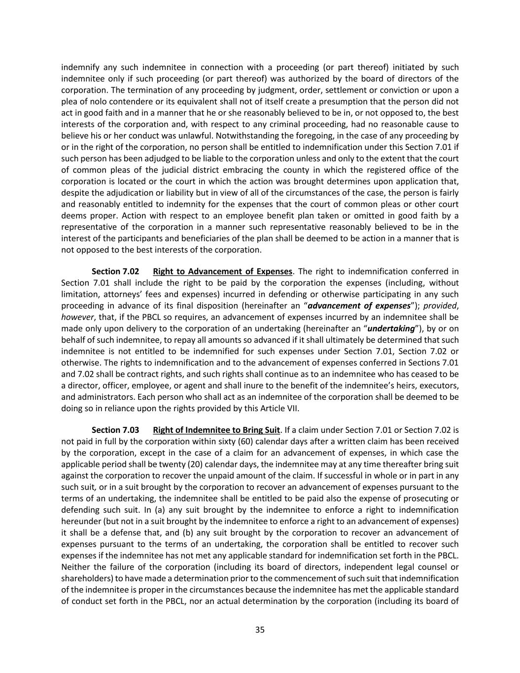 35 indemnify any such indemnitee in connection with a proceeding (or part thereof) initiated by such indemnitee only if such proceeding (or part thereof) was authorized by the board of directors of the corporation. The termination of any proceeding by judgment, order, settlement or conviction or upon a plea of nolo contendere or its equivalent shall not of itself create a presumption that the person did not act in good faith and in a manner that he or she reasonably believed to be in, or not opposed to, the best interests of the corporation and, with respect to any criminal proceeding, had no reasonable cause to believe his or her conduct was unlawful. Notwithstanding the foregoing, in the case of any proceeding by or in the right of the corporation, no person shall be entitled to indemnification under this Section 7.01 if such person has been adjudged to be liable to the corporation unless and only to the extent that the court of common pleas of the judicial district embracing the county in which the registered office of the corporation is located or the court in which the action was brought determines upon application that, despite the adjudication or liability but in view of all of the circumstances of the case, the person is fairly and reasonably entitled to indemnity for the expenses that the court of common pleas or other court deems proper. Action with respect to an employee benefit plan taken or omitted in good faith by a representative of the corporation in a manner such representative reasonably believed to be in the interest of the participants and beneficiaries of the plan shall be deemed to be action in a manner that is not opposed to the best interests of the corporation. Section 7.02 Right to Advancement of Expenses. The right to indemnification conferred in Section 7.01 shall include the right to be paid by the corporation the expenses (including, without limitation, attorneys’ fees and expenses) incurred in defending or otherwise participating in any such proceeding in advance of its final disposition (hereinafter an “advancement of expenses”); provided, however, that, if the PBCL so requires, an advancement of expenses incurred by an indemnitee shall be made only upon delivery to the corporation of an undertaking (hereinafter an “undertaking”), by or on behalf of such indemnitee, to repay all amounts so advanced if it shall ultimately be determined that such indemnitee is not entitled to be indemnified for such expenses under Section 7.01, Section 7.02 or otherwise. The rights to indemnification and to the advancement of expenses conferred in Sections 7.01 and 7.02 shall be contract rights, and such rights shall continue as to an indemnitee who has ceased to be a director, officer, employee, or agent and shall inure to the benefit of the indemnitee’s heirs, executors, and administrators. Each person who shall act as an indemnitee of the corporation shall be deemed to be doing so in reliance upon the rights provided by this Article VII. Section 7.03 Right of Indemnitee to Bring Suit. If a claim under Section 7.01 or Section 7.02 is not paid in full by the corporation within sixty (60) calendar days after a written claim has been received by the corporation, except in the case of a claim for an advancement of expenses, in which case the applicable period shall be twenty (20) calendar days, the indemnitee may at any time thereafter bring suit against the corporation to recover the unpaid amount of the claim. If successful in whole or in part in any such suit, or in a suit brought by the corporation to recover an advancement of expenses pursuant to the terms of an undertaking, the indemnitee shall be entitled to be paid also the expense of prosecuting or defending such suit. In (a) any suit brought by the indemnitee to enforce a right to indemnification hereunder (but not in a suit brought by the indemnitee to enforce a right to an advancement of expenses) it shall be a defense that, and (b) any suit brought by the corporation to recover an advancement of expenses pursuant to the terms of an undertaking, the corporation shall be entitled to recover such expenses if the indemnitee has not met any applicable standard for indemnification set forth in the PBCL. Neither the failure of the corporation (including its board of directors, independent legal counsel or shareholders) to have made a determination prior to the commencement of such suit that indemnification of the indemnitee is proper in the circumstances because the indemnitee has met the applicable standard of conduct set forth in the PBCL, nor an actual determination by the corporation (including its board of