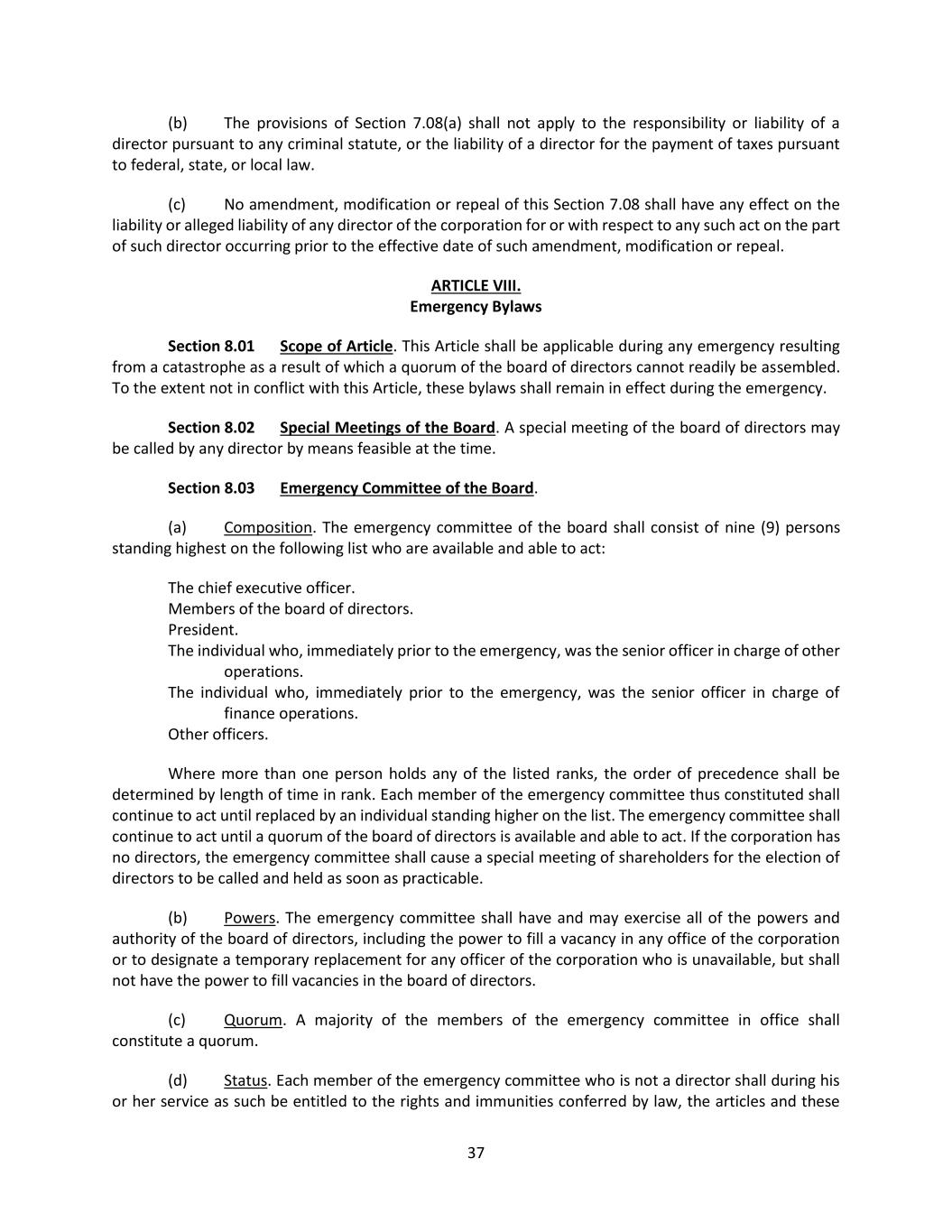 37 (b) The provisions of Section 7.08(a) shall not apply to the responsibility or liability of a director pursuant to any criminal statute, or the liability of a director for the payment of taxes pursuant to federal, state, or local law. (c) No amendment, modification or repeal of this Section 7.08 shall have any effect on the liability or alleged liability of any director of the corporation for or with respect to any such act on the part of such director occurring prior to the effective date of such amendment, modification or repeal. ARTICLE VIII. Emergency Bylaws Section 8.01 Scope of Article. This Article shall be applicable during any emergency resulting from a catastrophe as a result of which a quorum of the board of directors cannot readily be assembled. To the extent not in conflict with this Article, these bylaws shall remain in effect during the emergency. Section 8.02 Special Meetings of the Board. A special meeting of the board of directors may be called by any director by means feasible at the time. Section 8.03 Emergency Committee of the Board. (a) Composition. The emergency committee of the board shall consist of nine (9) persons standing highest on the following list who are available and able to act: The chief executive officer. Members of the board of directors. President. The individual who, immediately prior to the emergency, was the senior officer in charge of other operations. The individual who, immediately prior to the emergency, was the senior officer in charge of finance operations. Other officers. Where more than one person holds any of the listed ranks, the order of precedence shall be determined by length of time in rank. Each member of the emergency committee thus constituted shall continue to act until replaced by an individual standing higher on the list. The emergency committee shall continue to act until a quorum of the board of directors is available and able to act. If the corporation has no directors, the emergency committee shall cause a special meeting of shareholders for the election of directors to be called and held as soon as practicable. (b) Powers. The emergency committee shall have and may exercise all of the powers and authority of the board of directors, including the power to fill a vacancy in any office of the corporation or to designate a temporary replacement for any officer of the corporation who is unavailable, but shall not have the power to fill vacancies in the board of directors. (c) Quorum. A majority of the members of the emergency committee in office shall constitute a quorum. (d) Status. Each member of the emergency committee who is not a director shall during his or her service as such be entitled to the rights and immunities conferred by law, the articles and these