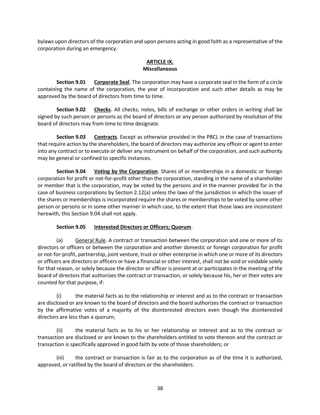 38 bylaws upon directors of the corporation and upon persons acting in good faith as a representative of the corporation during an emergency. ARTICLE IX. Miscellaneous Section 9.01 Corporate Seal. The corporation may have a corporate seal in the form of a circle containing the name of the corporation, the year of incorporation and such other details as may be approved by the board of directors from time to time. Section 9.02 Checks. All checks, notes, bills of exchange or other orders in writing shall be signed by such person or persons as the board of directors or any person authorized by resolution of the board of directors may from time to time designate. Section 9.03 Contracts. Except as otherwise provided in the PBCL in the case of transactions that require action by the shareholders, the board of directors may authorize any officer or agent to enter into any contract or to execute or deliver any instrument on behalf of the corporation, and such authority may be general or confined to specific instances. Section 9.04 Voting by the Corporation. Shares of or memberships in a domestic or foreign corporation for profit or not-for-profit other than the corporation, standing in the name of a shareholder or member that is the corporation, may be voted by the persons and in the manner provided for in the case of business corporations by Section 2.12(a) unless the laws of the jurisdiction in which the issuer of the shares or memberships is incorporated require the shares or memberships to be voted by some other person or persons or in some other manner in which case, to the extent that those laws are inconsistent herewith, this Section 9.04 shall not apply. Section 9.05 Interested Directors or Officers; Quorum. (a) General Rule. A contract or transaction between the corporation and one or more of its directors or officers or between the corporation and another domestic or foreign corporation for profit or not-for-profit, partnership, joint venture, trust or other enterprise in which one or more of its directors or officers are directors or officers or have a financial or other interest, shall not be void or voidable solely for that reason, or solely because the director or officer is present at or participates in the meeting of the board of directors that authorizes the contract or transaction, or solely because his, her or their votes are counted for that purpose, if: (i) the material facts as to the relationship or interest and as to the contract or transaction are disclosed or are known to the board of directors and the board authorizes the contract or transaction by the affirmative votes of a majority of the disinterested directors even though the disinterested directors are less than a quorum; (ii) the material facts as to his or her relationship or interest and as to the contract or transaction are disclosed or are known to the shareholders entitled to vote thereon and the contract or transaction is specifically approved in good faith by vote of those shareholders; or (iii) the contract or transaction is fair as to the corporation as of the time it is authorized, approved, or ratified by the board of directors or the shareholders.