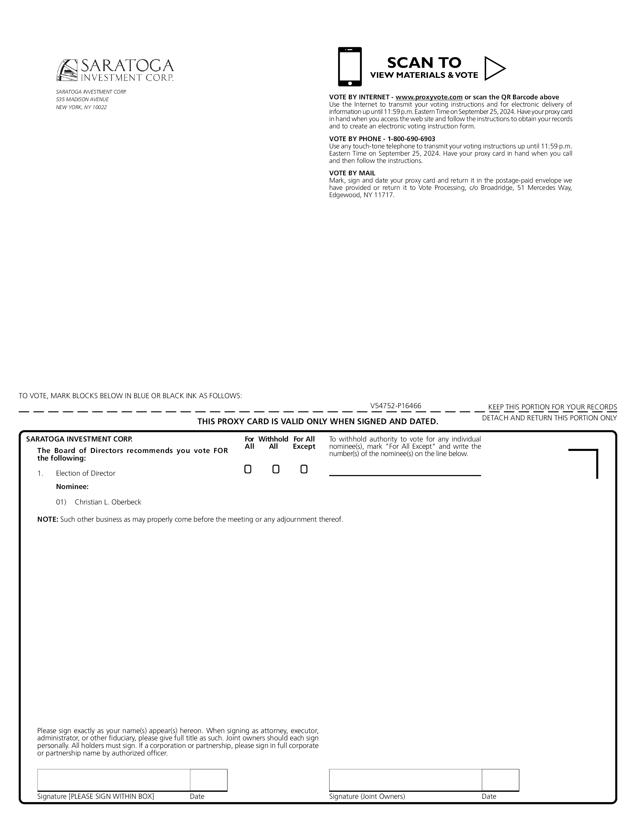 SARATOGA INVESTMENT CORP.535 MADISON AVENUE NEW YORK, NY 10022 SCAN TO VIEW MATERIALS & VOTE VOTE BY INTERNET www.proxyvote.com or scan the QR Barcode above Use the Internet to transmit your voting instructions and for electronic delivery of information up until 11:59 p.m. Eastern Time on September 25, 2024. Have your proxy card in hand when you access the web site and follow the instructions to obtain your records and to create an electronic voting instruction form. VOTE BY PHONE - 1-800-690-6903 Use any touch-tone telephone to transmit your voting instructions up until 11:59 p.m. Eastern Time on September 25, 2024. Have your proxy card in hand when you call and then follow the instructions. VOTE BY MAIL Mark, sign and date your proxy card and return it in the postage-paid envelope we have provided or return it to Vote Processing, c/o Broadridge, 51 Mercedes Way, Edgewood, NY 11717. TO VOTE, MARK BLOCKS BELOW IN BLUE OR BLACK INK AS FOLLOWS: V54752-P16466 KEEP THIS PORTION FOR YOUR RECORDS THIS PROXY CARD IS VALID ONLY WHEN SIGNED AND DATED. DETACH AND RETURN THIS PORTION ONLY SARATOGA INVESTMENT CORP. The Board of Directors recommends you vote FOR the following: 1. Election of Director Nominee: 01) Christian L. Oberbeck NOTE: Such other business as may properly come before the meeting or any adjournment thereof. For All Withhold All For All Except To withhold authority to vote for any individual nominee(s), mark “For All Except” and write the number(s) of the nominee(s) on the line below. Please sign exactly as your name(s) appear(s) hereon. When signing as attorney, executor, administrator, or other fiduciary, please give full title as such. Joint owners should each sign personally. All holders must sign. If a corporation or partnership, please sign in full corporate or partnership name by authorized officer. Signature [PLEASE SIGN WITHIN BOX] Date Signature (Joint Owners) Date