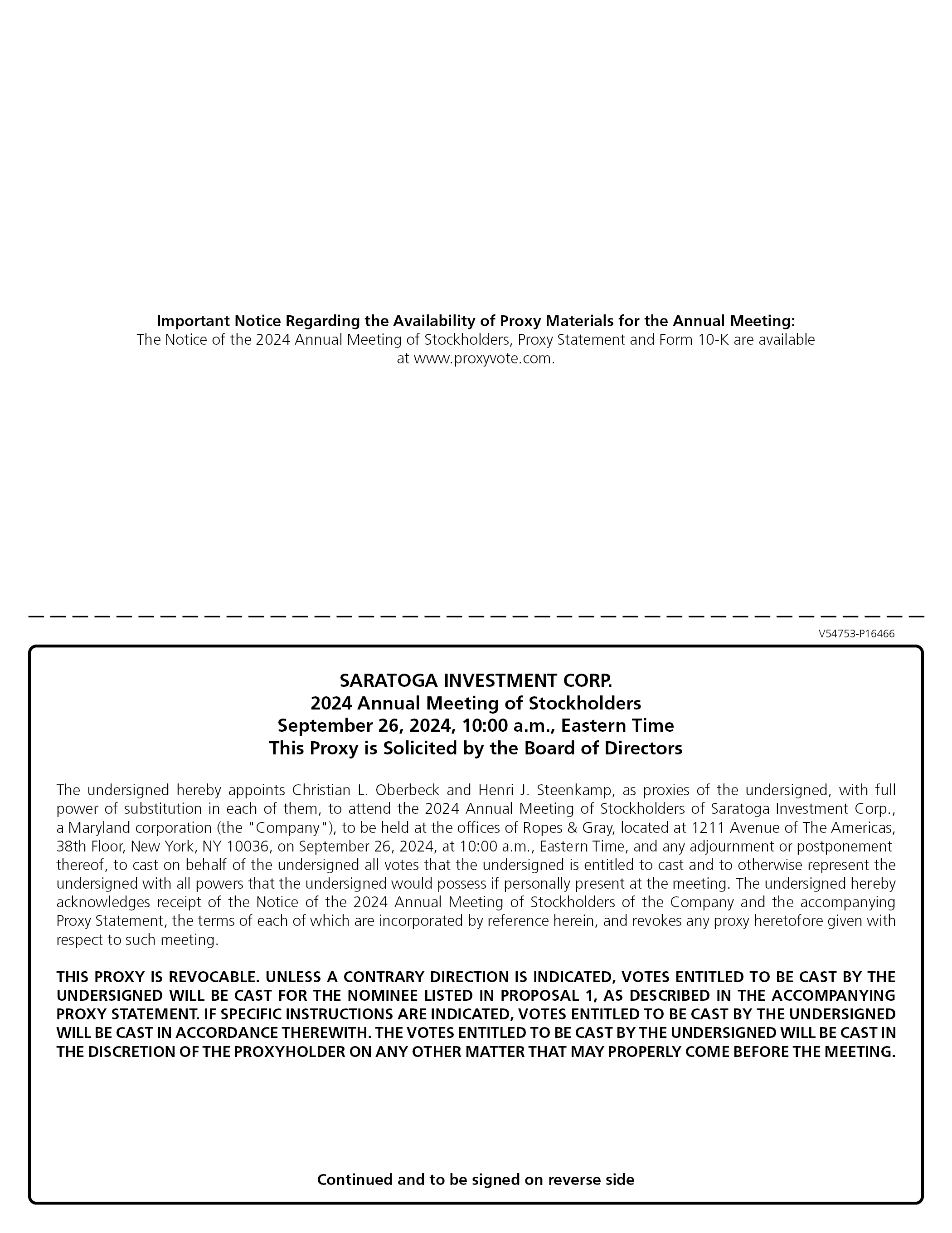 Important Notice Regarding the Availability of Proxy Materials for the Annual Meeting: The Notice of the 2024 Annual Meeting of Stockholders, Proxy Statement and Form 10-K are available at www.proxyvote.com. V54753-P16466 SARATOGA INVESTMENT CORP. 2024 Annual Meeting of Stockholders September 26, 2024, 10:00 a.m., Eastern Time This Proxy is Solicited by the Board of Directors The undersigned hereby appoints Christian L. Oberbeck and Henri J. Steenkamp, as proxies of the undersigned, with full power of substitution in each of them, to attend the 2024 Annual Meeting of Stockholders of Saratoga Investment Corp., a Maryland corporation (the “Company”), to be held at the offices of Ropes & Gray, located at 1211 Avenue of The Americas, 38th Floor, New York, NY 10036, on September 26, 2024, at 10:00 a.m., Eastern Time, and any adjournment or postponement thereof, to cast on behalf of the undersigned all votes that the undersigned is entitled to cast and to otherwise represent the undersigned with all powers that the undersigned would possess if personally present at the meeting. The undersigned hereby acknowledges receipt of the Notice of the 2024 Annual Meeting of Stockholders of the Company and the accompanying Proxy Statement, the terms of each of which are incorporated by reference herein, and revokes any proxy heretofore given with respect to such meeting. THIS PROXY IS REVOCABLE. UNLESS A CONTRARY DIRECTION IS INDICATED, VOTES ENTITLED TO BE CAST BY THE UNDERSIGNED WILL BE CAST FOR THE NOMINEE LISTED IN PROPOSAL 1, AS DESCRIBED IN THE ACCOMPANYING PROXY STATEMENT. IF SPECIFIC INSTRUCTIONS ARE INDICATED, VOTES ENTITLED TO BE CAST BY THE UNDERSIGNED WILL BE CAST IN ACCORDANCE THEREWITH. THE VOTES ENTITLED TO BE CAST BY THE UNDERSIGNED WILL BE CAST IN THE DISCRETION OF THE PROXYHOLDER ON ANY OTHER MATTER THAT MAY PROPERLY COME BEFORE THE MEETING. Continued and to be signed on reverse side