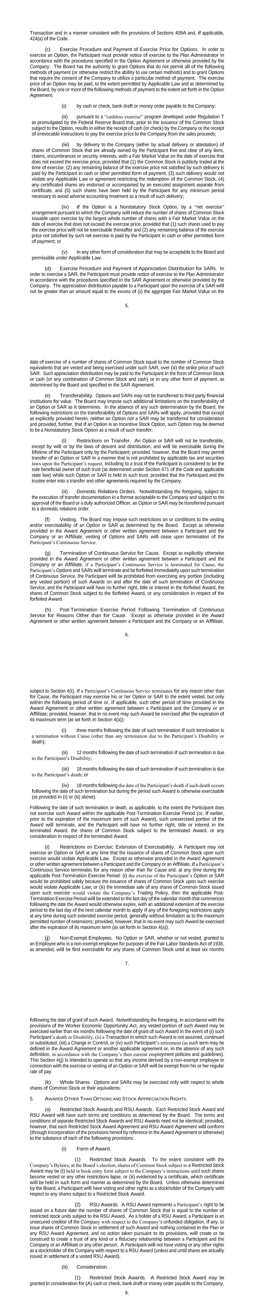 5. Transaction and in a manner consistent with the provisions of Sections 409A and, if applicable, 424(a) of the Code. (c) Exercise Procedure and Payment of Exercise Price for Options. In order to exercise an Option, the Participant must provide notice of exercise to the Plan Administrator in accordance with the procedures specified in the Option Agreement or otherwise provided by the Company. The Board has the authority to grant Options that do not permit all of the following methods of payment (or otherwise restrict the ability to use certain methods) and to grant Options that require the consent of the Company to utilize a particular method of payment. The exercise price of an Option may be paid, to the extent permitted by Applicable Law and as determined by the Board, by one or more of the following methods of payment to the extent set forth in the Option Agreement: (i) by cash or check, bank draft or money order payable to the Company; (ii) pursuant to a “cashless exercise” program developed under Regulation T as promulgated by the Federal Reserve Board that, prior to the issuance of the Common Stock subject to the Option, results in either the receipt of cash (or check) by the Company or the receipt of irrevocable instructions to pay the exercise price to the Company from the sales proceeds; (iii) by delivery to the Company (either by actual delivery or attestation) of shares of Common Stock that are already owned by the Participant free and clear of any liens, claims, encumbrances or security interests, with a Fair Market Value on the date of exercise that does not exceed the exercise price, provided that (1) the Common Stock is publicly traded at the time of exercise, (2) any remaining balance of the exercise price not satisfied by such delivery is paid by the Participant in cash or other permitted form of payment, (3) such delivery would not violate any Applicable Law or agreement restricting the redemption of the Common Stock, (4) any certificated shares are endorsed or accompanied by an executed assignment separate from certificate, and (5) such shares have been held by the Participant for any minimum period necessary to avoid adverse accounting treatment as a result of such delivery; (iv) if the Option is a Nonstatutory Stock Option, by a “net exercise” arrangement pursuant to which the Company will reduce the number of shares of Common Stock issuable upon exercise by the largest whole number of shares with a Fair Market Value on the date of exercise that does not exceed the exercise price, provided that (1) such shares used to pay the exercise price will not be exercisable thereafter and (2) any remaining balance of the exercise price not satisfied by such net exercise is paid by the Participant in cash or other permitted form of payment; or (v) in any other form of consideration that may be acceptable to the Board and permissible under Applicable Law. (d) Exercise Procedure and Payment of Appreciation Distribution for SARs. In order to exercise a SAR, the Participant must provide notice of exercise to the Plan Administrator in accordance with the procedures specified in the SAR Agreement or otherwise provided by the Company. The appreciation distribution payable to a Participant upon the exercise of a SAR will not be greater than an amount equal to the excess of (i) the aggregate Fair Market Value on the 6. date of exercise of a number of shares of Common Stock equal to the number of Common Stock equivalents that are vested and being exercised under such SAR, over (ii) the strike price of such SAR. Such appreciation distribution may be paid to the Participant in the form of Common Stock or cash (or any combination of Common Stock and cash) or in any other form of payment, as determined by the Board and specified in the SAR Agreement. (e) Transferability. Options and SARs may not be transferred to third party financial institutions for value. The Board may impose such additional limitations on the transferability of an Option or SAR as it determines. In the absence of any such determination by the Board, the following restrictions on the transferability of Options and SARs will apply, provided that except as explicitly provided herein, neither an Option nor a SAR may be transferred for consideration and provided, further, that if an Option is an Incentive Stock Option, such Option may be deemed to be a Nonstatutory Stock Option as a result of such transfer: (i) Restrictions on Transfer. An Option or SAR will not be transferable, except by will or by the laws of descent and distribution, and will be exercisable during the lifetime of the Participant only by the Participant; provided, however, that the Board may permit transfer of an Option or SAR in a manner that is not prohibited by applicable tax and securities laws upon the Participant’s request, including to a trust if the Participant is considered to be the sole beneficial owner of such trust (as determined under Section 671 of the Code and applicable state law) while such Option or SAR is held in such trust, provided that the Participant and the trustee enter into a transfer and other agreements required by the Company. (ii) Domestic Relations Orders. Notwithstanding the foregoing, subject to the execution of transfer documentation in a format acceptable to the Company and subject to the approval of the Board or a duly authorized Officer, an Option or SAR may be transferred pursuant to a domestic relations order. (f) Vesting. The Board may impose such restrictions on or conditions to the vesting and/or exercisability of an Option or SAR as determined by the Board. Except as otherwise provided in the Award Agreement or other written agreement between a Participant and the Company or an Affiliate, vesting of Options and SARs will cease upon termination of the Participant’s Continuous Service. (g) Termination of Continuous Service for Cause. Except as explicitly otherwise provided in the Award Agreement or othe