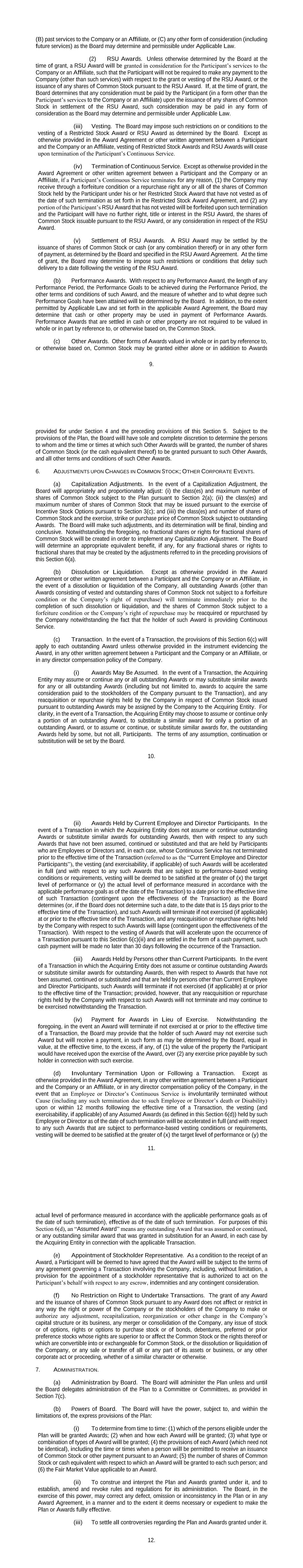 9. (B) past services to the Company or an Affiliate, or (C) any other form of consideration (including future services) as the Board may determine and permissible under Applicable Law. (2) RSU Awards. Unless otherwise determined by the Board at the time of grant, a RSU Award will be granted in consideration for the Participant’s services to the Company or an Affiliate, such that the Participant will not be required to make any payment to the Company (other than such services) with respect to the grant or vesting of the RSU Award, or the issuance of any shares of Common Stock pursuant to the RSU Award. If, at the time of grant, the Board determines that any consideration must be paid by the Participant (in a form other than the Participant’s services to the Company or an Affiliate) upon the issuance of any shares of Common Stock in settlement of the RSU Award, such consideration may be paid in any form of consideration as the Board may determine and permissible under Applicable Law. (iii) Vesting. The Board may impose such restrictions on or conditions to the vesting of a Restricted Stock Award or RSU Award as determined by the Board. Except as otherwise provided in the Award Agreement or other written agreement between a Participant and the Company or an Affiliate, vesting of Restricted Stock Awards and RSU Awards will cease upon termination of the Participant’s Continuous Service. (iv) Termination of Continuous Service. Except as otherwise provided in the Award Agreement or other written agreement between a Participant and the Company or an Affiliate, if a Participant’s Continuous Service terminates for any reason, (1) the Company may receive through a forfeiture condition or a repurchase right any or all of the shares of Common Stock held by the Participant under his or her Restricted Stock Award that have not vested as of the date of such termination as set forth in the Restricted Stock Award Agreement, and (2) any portion of the Participant’s RSU Award that has not vested will be forfeited upon such termination and the Participant will have no further right, title or interest in the RSU Award, the shares of Common Stock issuable pursuant to the RSU Award, or any consideration in respect of the RSU Award. (v) Settlement of RSU Awards. A RSU Award may be settled by the issuance of shares of Common Stock or cash (or any combination thereof) or in any other form of payment, as determined by the Board and specified in the RSU Award Agreement. At the time of grant, the Board may determine to impose such restrictions or conditions that delay such delivery to a date following the vesting of the RSU Award. (b) Performance Awards. With respect to any Performance Award, the length of any Performance Period, the Performance Goals to be achieved during the Performance Period, the other terms and conditions of such Award, and the measure of whether and to what degree such Performance Goals have been attained will be determined by the Board. In addition, to the extent permitted by Applicable Law and set forth in the applicable Award Agreement, the Board may determine that cash or other property may be used in payment of Performance Awards. Performance Awards that are settled in cash or other property are not required to be valued in whole or in part by reference to, or otherwise based on, the Common Stock. (c) Other Awards. Other forms of Awards valued in whole or in part by reference to, or otherwise based on, Common Stock may be granted either alone or in addition to Awards 10. provided for under Section 4 and the preceding provisions of this Section 5. Subject to the provisions of the Plan, the Board will have sole and complete discretion to determine the persons to whom and the time or times at which such Other Awards will be granted, the number of shares of Common Stock (or the cash equivalent thereof) to be granted pursuant to such Other Awards, and all other terms and conditions of such Other Awards. 6. ADJUSTMENTS UPON CHANGES IN COMMON STOCK; OTHER CORPORATE EVENTS. (a) Capitalization Adjustments. In the event of a Capitalization Adjustment, the Board will appropriately and proportionately adjust: (i) the class(es) and maximum number of shares of Common Stock subject to the Plan pursuant to Section 2(a); (ii) the class(es) and maximum number of shares of Common Stock that may be issued pursuant to the exercise of Incentive Stock Options pursuant to Section 3(c); and (iii) the class(es) and number of shares of Common Stock and the exercise, strike or purchase price of Common Stock subject to outstanding Awards. The Board will make such adjustments, and its determination will be final, binding and conclusive. Notwithstanding the foregoing, no fractional shares or rights for fractional shares of Common Stock will be created in order to implement any Capitalization Adjustment. The Board will determine an appropriate equivalent benefit, if any, for any fractional shares or rights to fractional shares that may be created by the adjustments referred to in the preceding provisions of this Section 6(a). (b) Dissolution or Liquidation. Except as otherwise provided in the Award Agreement or other written agreement between a Participant and the Company or an Affiliate, in the event of a dissolution or liquidation of the Company, all outstanding Awards (other than Awards consisting of vested and outstanding shares of Common Stock not subject to a forfeiture condition or the Company’s right of repurchase) will terminate immediately prior to the completion of such dissolution or liquidation, and the shares of Common Stock subject to a forfeiture condition or the Company’s right of repurchase may be reacquired or repurchased by the Company notwithstanding the fact that the holder of such Award is providing Continuous Service. (c) Transaction. In the event of a Transaction, the provisions of this Section 6(c) will apply to each outstanding Award unless otherwise provided in the instrument evi