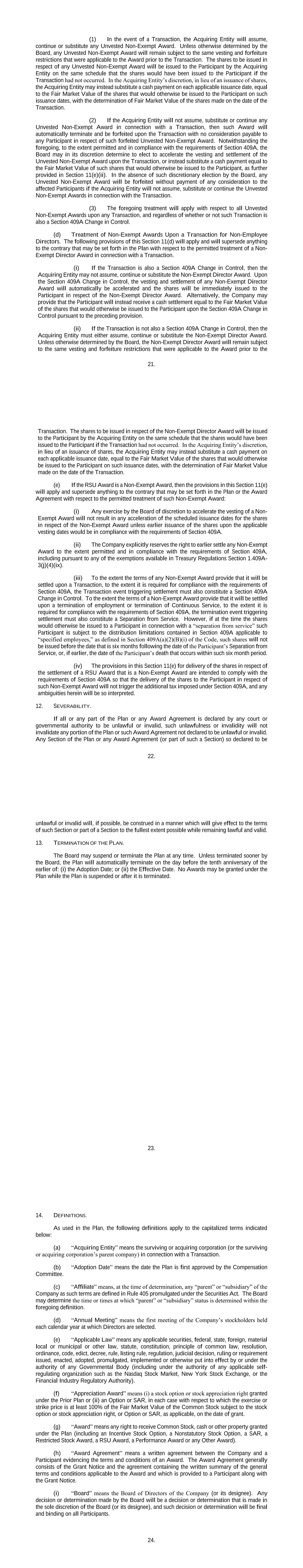 21. (1) In the event of a Transaction, the Acquiring Entity will assume, continue or substitute any Unvested Non-Exempt Award. Unless otherwise determined by the Board, any Unvested Non-Exempt Award will remain subject to the same vesting and forfeiture restrictions that were applicable to the Award prior to the Transaction. The shares to be issued in respect of any Unvested Non-Exempt Award will be issued to the Participant by the Acquiring Entity on the same schedule that the shares would have been issued to the Participant if the Transaction had not occurred. In the Acquiring Entity’s discretion, in lieu of an issuance of shares, the Acquiring Entity may instead substitute a cash payment on each applicable issuance date, equal to the Fair Market Value of the shares that would otherwise be issued to the Participant on such issuance dates, with the determination of Fair Market Value of the shares made on the date of the Transaction. (2) If the Acquiring Entity will not assume, substitute or continue any Unvested Non-Exempt Award in connection with a Transaction, then such Award will automatically terminate and be forfeited upon the Transaction with no consideration payable to any Participant in respect of such forfeited Unvested Non-Exempt Award. Notwithstanding the foregoing, to the extent permitted and in compliance with the requirements of Section 409A, the Board may in its discretion determine to elect to accelerate the vesting and settlement of the Unvested Non-Exempt Award upon the Transaction, or instead substitute a cash payment equal to the Fair Market Value of such shares that would otherwise be issued to the Participant, as further provided in Section 11(e)(ii). In the absence of such discretionary election by the Board, any Unvested Non-Exempt Award will be forfeited without payment of any consideration to the affected Participants if the Acquiring Entity will not assume, substitute or continue the Unvested Non-Exempt Awards in connection with the Transaction. (3) The foregoing treatment will apply with respect to all Unvested Non-Exempt Awards upon any Transaction, and regardless of whether or not such Transaction is also a Section 409A Change in Control. (d) Treatment of Non-Exempt Awards Upon a Transaction for Non-Employee Directors. The following provisions of this Section 11(d) will apply and will supersede anything to the contrary that may be set forth in the Plan with respect to the permitted treatment of a Non- Exempt Director Award in connection with a Transaction. (i) If the Transaction is also a Section 409A Change in Control, then the Acquiring Entity may not assume, continue or substitute the Non-Exempt Director Award. Upon the Section 409A Change in Control, the vesting and settlement of any Non-Exempt Director Award will automatically be accelerated and the shares will be immediately issued to the Participant in respect of the Non-Exempt Director Award. Alternatively, the Company may provide that the Participant will instead receive a cash settlement equal to the Fair Market Value of the shares that would otherwise be issued to the Participant upon the Section 409A Change in Control pursuant to the preceding provision. (ii) If the Transaction is not also a Section 409A Change in Control, then the Acquiring Entity must either assume, continue or substitute the Non-Exempt Director Award. Unless otherwise determined by the Board, the Non-Exempt Director Award will remain subject to the same vesting and forfeiture restrictions that were applicable to the Award prior to the 22. Transaction. The shares to be issued in respect of the Non-Exempt Director Award will be issued to the Participant by the Acquiring Entity on the same schedule that the shares would have been issued to the Participant if the Transaction had not occurred. In the Acquiring Entity’s discretion, in lieu of an issuance of shares, the Acquiring Entity may instead substitute a cash payment on each applicable issuance date, equal to the Fair Market Value of the shares that would otherwise be issued to the Participant on such issuance dates, with the determination of Fair Market Value made on the date of the Transaction. (e) If the RSU Award is a Non-Exempt Award, then the provisions in this Section 11(e) will apply and supersede anything to the contrary that may be set forth in the Plan or the Award Agreement with respect to the permitted treatment of such Non-Exempt Award: (i) Any exercise by the Board of discretion to accelerate the vesting of a Non- Exempt Award will not result in any acceleration of the scheduled issuance dates for the shares in respect of the Non-Exempt Award unless earlier issuance of the shares upon the applicable vesting dates would be in compliance with the requirements of Section 409A. (ii) The Company explicitly reserves the right to earlier settle any Non-Exempt Award to the extent permitted and in compliance with the requirements of Section 409A, including pursuant to any of the exemptions available in Treasury Regulations Section 1.409A- 3(j)(4)(ix). (iii) To the extent the terms of any Non-Exempt Award provide that it will be settled upon a Transaction, to the extent it is required for compliance with the requirements of Section 409A, the Transaction event triggering settlement must also constitute a Section 409A Change in Control. To the extent the terms of a Non-Exempt Award provide that it will be settled upon a termination of employment or termination of Continuous Service, to the extent it is required for compliance with the requirements of Section 409A, the termination event triggering settlement must also constitute a Separation from Service. However, if at the time the shares would otherwise be issued to a Participant in connection with a “separation from service” such Participant is subject to the distribution limitations contained in Section 409A applicable to “specified employees,” as defined in Section 409A(a)(2)(B)(i) of the Code, such shares 