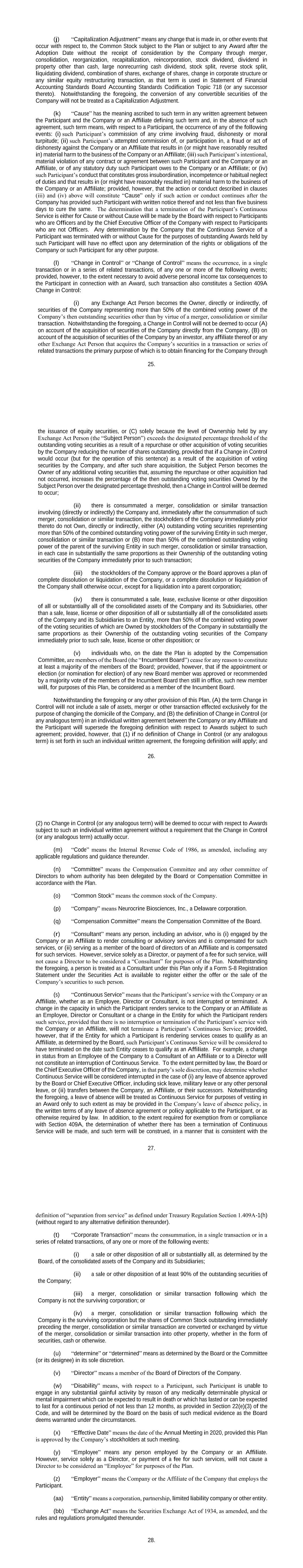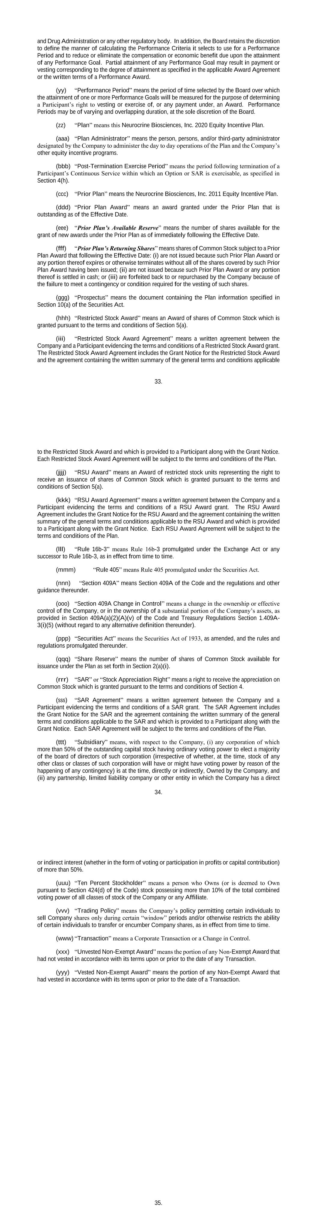 33. and Drug Administration or any other regulatory body. In addition, the Board retains the discretion to define the manner of calculating the Performance Criteria it selects to use for a Performance Period and to reduce or eliminate the compensation or economic benefit due upon the attainment of any Performance Goal. Partial attainment of any Performance Goal may result in payment or vesting corresponding to the degree of attainment as specified in the applicable Award Agreement or the written terms of a Performance Award. (yy) “Performance Period” means the period of time selected by the Board over which the attainment of one or more Performance Goals will be measured for the purpose of determining a Participant’s right to vesting or exercise of, or any payment under, an Award. Performance Periods may be of varying and overlapping duration, at the sole discretion of the Board. (zz) “Plan” means this Neurocrine Biosciences, Inc. 2020 Equity Incentive Plan. (aaa) “Plan Administrator” means the person, persons, and/or third-party administrator designated by the Company to administer the day to day operations of the Plan and the Company’s other equity incentive programs. (bbb) “Post-Termination Exercise Period” means the period following termination of a Participant’s Continuous Service within which an Option or SAR is exercisable, as specified in Section 4(h). (ccc) “Prior Plan” means the Neurocrine Biosciences, Inc. 2011 Equity Incentive Plan. (ddd) “Prior Plan Award” means an award granted under the Prior Plan that is outstanding as of the Effective Date. (eee) “Prior Plan’s Available Reserve” means the number of shares available for the grant of new awards under the Prior Plan as of immediately following the Effective Date. (fff) “Prior Plan’s Returning Shares” means shares of Common Stock subject to a Prior Plan Award that following the Effective Date: (i) are not issued because such Prior Plan Award or any portion thereof expires or otherwise terminates without all of the shares covered by such Prior Plan Award having been issued; (ii) are not issued because such Prior Plan Award or any portion thereof is settled in cash; or (iii) are forfeited back to or repurchased by the Company because of the failure to meet a contingency or condition required for the vesting of such shares. (ggg) “Prospectus” means the document containing the Plan information specified in Section 10(a) of the Securities Act. (hhh) “Restricted Stock Award” means an Award of shares of Common Stock which is granted pursuant to the terms and conditions of Section 5(a). (iii) “Restricted Stock Award Agreement” means a written agreement between the Company and a Participant evidencing the terms and conditions of a Restricted Stock Award grant. The Restricted Stock Award Agreement includes the Grant Notice for the Restricted Stock Award and the agreement containing the written summary of the general terms and conditions applicable 34. to the Restricted Stock Award and which is provided to a Participant along with the Grant Notice. Each Restricted Stock Award Agreement will be subject to the terms and conditions of the Plan. (jjj) “RSU Award” means an Award of restricted stock units representing the right to receive an issuance of shares of Common Stock which is granted pursuant to the terms and conditions of Section 5(a). (kkk) “RSU Award Agreement” means a written agreement between the Company and a Participant evidencing the terms and conditions of a RSU Award grant. The RSU Award Agreement includes the Grant Notice for the RSU Award and the agreement containing the written summary of the general terms and conditions applicable to the RSU Award and which is provided to a Participant along with the Grant Notice. Each RSU Award Agreement will be subject to the terms and conditions of the Plan. (lll) “Rule 16b-3” means Rule 16b-3 promulgated under the Exchange Act or any successor to Rule 16b-3, as in effect from time to time. (mmm) “Rule 405” means Rule 405 promulgated under the Securities Act. (nnn) “Section 409A” means Section 409A of the Code and the regulations and other guidance thereunder. (ooo) “Section 409A Change in Control” means a change in the ownership or effective control of the Company, or in the ownership of a substantial portion of the Company’s assets, as provided in Section 409A(a)(2)(A)(v) of the Code and Treasury Regulations Section 1.409A- 3(i)(5) (without regard to any alternative definition thereunder). (ppp) “Securities Act” means the Securities Act of 1933, as amended, and the rules and regulations promulgated thereunder. (qqq) “Share Reserve” means the number of shares of Common Stock available for issuance under the Plan as set forth in Section 2(a)(i). (rrr) “SAR” or “Stock Appreciation Right” means a right to receive the appreciation on Common Stock which is granted pursuant to the terms and conditions of Section 4. (sss) “SAR Agreement” means a written agreement between the Company and a Participant evidencing the terms and conditions of a SAR grant. The SAR Agreement includes the Grant Notice for the SAR and the agreement containing the written summary of the general terms and conditions applicable to the SAR and which is provided to a Participant along with the Grant Notice. Each SAR Agreement will be subject to the terms and conditions of the Plan. (ttt) “Subsidiary” means, with respect to the Company, (i) any corporation of which more than 50% of the outstanding capital stock having ordinary voting power to elect a majority of the board of directors of such corporation (irrespective of whether, at the time, stock of any other class or classes of such corporation will have or might have voting power by reason of the happening of any contingency) is at the time, directly or indirectly, Owned by the Company, and (ii) any partnership, limited liability company or other entity in which 