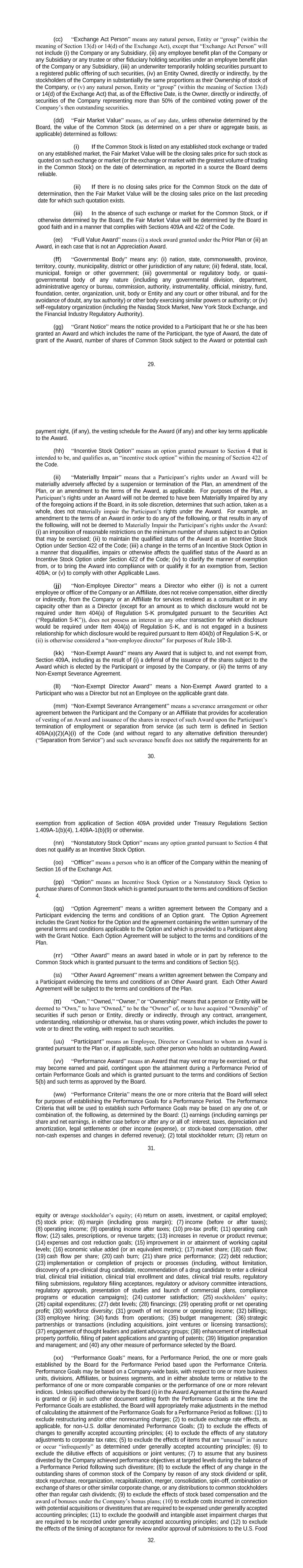 29. (cc) “Exchange Act Person” means any natural person, Entity or “group” (within the meaning of Section 13(d) or 14(d) of the Exchange Act), except that “Exchange Act Person” will not include (i) the Company or any Subsidiary, (ii) any employee benefit plan of the Company or any Subsidiary or any trustee or other fiduciary holding securities under an employee benefit plan of the Company or any Subsidiary, (iii) an underwriter temporarily holding securities pursuant to a registered public offering of such securities, (iv) an Entity Owned, directly or indirectly, by the stockholders of the Company in substantially the same proportions as their Ownership of stock of the Company, or (v) any natural person, Entity or “group” (within the meaning of Section 13(d) or 14(d) of the Exchange Act) that, as of the Effective Date, is the Owner, directly or indirectly, of securities of the Company representing more than 50% of the combined voting power of the Company’s then outstanding securities. (dd) “Fair Market Value” means, as of any date, unless otherwise determined by the Board, the value of the Common Stock (as determined on a per share or aggregate basis, as applicable) determined as follows: (i) If the Common Stock is listed on any established stock exchange or traded on any established market, the Fair Market Value will be the closing sales price for such stock as quoted on such exchange or market (or the exchange or market with the greatest volume of trading in the Common Stock) on the date of determination, as reported in a source the Board deems reliable. (ii) If there is no closing sales price for the Common Stock on the date of determination, then the Fair Market Value will be the closing sales price on the last preceding date for which such quotation exists. (iii) In the absence of such exchange or market for the Common Stock, or if otherwise determined by the Board, the Fair Market Value will be determined by the Board in good faith and in a manner that complies with Sections 409A and 422 of the Code. (ee) “Full Value Award” means (i) a stock award granted under the Prior Plan or (ii) an Award, in each case that is not an Appreciation Award. (ff) “Governmental Body” means any: (i) nation, state, commonwealth, province, territory, county, municipality, district or other jurisdiction of any nature; (ii) federal, state, local, municipal, foreign or other government; (iii) governmental or regulatory body, or quasi- governmental body of any nature (including any governmental division, department, administrative agency or bureau, commission, authority, instrumentality, official, ministry, fund, foundation, center, organization, unit, body or Entity and any court or other tribunal, and for the avoidance of doubt, any tax authority) or other body exercising similar powers or authority; or (iv) self-regulatory organization (including the Nasdaq Stock Market, New York Stock Exchange, and the Financial Industry Regulatory Authority). (gg) “Grant Notice” means the notice provided to a Participant that he or she has been granted an Award and which includes the name of the Participant, the type of Award, the date of grant of the Award, number of shares of Common Stock subject to the Award or potential cash 30. payment right, (if any), the vesting schedule for the Award (if any) and other key terms applicable to the Award. (hh) “Incentive Stock Option” means an option granted pursuant to Section 4 that is intended to be, and qualifies as, an “incentive stock option” within the meaning of Section 422 of the Code. (ii) “Materially Impair” means that a Participant’s rights under an Award will be materially adversely affected by a suspension or termination of the Plan, an amendment of the Plan, or an amendment to the terms of the Award, as applicable. For purposes of the Plan, a Participant’s rights under an Award will not be deemed to have been Materially Impaired by any of the foregoing actions if the Board, in its sole discretion, determines that such action, taken as a whole, does not materially impair the Participant’s rights under the Award. For example, an amendment to the terms of an Award in order to do any of the following, or that results in any of the following, will not be deemed to Materially Impair the Participant’s rights under the Award: (i) an imposition of reasonable restrictions on the minimum number of shares subject to an Option that may be exercised; (ii) to maintain the qualified status of the Award as an Incentive Stock Option under Section 422 of the Code; (iii) a change in the terms of an Incentive Stock Option in a manner that disqualifies, impairs or otherwise affects the qualified status of the Award as an Incentive Stock Option under Section 422 of the Code; (iv) to clarify the manner of exemption from, or to bring the Award into compliance with or qualify it for an exemption from, Section 409A; or (v) to comply with other Applicable Laws. (jj) “Non-Employee Director” means a Director who either (i) is not a current employee or officer of the Company or an Affiliate, does not receive compensation, either directly or indirectly, from the Company or an Affiliate for services rendered as a consultant or in any capacity other than as a Director (except for an amount as to which disclosure would not be required under Item 404(a) of Regulation S-K promulgated pursuant to the Securities Act (“Regulation S-K”)), does not possess an interest in any other transaction for which disclosure would be required under Item 404(a) of Regulation S-K, and is not engaged in a business relationship for which disclosure would be required pursuant to Item 404(b) of Regulation S-K, or (ii) is otherwise considered a “non-employee director” for purposes of Rule 16b-3. (kk) “Non-Exempt Award” means any Award that is subject to, and not exempt from, Section 409A, including as the result of (i) a deferral of the issuance of the sha
