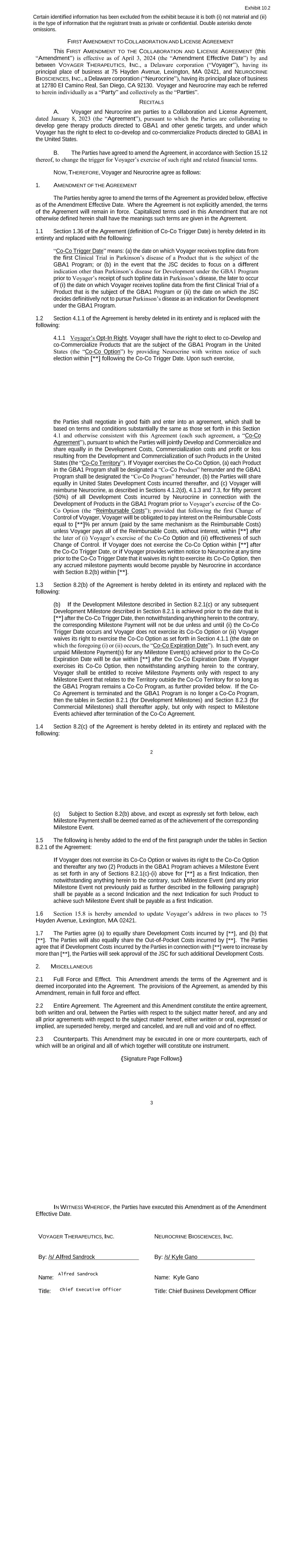 Exhibit 10.2 Certain identified information has been excluded from the exhibit because it is both (i) not material and (ii) is the type of information that the registrant treats as private or confidential. Double asterisks denote omissions. FIRST AMENDMENT TO COLLABORATION AND LICENSE AGREEMENT This FIRST AMENDMENT TO THE COLLABORATION AND LICENSE AGREEMENT (this “Amendment”) is effective as of April 3, 2024 (the “Amendment Effective Date”) by and between VOYAGER THERAPEUTICS, INC., a Delaware corporation (“Voyager”), having its principal place of business at 75 Hayden Avenue, Lexington, MA 02421, and NEUROCRINE BIOSCIENCES, INC., a Delaware corporation (“Neurocrine”), having its principal place of business at 12780 El Camino Real, San Diego, CA 92130. Voyager and Neurocrine may each be referred to herein individually as a “Party” and collectively as the “Parties”. RECITALS A. Voyager and Neurocrine are parties to a Collaboration and License Agreement, dated January 8, 2023 (the “Agreement”), pursuant to which the Parties are collaborating to develop gene therapy products directed to GBA1 and other genetic targets, and under which Voyager has the right to elect to co-develop and co-commercialize Products directed to GBA1 in the United States. B. The Parties have agreed to amend the Agreement, in accordance with Section 15.12 thereof, to change the trigger for Voyager’s exercise of such right and related financial terms. NOW, THEREFORE, Voyager and Neurocrine agree as follows: 1. AMENDMENT OF THE AGREEMENT The Parties hereby agree to amend the terms of the Agreement as provided below, effective as of the Amendment Effective Date. Where the Agreement is not explicitly amended, the terms of the Agreement will remain in force. Capitalized terms used in this Amendment that are not otherwise defined herein shall have the meanings such terms are given in the Agreement. 1.1 Section 1.36 of the Agreement (definition of Co-Co Trigger Date) is hereby deleted in its entirety and replaced with the following: “Co-Co Trigger Date” means: (a) the date on which Voyager receives topline data from the first Clinical Trial in Parkinson’s disease of a Product that is the subject of the GBA1 Program; or (b) in the event that the JSC decides to focus on a different indication other than Parkinson’s disease for Development under the GBA1 Program prior to Voyager’s receipt of such topline data in Parkinson’s disease, the later to occur of (i) the date on which Voyager receives topline data from the first Clinical Trial of a Product that is the subject of the GBA1 Program or (ii) the date on which the JSC decides definitively not to pursue Parkinson’s disease as an indication for Development under the GBA1 Program. 1.2 Section 4.1.1 of the Agreement is hereby deleted in its entirety and is replaced with the following: 4.1.1 Voyager’s Opt-In Right. Voyager shall have the right to elect to co-Develop and co-Commercialize Products that are the subject of the GBA1 Program in the United States (the “Co-Co Option”) by providing Neurocrine with written notice of such election within [**] following the Co-Co Trigger Date. Upon such exercise, DocuSign Envelope ID: 86B04D58-D0B4-45F3-A047-FD40A4CAB790 2 the Parties shall negotiate in good faith and enter into an agreement, which shall be based on terms and conditions substantially the same as those set forth in this Section 4.1 and otherwise consistent with this Agreement (each such agreement, a “Co-Co Agreement”), pursuant to which the Parties will jointly Develop and Commercialize and share equally in the Development Costs, Commercialization costs and profit or loss resulting from the Development and Commercialization of such Products in the United States (the “Co-Co Territory”). If Voyager exercises the Co-Co Option, (a) each Product in the GBA1 Program shall be designated a “Co-Co Product” hereunder and the GBA1 Program shall be designated the “Co-Co Program” hereunder, (b) the Parties will share equally in United States Development Costs incurred thereafter, and (c) Voyager will reimburse Neurocrine, as described in Sections 4.1.2(d), 4.1.3 and 7.3, for fifty percent (50%) of all Development Costs incurred by Neurocrine in connection with the Development of Products in the GBA1 Program prior to Voyager’s exercise of the Co- Co Option (the “Reimbursable Costs”); provided that following the first Change of Control of Voyager, Voyager will be obligated to pay interest on the Reimbursable Costs equal to [**]% per annum (paid by the same mechanism as the Reimbursable Costs) unless Voyager pays all of the Reimbursable Costs, without interest, within [**] after the later of (i) Voyager’s exercise of the Co-Co Option and (ii) effectiveness of such Change of Control. If Voyager does not exercise the Co-Co Option within [**] after the Co-Co Trigger Date, or if Voyager provides written notice to Neurocrine at any time prior to the Co-Co Trigger Date that it waives its right to exercise its Co-Co Option, then any accrued milestone payments would become payable by Neurocrine in accordance with Section 8.2(b) within [**]. 1.3 Section 8.2(b) of the Agreement is hereby deleted in its entirety and replaced with the following: (b) If the Development Milestone described in Section 8.2.1(c) or any subsequent Development Milestone described in Section 8.2.1 is achieved prior to the date that is [**] after the Co-Co Trigger Date, then notwithstanding anything herein to the contrary, the corresponding Milestone Payment will not be due unless and until (i) the Co-Co Trigger Date occurs and Voyager does not exercise its Co-Co Option or (ii) Voyager waives its right to exercise the Co-Co Option as set forth in Section 4.1.1 (the date on which the foregoing (i) or (ii) occurs, the “Co-Co Expiration Date”). In such event, any unpaid Milestone Payment(s) for any Milestone Event(s) achieved prior to the Co-Co Expiration 